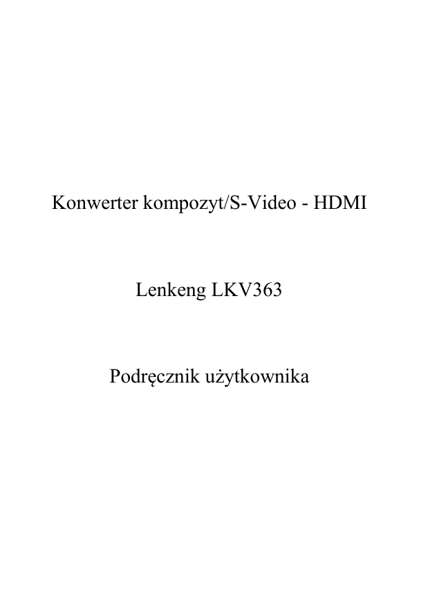 Konwerter kompozyt/S-Video - HDMI Lenkeng LKV363 Podręcznik użytkownika Dziękujemy za zakup tego produktu. Przed użyciem proszę uważnie przeczytać poniższą instrukcję. 1. Wstęp Konwerter LKV363 konwertuje sygnały kompozytowe oraz SVideo na HDMI 720p lub1080p. Pozwala to zintegrować starsze urządzenia analogowe do domowego systemu HD. 2. Specyfikacja − − − − − − − Wejścia : kompozyt (RCA), S-Video Rozdzielczości wyjściowe HDMI : 720p/60Hz, 1080p/60Hz Automatyczna detekcja i regulacja systemu wejściowego PAL/NTSC Wybór wejściowego sygnału za pomocą przycisku Ustawienia sygnału wejściowego oraz rozdzielczości wyjściowej są zapamiętywane w pamięci Wspólny sygnał wejściowy audio dla obu wejść wideo Zasilanie : DC 5V 3. Połączenie i praca − Podłącz sygnał źródłowy oraz odbiornik HDMI do konwertera. *Proszę się odnieść do rysunku obrazującego połączenia. − Podłącz zasilacz 5V DC do konwertera. Proszę się upewnić, że podłączany zasilacz ma napięcie nie większe niż 5V ponieważ może on uszkodzić urządzenie. *Uwaga: Aby ochronić konwerter i Twoje urządzenia, proszę nie podłączać zasilania konwertera dopóki urządzenia źródłowe i odbiorcze nie zostaną podłączone. Proszę podłączać i odłączać kabel HDMI delikatnie. 4. Interfejs 1. Wejście S-Video 2. Wejście kompozyt wideo oraz audio L/R 3. Gniazdo zasilania 4. Wskaźnik zasilania 5. Przycisk wyboru wejścia kompozytowego lub S-Video 6. Przycisk wyboru rozdzielczości wyjściowej 720P lub 1080P 7. Wyjście stereo audio 8. Wyjście HDMI 5. Zawartość opakowania Konwerter kompozyt/S-Video - HDMI 1 sztuka Zasilacz 1 sztuka Instrukcja użytkownika 1 sztuka 6. Często zadawane pytania 1) Konwerter zdaje się nie działać. Najpierw sprawdź czy zasilacz jest w dobrym stanie oraz czy jest dobrze podłączony. Następnie upewnij się, że wszystkie kable są w dobrym stanie oraz są dobrze podłączone. Spróbuj podłączyć urządzenia do konwertera za pomocą innych kabli. Upewnij się, że źródło sygnału oraz odbiornik są sprawne. 2) Dioda nie świeci Upewnij się, że korzystasz z zasilacza dostarczonego wraz z konwerterem. Zasilacz o większym napięciu może uszkodzić urządzenie. 7. Połączenie