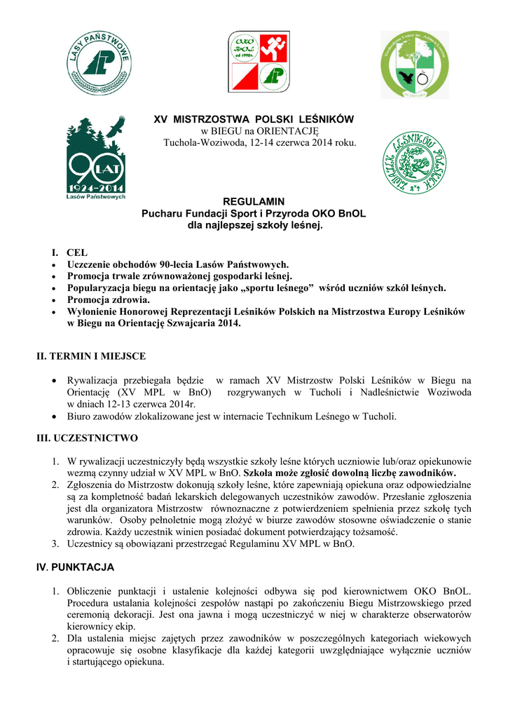 XV MISTRZOSTWA POLSKI LEŚNIKÓW w BIEGU na ORIENTACJĘ Tuchola-Woziwoda, 12-14 czerwca 2014 roku. REGULAMIN Pucharu Fundacji Sport i Przyroda OKO BnOL dla najlepszej szkoły leśnej. I. CEL Uczczenie obchodów 90-lecia Lasów Państwowych. Promocja trwale zrównoważonej gospodarki leśnej. Popularyzacja biegu na orientację jako „sportu leśnego” wśród uczniów szkół leśnych. Promocja zdrowia. Wyłonienie Honorowej Reprezentacji Leśników Polskich na Mistrzostwa Europy Leśników w Biegu na Orientację Szwajcaria 2014. II. TERMIN I MIEJSCE Rywalizacja przebiegała będzie w ramach XV Mistrzostw Polski Leśników w Biegu na Orientację (XV MPL w BnO) rozgrywanych w Tucholi i Nadleśnictwie Woziwoda w dniach 12-13 czerwca 2014r. Biuro zawodów zlokalizowane jest w internacie Technikum Leśnego w Tucholi. III. UCZESTNICTWO 1. W rywalizacji uczestniczyły będą wszystkie szkoły leśne których uczniowie lub/oraz opiekunowie wezmą czynny udział w XV MPL w BnO. Szkoła może zgłosić dowolną liczbę zawodników. 2. Zgłoszenia do Mistrzostw dokonują szkoły leśne, które zapewniają opiekuna oraz odpowiedzialne są za kompletność badań lekarskich delegowanych uczestników zawodów. Przesłanie zgłoszenia jest dla organizatora Mistrzostw równoznaczne z potwierdzeniem spełnienia przez szkołę tych warunków. Osoby pełnoletnie mogą złożyć w biurze zawodów stosowne oświadczenie o stanie zdrowia. Każdy uczestnik winien posiadać dokument potwierdzający tożsamość. 3. Uczestnicy są obowiązani przestrzegać Regulaminu XV MPL w BnO. IV. PUNKTACJA 1. Obliczenie punktacji i ustalenie kolejności odbywa się pod kierownictwem OKO BnOL. Procedura ustalania kolejności zespołów nastąpi po zakończeniu Biegu Mistrzowskiego przed ceremonią dekoracji. Jest ona jawna i mogą uczestniczyć w niej w charakterze obserwatorów kierownicy ekip. 2. Dla ustalenia miejsc zajętych przez zawodników w poszczególnych kategoriach wiekowych opracowuje się osobne klasyfikacje dla każdej kategorii uwzględniające wyłącznie uczniów i startującego opiekuna. 4. Do punktacji wlicza się kategorie: * w biegu parkowym KM, MM (młodzicy), KJ ,MJ (juniorzy) * w biegu Mistrzowskim K16, M16, K18,M 18, K20, M 20 5. Punkty dla drużyny może zdobywać jej opiekun (lub inna osoba z kadry pedagogicznej maksymalnie 1 osoba ze szkoły) w odpowiadającej sobie kategorii. Liczbę punktów zdobytych przez opiekuna dzieli się przez 2. 6. Do punktacji generalnej szkół brana jest suma punktów uzyskanych w 2 biegach ( Sprint i Bieg Mistrzowski) przez zgłoszoną drużynę. Bieg Mistrzowski premiowany jest podwójną ilością punktów. Zawodnik może wystartować w jednym lub w dwóch biegach. Jeden uczestnik może zdobyć maksymalnie w 2 biegach 50+100 = 150 pkt. Na punktację szkoły składa się suma punktów uzyskanych indywidualnie przez trzech najlepszych członków drużyny w każdym z biegów. 7. O kolejności miejsc szkół decydować będzie suma punktów uzyskanych przez zawodników po dwóch biegach. 8. W przypadku równej liczby punktów uzyskanych przez szkołę, o kolejności decyduje ilość wyższych miejsc zawodników w Biegu Mistrzowskim. Tabela punktowa. Miejsce w danej kategorii wiekowej Punktacja biegów Sprint Mistrzowski I 50 100 II 45 90 III 40 80 IV 35 70 V 30 60 VI 25 50 VII 20 40 VIII 15 30 IX 10 20 X i dalsze 5 10 V. NAGRODY Zwycięska szkoła otrzymuje PUCHAR, trzy najlepsze szkoły dyplomy. Najlepsi zawodnicy mają szansę zakwalifikowania się do Reprezentacji Leśników Polskich na Mistrzostwa Europy, które w br. odbędą się w Szwajcarii w dniach 28 lipca – 2 sierpnia 2014r. Skład Reprezentacji wyłoni OKO BnOL po zakończeniu Mistrzostw. Patronem Reprezentacji jest Związek Leśników Polskich w RP. Sprawy sporne, bądź nie ujęte w niniejszym Regulaminie, będą rozstrzygnięte przez OKO BnOL. Prezes Fundacji Sport i Przyroda OKO BnOL Włodzimierz Protasiewicz