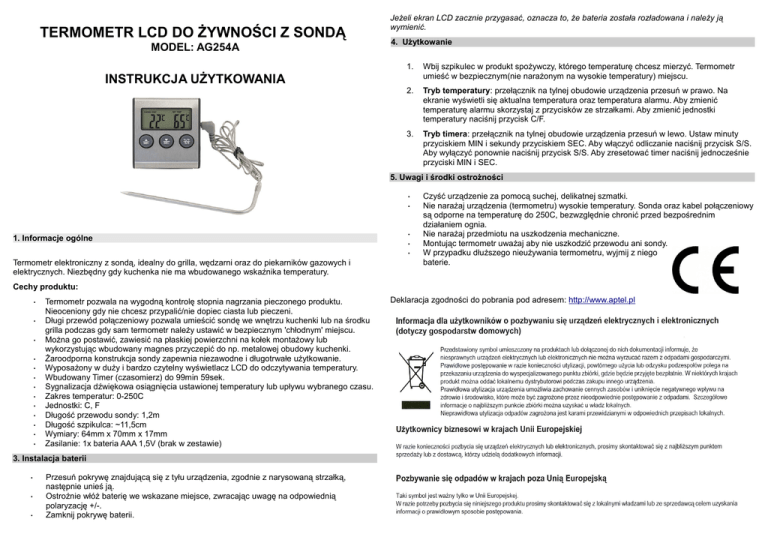 TERMOMETR LCD DO ŻYWNOŚCI Z SONDĄ MODEL: AG254A Jeżeli ekran LCD zacznie przygasać, oznacza to, że bateria została rozładowana i należy ją wymienić. 4. Użytkowanie 1. Wbij szpikulec w produkt spożywczy, którego temperaturę chcesz mierzyć. Termometr umieść w bezpiecznym(nie narażonym na wysokie temperatury) miejscu. 2. Tryb temperatury: przełącznik na tylnej obudowie urządzenia przesuń w prawo. Na ekranie wyświetli się aktualna temperatura oraz temperatura alarmu. Aby zmienić temperaturę alarmu skorzystaj z przycisków ze strzałkami. Aby zmienić jednostki temperatury naciśnij przycisk C/F. 3. Tryb timera: przełącznik na tylnej obudowie urządzenia przesuń w lewo. Ustaw minuty przyciskiem MIN i sekundy przyciskiem SEC. Aby włączyć odliczanie naciśnij przycisk S/S. Aby wyłączyć ponownie naciśnij przycisk S/S. Aby zresetować timer naciśnij jednocześnie przyciski MIN i SEC. INSTRUKCJA UŻYTKOWANIA 5. Uwagi i środki ostrożności • • 1. Informacje ogólne Termometr elektroniczny z sondą, idealny do grilla, wędzarni oraz do piekarników gazowych i elektrycznych. Niezbędny gdy kuchenka nie ma wbudowanego wskaźnika temperatury. • • • Czyść urządzenie za pomocą suchej, delikatnej szmatki. Nie narażaj urządzenia (termometru) wysokie temperatury. Sonda oraz kabel połączeniowy są odporne na temperaturę do 250C, bezwzględnie chronić przed bezpośrednim działaniem ognia. Nie narażaj przedmiotu na uszkodzenia mechaniczne. Montując termometr uważaj aby nie uszkodzić przewodu ani sondy. W przypadku dłuższego nieużywania termometru, wyjmij z niego baterie. Cechy produktu: • • • • • • • • • • • • • Termometr pozwala na wygodną kontrolę stopnia nagrzania pieczonego produktu. Nieoceniony gdy nie chcesz przypalić/nie dopiec ciasta lub pieczeni. Długi przewód połączeniowy pozwala umieścić sondę we wnętrzu kuchenki lub na środku grilla podczas gdy sam termometr należy ustawić w bezpiecznym 'chłodnym' miejscu. Można go postawić, zawiesić na płaskiej powierzchni na kołek montażowy lub wykorzystując wbudowany magnes przyczepić do np. metalowej obudowy kuchenki. Żaroodporna konstrukcja sondy zapewnia niezawodne i długotrwałe użytkowanie. Wyposażony w duży i bardzo czytelny wyświetlacz LCD do odczytywania temperatury. Wbudowany Timer (czasomierz) do 99min 59sek. Sygnalizacja dźwiękowa osiągnięcia ustawionej temperatury lub upływu wybranego czasu. Zakres temperatur: 0-250C Jednostki: C, F Długość przewodu sondy: 1,2m Długość szpikulca: ~11,5cm Wymiary: 64mm x 70mm x 17mm Zasilanie: 1x bateria AAA 1,5V (brak w zestawie) 3. Instalacja baterii • • • Przesuń pokrywę znajdującą się z tyłu urządzenia, zgodnie z narysowaną strzałką, następnie unieś ją. Ostrożnie włóż baterię we wskazane miejsce, zwracając uwagę na odpowiednią polaryzację +/-. Zamknij pokrywę baterii. Deklaracja zgodności do pobrania pod adresem: http://www.aptel.pl