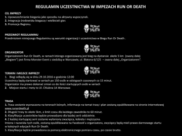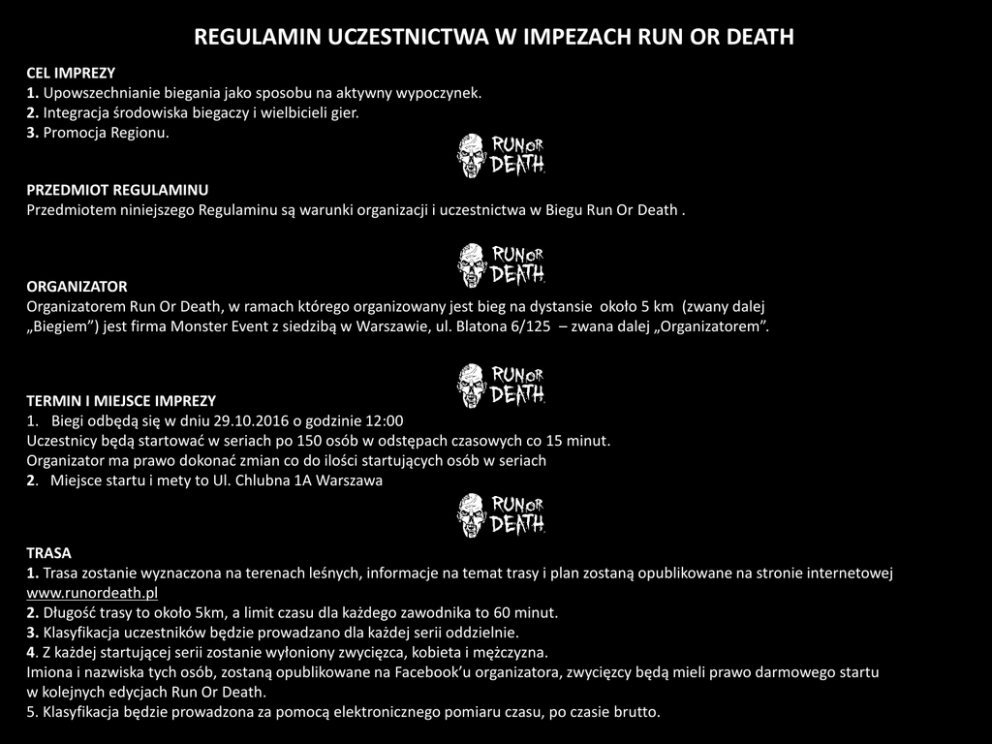 REGULAMIN UCZESTNICTWA W IMPEZACH RUN OR DEATH CEL IMPREZY 1. Upowszechnianie biegania jako sposobu na aktywny wypoczynek. 2. Integracja środowiska biegaczy i wielbicieli gier. 3. Promocja Regionu. PRZEDMIOT REGULAMINU Przedmiotem niniejszego Regulaminu są warunki organizacji i uczestnictwa w Biegu Run Or Death . ORGANIZATOR Organizatorem Run Or Death, w ramach którego organizowany jest bieg na dystansie około 5 km (zwany dalej „Biegiem”) jest firma Monster Event z siedzibą w Warszawie, ul. Blatona 6/125 – zwana dalej „Organizatorem”. TERMIN I MIEJSCE IMPREZY 1. Biegi odbędą się w dniu 29.10.2016 o godzinie 12:00 Uczestnicy będą startować w seriach po 150 osób w odstępach czasowych co 15 minut. Organizator ma prawo dokonać zmian co do ilości startujących osób w seriach 2. Miejsce startu i mety to Ul. Chlubna 1A Warszawa TRASA 1. Trasa zostanie wyznaczona na terenach leśnych, informacje na temat trasy i plan zostaną opublikowane na stronie internetowej www.runordeath.pl 2. Długość trasy to około 5km, a limit czasu dla każdego zawodnika to 60 minut. 3. Klasyfikacja uczestników będzie prowadzano dla każdej serii oddzielnie. 4. Z każdej startującej serii zostanie wyłoniony zwycięzca, kobieta i mężczyzna. Imiona i nazwiska tych osób, zostaną opublikowane na Facebook’u organizatora, zwycięzcy będą mieli prawo darmowego startu w kolejnych edycjach Run Or Death. 5. Klasyfikacja będzie prowadzona za pomocą elektronicznego pomiaru czasu, po czasie brutto. UCZESTNICTWO 1. Warunkiem uczestnictwa w biegu jest: Posiadanie własnego adresu mailowego/na jeden adres mailowy można zapisać tylko jedną osobę. Utworzenie konta w systemie zapisowym. Wypełnienie formularza zgłoszeniowego zamieszczonego na stronie internetowej Organizatora, www.runordeath.pl Wyrażenie zgody na przestrzeganie niniejszego regulaminu. Deklaracja udziału w biegu na własną odpowiedzialność. Wniesienie opłaty startowej w terminie 3 dni roboczych od dnia rejestracji. Wyrażenie zgody na przetwarzanie danych osobowych. 2. Aby wziąć udział w imprezie konieczne jest ukończenie 16 roku życia. 3. Warunkiem startu osób niepełnoletnich będzie dostarczenie pisemnej zgody opiekuna prawnego. PAKIETY STARTOWE 1. W całym biegu może wziąć udział maksymalnie 1500 osób. Liczbę pakietów ZOMBI organizator ustala na 175 osób. W każdej ze startujących serii nie może biec więcej niż 150 osób 2. Pakiet uczestnika obejmuje: - zwrotny pas oraz 4 szarfy, symbolizujące Twoje życia - koszulka techniczna UNISEX, personalizowana logo biegu (długi rękaw) - pamiątkowy medal na mecie - napój regeneracyjny lub woda - chip do pomiaru czasu - worek na depozyt - niespodzianki w miarę pozyskanych partnerów 3. Pakiet Zombi obejmuje - profesjonalną charakteryzację wykonaną przez doświadczonych wizażystów - napój regeneracyjny lub wodę Osoby biorące udział w imprezie jako Zombi, zobowiązane są do stawienia się w biurze zawodów, najpóźniej o godzinie 7:30 Każdy Zombi powinien w miarę możliwości dobrać ubiór do charakterystyki imprezy Dozwolone jest wykonanie charakteryzacji we własnym zakresie ROZMIARY KOSZULEK 1. Rozmiary koszulek unisex (ROZMIAR/SZEROKOŚĆ/DŁUGOŚĆ) podana w cm. S/48/70 M/51/72 L/54/73 XL/57/74 XXL/60/75 2. Organizator zapewnia wybrany rozmiar koszulek osobom zapisanym do dnia 3.10.2016 JAK PRZEPISAĆ PAKIET 1. Osoba, która rezygnuje z udziału na rzecz innej osoby, powinna wysłać z adresu mailowego użytego podczas rejestracji, wiadomość na [email protected] W treści wiadomości proszę wpisać pełne dane nowego uczestnika: - imię i nazwisko - datę urodzenia - adres mailowy - rozmiar koszulki - godzinę startu serii 2. Organizator dopuszcza możliwość odebrania pakietu przez inną osobę. 3. Aby odebrać pakiet za kogoś, osoba odbierająca musi posiadać przy sobie odręcznie napisane upoważnienie z podpisem właściciela pakietu, oraz kserokopię dowodu tożsamości właściciela pakietu. 4. Przepisanie pakietu startowego lub zmiana godziny startu będzie możliwa tylko do dnia 3.10.2016 OPŁATY ZA PAKIET UCZESTNIKA BIEGU Opłata powinna być uiszczona w terminie 3 dni roboczych od dnia rejestracji. – zapisany do 3.10.2016 – 69 zł; – zapisany po 3.10.2016 – 89 zł; Lista startowa będzie otwarta do wyczerpania limitu miejsc, ale nie później niż do 27.10.2016 Osoby zapisane w dniach 26/27.10.2016 mogą dokonać opłaty jedynie poprzez system Dotpay na stronie organzatora Zapisy w dniu biegu nie będą prowadzone. OPŁATY ZA PAKIET ZOMBI Opłata powinna być uiszczona w terminie 3 dni roboczych od dnia rejestracji. – zapisany do 3.10.2016 –19 zł; – zapisany po 3.10.2016 – 29 zł; Opłaty startowe można uiścić na dwa sposoby, w systemie płatności ON-LINE Dotpay lub przelewem tradycyjnym. Dane potrzebne do wykonania przelewu tradycyjnego: MONSTER EVENT ul. Blatona 6/125 01-494 Warszawa Numer konta: ING Bank Śląski 23 1050 1025 1000 0092 2356 4387 Jeśli korzystasz z przelewu tradycyjnego, należy wpisać imię i nazwisko z dopiskiem: Run Or Death Warszawa oraz datę urodzenia. Przykład dla Uczestnika biegu: JAN KOWALSKI----RUN OR DEATH WARSZAWA---10.10.1996. Przykład dla Zombi: JAN KOWALSKI----RUN OR DEATH WARSZAWA ZOMBI---10.10.1996. Opłata startowa nie podlega zwrotowi nawet jeżeli biegacz nie wziął udziału w biegu z przyczyn od siebie niezależnych. Wyjątkiem jest sytuacja, jeśli impreza nie dojdzie do skutku z winy Organizatora. Za dzień wpłaty uważa się wpływ środków na konto organizatora. Osoby, które nie dokonają opłaty w terminie zostaną skreślone z listy uczestników. Wpłaty otrzymane na konto pomimo skreślenia uczestnika, będą w ciągu 30 dni odsyłane z powrotem po potrąceniu opłaty manipulacyjnej. ZASADY OBOWIĄZUJĄCE PODCZAS ZAWODÓW 1. Celem biegu jest przebiegnięcie po wyznaczonej trasie, w taki sposób aby stracić jak najmniejszą liczbę szarf. 2. Ka