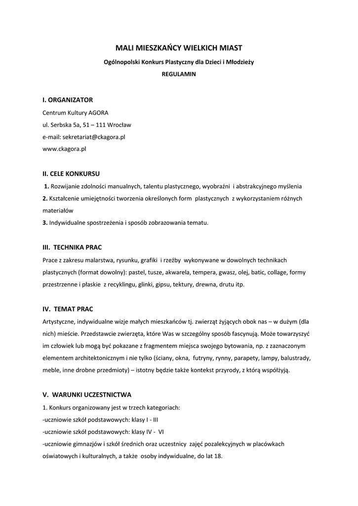 MALI MIESZKAŃCY WIELKICH MIAST Ogólnopolski Konkurs Plastyczny dla Dzieci i Młodzieży REGULAMIN I. ORGANIZATOR Centrum Kultury AGORA ul. Serbska 5a, 51 – 111 Wrocław e-mail: [email protected] www.ckagora.pl II. CELE KONKURSU 1. Rozwijanie zdolności manualnych, talentu plastycznego, wyobraźni i abstrakcyjnego myślenia 2. Kształcenie umiejętności tworzenia określonych form plastycznych z wykorzystaniem różnych materiałów 3. Indywidualne spostrzeżenia i sposób zobrazowania tematu. III. TECHNIKA PRAC Prace z zakresu malarstwa, rysunku, grafiki i rzeźby wykonywane w dowolnych technikach plastycznych (format dowolny): pastel, tusze, akwarela, tempera, gwasz, olej, batic, collage, formy przestrzenne i płaskie z recyklingu, glinki, gipsu, tektury, drewna, drutu itp. IV. TEMAT PRAC Artystyczne, indywidualne wizje małych mieszkańców tj. zwierząt żyjących obok nas – w dużym (dla nich) mieście. Przedstawcie zwierzęta, które Was w szczególny sposób fascynują. Może towarzyszyć im człowiek lub mogą być pokazane z fragmentem miejsca swojego bytowania, np. z zaznaczonym elementem architektonicznym i nie tylko (ściany, okna, futryny, rynny, parapety, lampy, balustrady, meble, inne drobne przedmioty) – istotny będzie także kontekst przyrody, z którą współżyją. V. WARUNKI UCZESTNICTWA 1. Konkurs organizowany jest w trzech kategoriach: -uczniowie szkół podstawowych: klasy I - III -uczniowie szkół podstawowych: klasy IV - VI -uczniowie gimnazjów i szkół średnich oraz uczestnicy zajęć pozalekcyjnych w placówkach oświatowych i kulturalnych, a także osoby indywidualne, do lat 18. 2. Do każdej pracy należy dołączyć wypełnioną kartę zgłoszenia dostępną również na stronie internetowej www.ckagora.pl 3. Autorem pracy może być tylko 1 osoba. Nie przyjmujemy prac zbiorowych. Z jednej klasy nauczyciel winien wybrać 5 najlepszych wg niego prac. 4. Udział w konkursie wiąże się z akceptacją Regulaminu i wyrażaniem zgody na: a) przetwarzanie danych osobowych uczestnika, zgodnie z ustawą z dnia 29 sierpnia 1997 roku o ochronie danych osobowych (t.j. Dz.U.2002 r. nr101,poz.926 ze zm.) do celów związanych z promocją działalności CK AGORA, b) nieodpłatne przeniesienie praw autorskich do nadesłanej pracy i jej nazwy (oraz wizerunku uczestnika) oraz ich wykorzystanie, bez ograniczeń czasowych i terytorialnych, do celów promocyjnych Konkursu i działalności Organizatora – na dowolnych nośnikach (m.in. audio/video/magnetycznym/optycznym),na następujących polach eksploatacji, w szczególności: zwielokrotnianie, publiczne odtwarzanie i rozpowszechnianie (fragmentów lub całości) w dowolnych mediach, a także na materiałach promocyjnych. 5. Wszystkie prace przechodzą na własność organizatorów i nie będą odsyłane. 6. Udział w konkursie jest równoznaczny z akceptacją warunków Regulaminu. 7. Sprawy nieujęte w Regulaminie rozstrzyga Organizator. VI. TERMINY I ADRESY Prace konkursowe należy przesłać lub dostarczyć do 20 grudnia 2013r., na adres: Centrum Kultury AGORA, 51-111 Wrocław, ul. Serbska 5a, Wrocław. Szczegółowych informacji udziela instruktor plastyki Jadwiga Całka, tel. 71 325-14-83, wew.109, e-mail: [email protected] VII. ROZSTRZYGNIĘCIE KONKURSU 1. W skład jury wejdą wrocławscy artyści oraz przedstawiciel Organizatora konkursu. 2. Jury przyzna nagrody i wyróżnienia w poszczególnych grupach wiekowych za malarstwo i techniki mieszane, rysunek i grafikę, formę przestrzenną i płaskorzeźbę. 3. O rozstrzygnięciu konkursu i przyznaniu nagród Organizator powiadomi laureatów do 6 stycznia 2014r. 4. Wernisaż wystawy pokonkursowej wraz z nagrodzeniem laureatów i osób wyróżnionych, odbędzie się 13.01.2014r. o godz. 15.00.