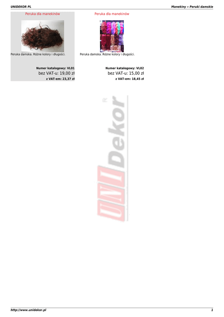 UNIDEKOR PL Manekiny » Peruki damskie Peruka dla manekinów Peruka damska. Różne kolory i długości. Peruka dla manekinów Peruka damska. Różne kolory i długości. Numer katalogowy: VL01 Numer katalogowy: VL02 bez VAT-u: 19,00 zł bez VAT-u: 15,00 zł z VAT-em: 23,37 zł z VAT-em: 18,45 zł http://www.unidekor.pl 1