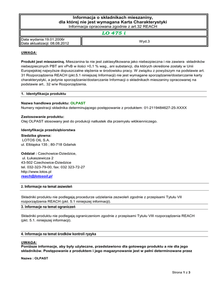 Informacja o składnikach mieszaniny, dla której nie jest wymagana Karta Charakterystyki Informacja opracowana zgodnie z art.32 REACH LO 475 i Data wydania:19.01.2006r Data aktualizacji: 08.08.2012 Wyd.3 UWAGA: Produkt jest mieszaniną. Mieszanina ta nie jest zaklasyfikowana jako niebezpieczna i nie zawiera składników niebezpiecznych PBT ani vPvB w ilości >0,1 % wag., ani substancji, dla których określone zostały w Unii Europejskiej najwyższe dopuszczalne stężenia w środowisku pracy. W związku z powyższym na podstawie art. 31 Rozporządzenia REACH (pkt.5.1 niniejszej Informacji) nie jest wymagane sporządzanie/dostarczanie karty charakterystyki, a jedynie sporządzanie/dostarczanie Informacji o składnikach mieszaniny opracowanej na podstawie art.. 32 w/w Rozporządzenia. 1. Identyfikacja produktu Nazwa handlowa produktu: OLPAST Numery rejestracji składnika determinującego postępowanie z produktem: 01-2119484627-25-XXXX Zastosowanie produktu: Olej OLPAST stosowany jest do produkcji natłustek dla przemysłu włókienniczego. Identyfikacja przedsiębiorstwa Siedziba głowna: LOTOS OIL S.A. ul. Elbląska 135 ; 80-718 Gdańsk Oddział : Czechowice-Dziedzice, ul. Łukaszewicza 2 43-502 Czechowice-Dziedzice tel. 032-323-79-00, fax: 032 323-72-27 http://www.lotos.pl [email protected] 2. Informacje na temat zezwoleń Składniki produktu nie podlegają procedurze udzielania zezwoleń zgodnie z przepisami Tytułu VII rozporządzenia REACH (pkt. 5.1 niniejszej informacji). 3. Informacje na temat ograniczeń Składniki produktu nie podlegają ograniczeniom zgodnie z przepisami Tytułu VIII rozporządzenia REACH (pkt. 5.1. niniejszej informacji). 4. Informacja na temat środków kontroli ryzyka UWAGA: Poniższe informacje, aby były użyteczne, przedstawiono dla gotowego produktu a nie dla jego składników. Postępowanie z produktem i jego magazynowanie jest w pełni determinowane przez Nazwa : OLPAST Strona 1 z 3 Informacja o składnikach mieszaniny, dla której nie jest wymagana Karta Charakterystyki Informacja opracowana zgodnie z art.32 REACH LO 475 i Data wydania:19.01.2006r Data aktualizacji: 08.08.2012 Wyd.3 składnik/i wymieniony w pkt. 1 niniejszej informacji. Postępowanie z produktem: Podczas prac z produktem należy przestrzegać ogólnych zasad i przepisów BHP i P. Poż. Nie dopuszczać do powstania stężeń składników produktu w powietrzu przekraczających wartości normatywów higienicznych. Należy unikać zrzutów do środowiska, nie wolno wprowadzać do kanalizacji. Zaleca się przechowywać z dala od źródeł ciepła/iskier/otwartego ognia/gorących powierzchni- nie palić. Unikać kontaktu z gorącym produktem. Prace należy wykonywać w dobrze wentylowanych pomieszczeniach, unikając kontaktu produktu z oczami i skórą. Unikać wdychania wyziewów/mgły. Zabezpieczyć przed ładunkami elektrostatycznymi. Unikać nagłego nalewania (z rozpryskiwaniem) dużych ilości gorącego produktu w postaci płynnej. Unikać ryzyka poślizgnięcia. . Nazwa substancji NDS (mg/m ) NDSCh (mg/ m ) NDSP 3 Oleje mineralne- faza ciekła aerozolu * 5 3 10 - *W warunkach, gdy nie powstają mgły i opary - nie dotyczy Magazynowanie produktu: Olej należy przechowywać w opakowaniach zamkniętych, chroniących przed dostępem powietrza, wilgoci oraz zanieczyszczeń mechanicznych z zachowaniem ogólnych przepisów BHP i przeciwpożarowych. Pomieszczenia magazynowe powinny być chłodne i dobrze wentylowane. Zalecane środki ochrony indywidualnej: Ochrona dróg oddechowych: W normalnych warunkach pracy, tj. w temperaturze otoczenia, nie wymaga się specjalnego zabezpieczenia, nie należy jednak wdychać stężonych par produktu. W przypadku gdy istnieje ryzyko powstania mgły olejowej lub w przypadku rozlania produktu oraz szacunkowego narażenia stosować półmaskę lub pełną maskę oddechową z połączonymi filtrami przeciwpyłowymi/filtrami oparów substancji organicznych albo autonomiczny aparat oddechowy. Jeżeli nie można w pełni ocenić sytuacji lub jeżeli istnieje zagrożenie niedoborem tlenu, należy stosować wyłącznie autonomiczny aparat oddechowy. Ochrona rąk i skóry: Nie wymaga się specjalnego zabezpieczenia, chociaż w celu ewentualnego zminimalizowania ryzyka zaleca się stosowanie odzieży ochronnej; olejoodpornych rękawic (np. neoprenowe, nitrylowe) oraz antypoślizgowego obuwia roboczego przystosowanych także do kontaktu z gorącymi przedmiotami. Rękawice powinny być termoodporne i izolowane termicznie, jeśli możliwy lub spodziewany jest kontakt z gorącym produktem. Ochrona oczu i twarzy: Nie wymaga się specjalnej ochrony, chociaż dobrym zwyczajem jest stosowanie okularów ochronnych a w przypadku zagrożenia rozpryskiwaniem- pełnej osłony głowy, twarzy i szyi. Informacje o transporcie: Produkt nie podlega przepisom ADR/RID (pkt. 5.8- 5.10 niniejszej Informacji) Nazwa : OLPAST Strona 2 z 3 Informacja o składnikach mieszaniny, dla której nie jest wymagana Karta Charakterystyki Informacja opracowana zgodnie z art.32 REACH LO 475 i Data wydania:19.01.2006r Data aktualizacji: 08.08.2012 Wyd.3 5. Informacje prawne 5.1. 5.2. 5.1. 5.4 5.5 5.6 5.7 5.8 5.9 5.10 Rozporządzenie (WE) nr 1907/2006 Parlamentu Europejskiego i Rady z dnia 18 grudnia 2006 r. w sprawie rejestracji, oceny, udzielania zezwoleń i stosowanych ograniczeń w zakresie chemikaliów (REACH), utworzenia Europejskiej Agencji Chemikaliów, (Dz. Urz. UE seria L nr 396 z 30 grudnia 2006r. oraz sprostowanie Dz. Urz. UE seria L nr 136 z 29 maja 2007r. z poźn. zm.) Ustawa z dnia 25 lutego 2011r. o substancjach chemicznych i ich mieszaninach (Dz. U.11.63.322 z późn. zm.) Rozporządzenie Ministra Zdrowia z dnia 2 września 2003 r. w sprawie kryteriów i sposobu klasyfikacji substancji i preparatów chemicznych (Dz.U.03.171.1666 z późn. zm.) Rozporządzenie Parlamentu Europejskiego i Rady (WE) nr 1272/2008 z dnia 16 grudnia 2008r. w sprawie klasyfikacji, oznakowania i pakowania substan