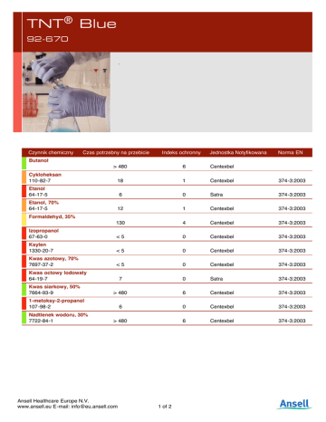 TNT® Blue 92-670 . Czynnik chemiczny Czas potrzebny na przebicie Indeks ochronny Jednostka Notyfikowana Norma EN Butanol > 480 6 Centexbel 18 1 Centexbel 374-3:2003 6 0 Satra 374-3:2003 12 1 Centexbel 374-3:2003 130 4 Centexbel 374-3:2003 Izopropanol 67-63-0 <5 0 Centexbel 374-3:2003 Ksylen 1330-20-7 <5 0 Centexbel 374-3:2003 Kwas azotowy, 70% 7697-37-2 <5 0 Centexbel 374-3:2003 7 0 Satra 374-3:2003 > 480 6 Centexbel 374-3:2003 6 0 Centexbel 374-3:2003 > 480 6 Centexbel 374-3:2003 Cykloheksan 110-82-7 Etanol 64-17-5 Etanol, 70% 64-17-5 Formaldehyd, 35% Kwas octowy lodowaty 64-19-7 Kwas siarkowy, 50% 7664-93-9 1-metoksy-2-propanol 107-98-2 Nadtlenek wodoru, 30% 7722-84-1 Ansell Healthcare Europe N.V. www.ansell.eu E-mail: [email protected] 1 of 2 TNT ® Blue 92-670 Czynnik chemiczny Czas potrzebny na przebicie Indeks ochronny Jednostka Notyfikowana Norma EN Nikotyna 108 3 Force Technology Tetrachloroetylen 127-18-4 <5 0 Centexbel Trietyloamina 121-44-8 15 1 Centexbel 374-3:2003 Wodorotlenek amonu, 25% 1336-21-6 17 1 Centexbel 374-3:2003 Przedstawione zalecenia są oparte na ekstrapolacji wyników badań laboratoryjnych przeprowadzonych przy użyciu standardowych metod badania, które mogą nie odzwierciedlać specyficznych warunków stosowania. Badania prowadzono na czystych substancjach chemicznych, a więc nie brano pod uwagę efektów synergistycznych wynikających z mieszania substancji. Z powyższych powodów oraz ze względu na to, że firma Ansell nie posiada szczegółowej wiedzy ani kontroli nad docelowymi warunkami stosowania, zalecenia należy traktować jedynie jako sugestie. Firma Ansell nie ponosi za nie odpowiedzialności. W niniejszej tabeli wymieniono wyłącznie chemikalia przebadane przez jednostkę notyfikowaną. Dodatkowe dane dotyczące innych chemikaliów można uzyskać w Dziale Technicznym firmy Ansell, pod adresem [email protected] Ansell Healthcare Europe N.V. Riverside Business Park, Spey House Boulevard International 55 B-1070 Brussels, Belgium Tel. +32 (0)2 528 74 00 Fax +32 (0)2 528 74 01 Fax Customer Service +32 (0)2 528 74 03 www.ansell.eu E-mail: [email protected] 2 of 2