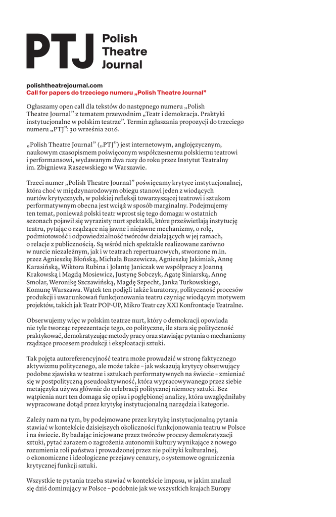 Polish Theatre Journal polishtheatrejournal.com Call for papers do trzeciego numeru „Polish Theatre Journal” Ogłaszamy open call dla tekstów do następnego numeru „Polish Theatre Journal” z tematem przewodnim „Teatr i demokracja. Praktyki instytucjonalne w polskim teatrze”. Termin zgłaszania propozycji do trzeciego numeru „PTJ”: 30 września 2016. „Polish Theatre Journal” („PTJ”) jest internetowym, anglojęzycznym, naukowym czasopismem poświęconym współczesnemu polskiemu teatrowi i performansowi, wydawanym dwa razy do roku przez Instytut Teatralny im. Zbigniewa Raszewskiego w Warszawie. Trzeci numer „Polish Theatre Journal” poświęcamy krytyce instytucjonalnej, która choć w międzynarodowym obiegu stanowi jeden z wiodących nurtów krytycznych, w polskiej refleksji towarzyszącej teatrowi i sztukom performatywnym obecna jest wciąż w sposób marginalny. Podejmujemy ten temat, ponieważ polski teatr wprost się tego domaga: w ostatnich sezonach pojawił się wyrazisty nurt spektakli, które prześwietlają instytucję teatru, pytając o rządzące nią jawne i niejawne mechanizmy, o rolę, podmiotowość i odpowiedzialność twórców działających w jej ramach, o relacje z publicznością. Są wśród nich spektakle realizowane zarówno w nurcie niezależnym, jak i w teatrach repertuarowych, stworzone m.in. przez Agnieszkę Błońską, Michała Buszewicza, Agnieszkę Jakimiak, Annę Karasińską, Wiktora Rubina i Jolantę Janiczak we współpracy z Joanną Krakowską i Magdą Mosiewicz, Justynę Sobczyk, Agatę Siniarską, Annę Smolar, Weronikę Szczawińską, Magdę Szpecht, Janka Turkowskiego, Komunę Warszawa. Wątek ten podjęli także kuratorzy, polityczność procesów produkcji i uwarunkowań funkcjonowania teatru czyniąc wiodącym motywem projektów, takich jak Teatr POP-UP, Mikro Teatr czy XXI Konfrontacje Teatralne. Obserwujemy więc w polskim teatrze nurt, który o demokracji opowiada nie tyle tworząc reprezentacje tego, co polityczne, ile stara się polityczność praktykować, demokratyzując metody pracy oraz stawiając pytania o mechanizmy rządzące procesem produkcji i eksploatacji sztuki. Tak pojęta autoreferencyjność teatru może prowadzić w stronę faktycznego aktywizmu politycznego, ale może także – jak wskazują krytycy obserwujący podobne zjawiska w teatrze i sztukach performatywnych na świecie – zmieniać się w postpolityczną pseudoaktywność, która wypracowywanego przez siebie metajęzyka używa głównie do celebracji politycznej niemocy sztuki. Bez wątpienia nurt ten domaga się opisu i pogłębionej analizy, która uwzględniłaby wypracowane dotąd przez krytykę instytucjonalną narzędzia i kategorie. Zależy nam na tym, by podejmowane przez krytykę instytucjonalną pytania stawiać w kontekście dzisiejszych okoliczności funkcjonowania teatru w Polsce i na świecie. By badając inicjowane przez twórców procesy demokratyzacji sztuki, pytać zarazem o zagrożenia autonomii kultury wynikające z nowego rozumienia roli państwa i prowadzonej przez nie polityki kulturalnej, o ekonomiczne i ideologiczne przejawy cenzury, o systemowe ograniczenia krytycznej funkcji sztuki. Wszystkie te pytania trzeba stawiać w kontekście impasu, w jakim znalazł się dziś dominujący w Polsce – podobnie jak we wszystkich krajach Europy Środkowej i Wschodniej oraz Niemiec – model t e at r u r e p e r t u a r o we go . Sceny publiczne, borykające się z systemowym niedofinansowaniem, wysokimi kosztami produkcji i eksploatacji spektakli, poddawane rosnącej presji ekonomistów i polityków przywiązanych do idei samoregulującego się rynku, z wielkim trudem (jeśli w ogóle) próbują podejmować wyzwania związane ze współczesnym kryzysem demokracji i społeczeństwa obywatelskiego. Tym bardziej, że nierzadko same są przestrzenią przemocowych praktyk zarządzania i sztywnej hierarchii, które podporządkowują pracę całej instytucji wizji jednej osoby i uniemożliwiają krytyczne lub alternatywne spojrzenie na nią, jej cele i sposób funkcjonowania. Jest też możliwe, że model instytucji i organizacji teatru oraz sposób jego rozumienia i uprawiania, jaki wytworzył się i został przyjęty w nowożytnej Europie a następnie upowszechnił na świecie opiera się na milcząco przyjętym założeniu o nienaruszalności struktur i podziałów, które chcielibyśmy poddać dyskusji. Że innymi słowy: teatr jest instytucją niedemokratyczną, a głębokie zmiany w jego podstawowej strukturze wiodą z konieczności do jego przekształcenia bądź to w inną formę sztuk performatywnych, bądź też w „nie-sztukę”. Dyskusja o teatrze i jego instytucjonalnej formule okazuje się więc dyskusją o rudymentach rozumienia sztuki i kultury oraz funkcji, jakie mogą i powinny pełnić we współczesnym świecie. W trzecim numerze „Polish Theatre Journal” chcielibyśmy podjąć debatę dotyczącą wyżej wskazanych problemów, otwierając ją także na zjawiska spoza teatru polskiego. Mamy bowiem wrażenie, że sytuacja, z którą się mierzymy, dotyczy nie tylko Polski, zaś w poszukiwaniu możliwych rozwiązań (lub dla zdiagnozowania zagrożeń) trzeba korzystać z doświadczeń innych krajów, zwłaszcza Europy Środkowo-Wschodniej. Zapraszamy do zgłaszania swoich propozycji. Zależy nam zarówno na tekstach analitycznych, badających konkretne dzieła, strategie twórców czy instytucji, jak i na szerszych ujęciach problemowych. Interesuje nas także podejście komparatystyczne, pokazujące zachodzące w polskim teatrze procesy na tle podobnych zjawisk w innych krajach i dyscyplinach sztuki. Obok tekstów krytycznych chętnie widzielibyśmy projekty rewolucyjnych utopii i wizje emancypacyjnego działania dla przyszłości, nawet jeśli dziś wydawać się mogą tylko marzeniami. Zależy nam na otwarciu dyskusji i zebraniu inspiracji, które mogłyby zapobiec pogłębianiu się poczucia bezradnoś