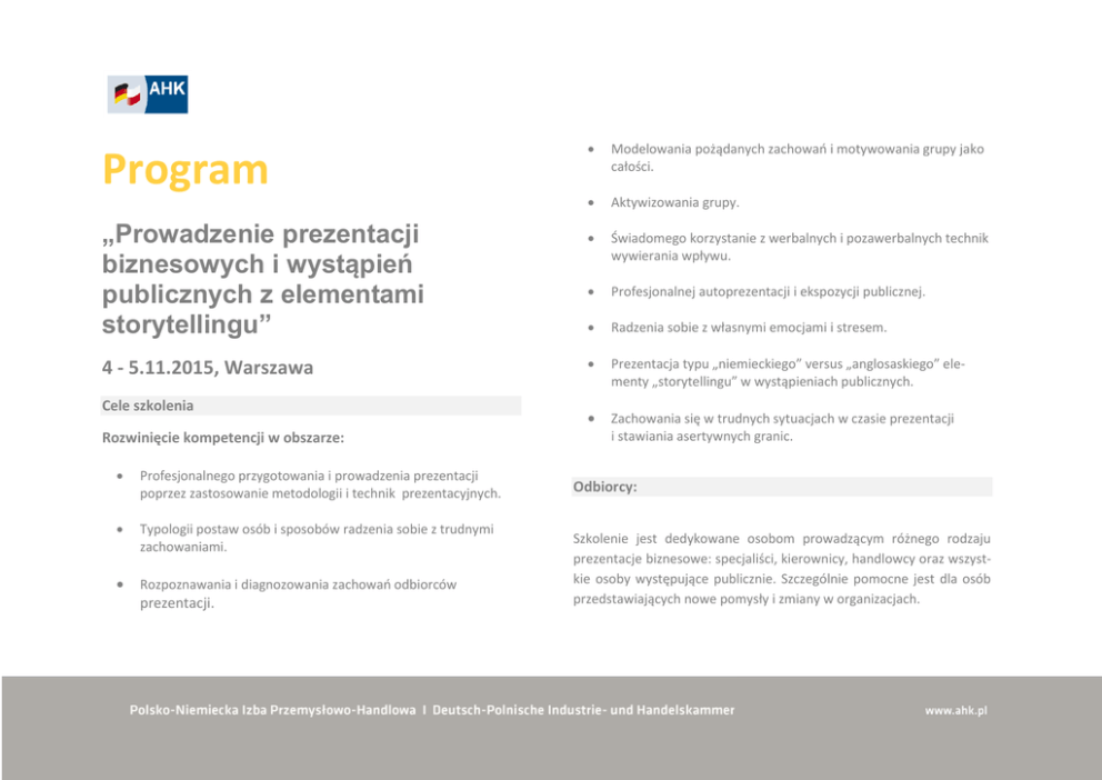 Program „Prowadzenie prezentacji biznesowych i wystąpień publicznych z elementami storytellingu” 4 - 5.11.2015, Warszawa Cele szkolenia Rozwinięcie kompetencji w obszarze: Profesjonalnego przygotowania i prowadzenia prezentacji poprzez zastosowanie metodologii i technik prezentacyjnych. Typologii postaw osób i sposobów radzenia sobie z trudnymi zachowaniami. Rozpoznawania i diagnozowania zachowań odbiorców prezentacji. Modelowania pożądanych zachowań i motywowania grupy jako całości. Aktywizowania grupy. Świadomego korzystanie z werbalnych i pozawerbalnych technik wywierania wpływu. Profesjonalnej autoprezentacji i ekspozycji publicznej. Radzenia sobie z własnymi emocjami i stresem. Prezentacja typu „niemieckiego” versus „anglosaskiego” elementy „storytellingu” w wystąpieniach publicznych. Zachowania się w trudnych sytuacjach w czasie prezentacji i stawiania asertywnych granic. Odbiorcy: Szkolenie jest dedykowane osobom prowadzącym różnego rodzaju prezentacje biznesowe: specjaliści, kierownicy, handlowcy oraz wszystkie osoby występujące publicznie. Szczególnie pomocne jest dla osób przedstawiających nowe pomysły i zmiany w organizacjach. Program: 1 dzień 9.00 -17.00 Przerwy kawowe Lunch: 12.30 – 13.15 1. Wprowadzenie do zajęć Przedstawienie prowadzącego i uczestników zajęć Zapoznanie uczestników z programem szkolenia Zawarcie paktu z grupą 2. Przygotowanie prezentacji Techniki wizualizacji podczas prowadzenia prezentacji biznesowych Zasady przygotowania - konspekt Formułowanie ogólnych i operacyjnych celów prezentacji – (prezentacja informacyjna, sprzedażowa, zmieniająca postawę ) Przygotowanie poszczególnych modułów prezentacji Dobór technik prezentacyjnych Przygotowanie materiałów, pomocy, zapoznanie się z miejscem prezentacji Wykorzystanie pomocniczych środków audiowizualnych Wybór metody walidacji prezentacji 3. Jak być dobrym prowadzącym Cechy dobrego prowadzącego Wrażenie wywierane na odbiorcy Reguły autoprezentacji i ekspozycja publiczna Relacja prowadzący - grupa i jej wpływ na skuteczność przekazu Informacja zwrotna – filar efektywnej komunikacji interpersonalnej w prezentacjach 4. Jak skutecznie komunikować się z grupą Jak efektywnie pracować z grupą odbiorców komunikacja werbalna i mowa ciała w pracy prezentera Bariery w efektywnej komunikacji Werbalne techniki przezwyciężania barier w komunikacji Podążanie za uczestnikami Używanie sugestywnego języka 2 dzień 9.00 -17.00 Przerwy kawowe Lunch: 12.30 – 13.15 1. Prowadzenie grupy i wywieranie wpływu - storytelling Ważne reguły wywierania wpływu - prawo podobieństwa i sympatii (prawo aureoli), prawo pierwszeństwa i świeżości, prawo autorytetu Techniki aktywizowania grupy Prowadzenie dyskusji, wydawanie instrukcji, podsumowywanie, używanie pomocy itp. Humor w kontekście prowadzenia prezentacji Dlaczego storytelling ? Wywieranie wpływu poprzez emocje Context-Action-Result, Struktura historii/paraboli wg Paula Smitha Zdobywanie zaufania audytorium Tworzenie własnych historii na potrzeby wystąpień. 2. Sposoby radzenia sobie z wymagającymi uczestnikami Źródła zachowań niechętnych i agresywnych Lęk przed ekspozycją i oceną Stereotypy i uprzedzenia Metody radzenia sobie z trudnymi uczestnikami Stosowanie strategii asertywnej przez prowadzącego Asertywność podczas prowadzenia prezentacji Radzenie sobie ze stresem i emocjami podczas prowadzenia prezentacji Rozumienie specyficznych zachowań ludzi Komunikat JA 3.Nagranie video przygotowanych samodzielnie prezentacji oraz odtworzenie wraz z indywidualnym feedbackiem 4. Podsumowanie i uroczyste zakończenie prezentacji Wręczenie dyplomów Ewaluacja Metody pracy Główny nacisk na ćwiczenia indywidualne i grupowe Mini wykład – poniżej 20% czasu warsztatów Prezentacja PPT Trener Sylwester Pietrzyk trener z dwunastoletnim stażem posiadający Międzynarodowy Certyfikat Trenera Zarządzania, z wykształcenia m.in. prawnik (UW), absolwent Podyplomowych Studiów Zarządzania Zasobami Ludzkimi w Szkole Głównej Handlowej w Warszawie. Specjalizuje się w szkoleniach z zakresu komunikacji, negocjacji, sprzedaży, zarządzania czasem oraz projektach personalnych. Praktyk biznesu. Poprowadził ponad 1500 dni szkoleniowych. W latach 1992-96 pełniący funkcję unit menadżera w amerykańskiej firmie (Marco International) zajmującej się badaniami rynku, w latach 1998-2006 kierownik i specjalista ds. szkoleń w dużej międzynarodowej firmie finansowej notowanej na giełdzie londyńskiej (Provident Polska S.A.). Jest wykładowcą Okręgowej Izby Radców Prawnych w Kielcach. Warsztaty „Trening dla trenerów” przeprowadził m.in. dla pracowników merytorycznych ZUS (Kielce i Warszawa 12.2011), Izby Celnej (11.2009), Kraft Polska (11.2009), General Electric (02.2012) i Instytut Lotnictwa (02.2012). Współpracuje z oficyną Ekonomiczną w zakresie recenzowania wydawnictw z zakresu zarządzania. Pracował z kilkuset firmami polskimi i korporacjami zachodnimi /m.in.: Porty Lotnicze, Ikea, PZU S.A., HBO, Politechnika Warszawska, Nestle Waters, Cefarm Śląski, Siemens, Ministerstwo Obrony Narodowej, Agencja Rozwoju Lokalnego, Nask, FCE Bank, VB Leasing, Kraft, Podkarpacki Klub Biznesu, RWE STOEN, Franke, ZUS, Baker & Tilly sp. z o.o., LOT, Toyota w zakresie szkoleń sprzedażowych, menadżerskich, komunikacyjnych, negocjacyjnych i zarządzania czasem. Od 2001 lat aktywnie działający Członek Stowarzyszenia Trenerów i Konsultantów MATRIK. Słuchacz studiów Doktoranckich w Kolegium Nauk o Przedsiębiorstwie Szkoły Głównej Handlowej w Warszawie. Trener w szkole trenerów zarządzania MATRIK. Autor wielu publikacji z zakresu HR.