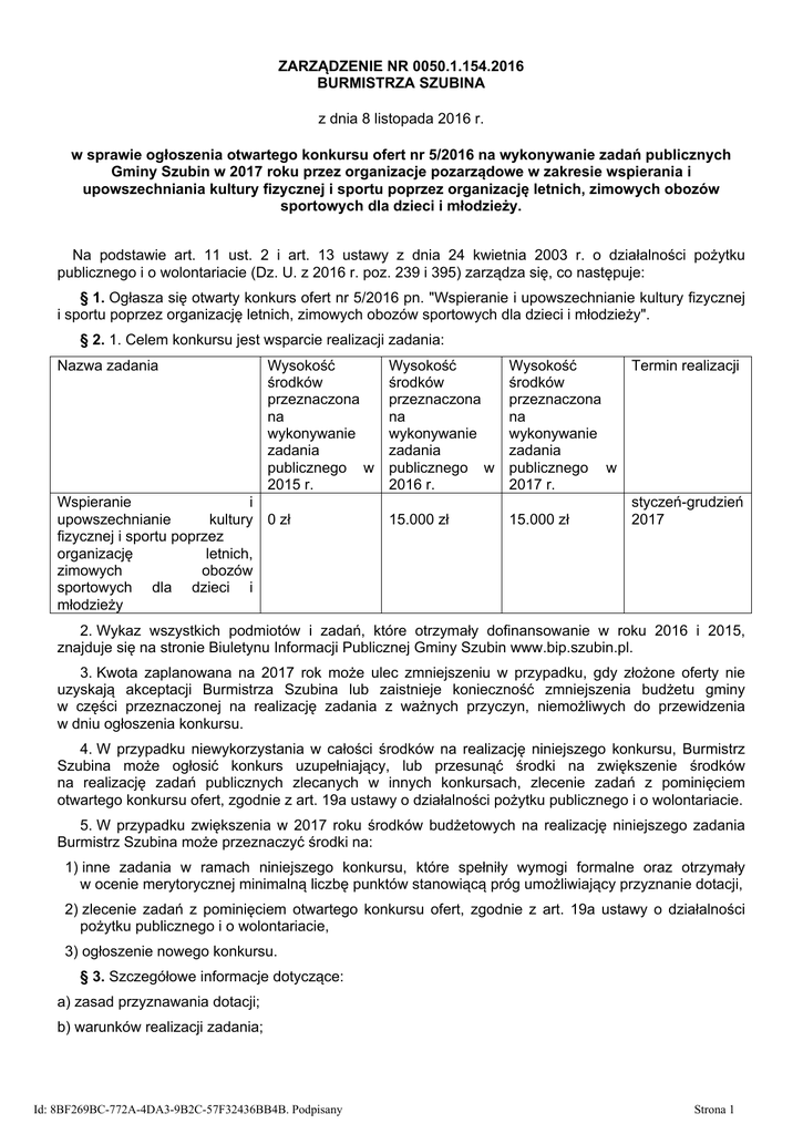 ZARZĄDZENIE NR 0050.1.154.2016 BURMISTRZA SZUBINA z dnia 8 listopada 2016 r. w sprawie ogłoszenia otwartego konkursu ofert nr 5/2016 na wykonywanie zadań publicznych Gminy Szubin w 2017 roku przez organizacje pozarządowe w zakresie wspierania i upowszechniania kultury fizycznej i sportu poprzez organizację letnich, zimowych obozów sportowych dla dzieci i młodzieży. Na podstawie art. 11 ust. 2 i art. 13 ustawy z dnia 24 kwietnia 2003 r. o działalności pożytku publicznego i o wolontariacie (Dz. U. z 2016 r. poz. 239 i 395) zarządza się, co następuje: § 1. Ogłasza się otwarty konkurs ofert nr 5/2016 pn. "Wspieranie i upowszechnianie kultury fizycznej i sportu poprzez organizację letnich, zimowych obozów sportowych dla dzieci i młodzieży". § 2. 1. Celem konkursu jest wsparcie realizacji zadania: Nazwa zadania Wysokość środków przeznaczona na wykonywanie zadania publicznego w 2015 r. Wspieranie i upowszechnianie kultury 0 zł fizycznej i sportu poprzez organizację letnich, zimowych obozów sportowych dla dzieci i młodzieży Wysokość środków przeznaczona na wykonywanie zadania publicznego w 2016 r. 15.000 zł Wysokość Termin realizacji środków przeznaczona na wykonywanie zadania publicznego w 2017 r. styczeń-grudzień 2017 15.000 zł 2. Wykaz wszystkich podmiotów i zadań, które otrzymały dofinansowanie w roku 2016 i 2015, znajduje się na stronie Biuletynu Informacji Publicznej Gminy Szubin www.bip.szubin.pl. 3. Kwota zaplanowana na 2017 rok może ulec zmniejszeniu w przypadku, gdy złożone oferty nie uzyskają akceptacji Burmistrza Szubina lub zaistnieje konieczność zmniejszenia budżetu gminy w części przeznaczonej na realizację zadania z ważnych przyczyn, niemożliwych do przewidzenia w dniu ogłoszenia konkursu. 4. W przypadku niewykorzystania w całości środków na realizację niniejszego konkursu, Burmistrz Szubina może ogłosić konkurs uzupełniający, lub przesunąć środki na zwiększenie środków na realizację zadań publicznych zlecanych w innych konkursach, zlecenie zadań z pominięciem otwartego konkursu ofert, zgodnie z art. 19a ustawy o działalności pożytku publicznego i o wolontariacie. 5. W przypadku zwiększenia w 2017 roku środków budżetowych na realizację niniejszego zadania Burmistrz Szubina może przeznaczyć środki na: 1) inne zadania w ramach niniejszego konkursu, które spełniły wymogi formalne oraz otrzymały w ocenie merytorycznej minimalną liczbę punktów stanowiącą próg umożliwiający przyznanie dotacji, 2) zlecenie zadań z pominięciem otwartego konkursu ofert, zgodnie z art. 19a ustawy o działalności pożytku publicznego i o wolontariacie, 3) ogłoszenie nowego konkursu. § 3. Szczegółowe informacje dotyczące: a) zasad przyznawania dotacji; b) warunków realizacji zadania; Id: 8BF269BC-772A-4DA3-9B2C-57F32436BB4B. Podpisany Strona 1 c) trybu i kryteriów stosowanych przy wyborze ofert – zostały określone w zarządzeniu Burmistrza Szubina nr 0050.1.148.2016 z dnia 8 listopada 2016 r. w sprawie regulaminu otwartych konkursów ofert na realizację zadań publicznych Gminy Szubin w 2017 roku. § 4. Warunkiem przystąpienia do konkursu jest złożenie oferty realizacji zadania wg wzoru określonego w załączniku do rozporządzenia Ministra Pracy i Polityki Społecznej z dnia 17 sierpnia 2016 r. w sprawie wzoru oferty i ramowego wzoru umowy dotyczącej realizacji zadania publicznego oraz wzoru sprawozdania z wykonania tego zadania (Dz. U. z 2016 r., poz. 1300) w terminie do dnia 30 listopada 2016 r. na niżej podany adres: Urząd Miejski w Szubinie przy ulicy Kcyńskiej 12, 89-200 Szubin. Wzory ofert są dostępne na stronie internetowej Biuletynu Informacji Publicznej Urzędu Miejskiego w Szubinie www.bip.szubin.pl (zakładka „współpraca z organizacjami pozarządowymi” - druki do pobrania) oraz można je otrzymać w Urzędzie Miejskim w Szubinie, ulica Kcyńska 12, (II budynek) pokój nr 41. § 5. Dodatkowe warunki konkursu: 1. Maksymalna dotacja przyznana na jednego uczestnika biorącego udział w letnich, zimowych obozach sportowych dla dzieci i młodzieży nie może przekroczyć 500,00 zł. 2. Ponadto do oferty należy dołączyć listę uczestników zadania ze wskazaniem ich miejsca zamieszkania (nazwa miejscowości). § 6. Ostateczne rozstrzygnięcie konkursu nastąpi nie później, niż w ciągu 45 dni od ostatniego dnia przyjmowania ofert. § 7. Zarządzenie wchodzi w życie z dniem podpisania. Burmistrz Szubina Artur Michalak Id: 8BF269BC-772A-4DA3-9B2C-57F32436BB4B. Podpisany Strona 2 Uzasadnienie Celem ogłoszenia otwartego konkursu ofert nr 5/2016 pn. "Wspieranie i upowszechnianie kultury fizycznej i sportu poprzez organizację letnich, zimowych obozów sportowych dla dzieci i młodzieży" jest wyłonienie ofert i zlecenie podmiotom prowadzącym działalność pożytku publicznego realizacji zadań publicznych Gminy Szubin w zakresie wspierania i upowszechniania kultury fizycznej i sportu w 2017 roku. Podstawą prawną ogłoszenia konkursu jest ustawa z dnia 24 kwietnia 2003r. o działalności pożytku publicznego i o wolontariacie (Dz. U. z 2016 r. poz. 239 i 395) oraz uchwała nr XXVI/315/16 Rady Miejskiej w Szubinie z dnia 3 listopada 2016 r. w sprawie uchwalenia “Rocznego programu współpracy Gminy Szubin z organizacjami pozarządowymi oraz innymi organizacjami pożytku publicznego na rok 2017”. Konkurs ma służyć tworzeniu warunków sprzyjających rozwojowi kultury fizycznej i sportu oraz realizacji zadań polegających na pokryciu kosztów obozów sportowych i wynagrodzenia kadry szkoleniowej. W projekcie budżetu gminy na 2017 rok na dofinansowanie realizacji zadań objętych powyższym konkursem przeznaczono środki w wysokości 15 000,00 zł. Burmistrz Szubina Artur Michalak Id: 8BF269BC-772A-4DA3-9B2C-57F32436BB4B. Podpisany Strona 1