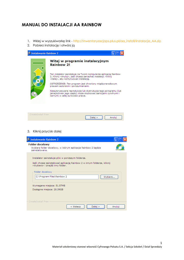 MANUAL DO INSTALACJI AA RAINBOW 1. Wklej w wyszukiwarkę link - http://inwentaryzacjaps.plus.pl/aa_install/instalacja_AA.zip 2. Pobierz instalację i otwórz ją 3. Kliknij przycisk dalej 1 Materiał szkoleniowy stanowi własność Cyfrowego Polsatu S.A. / Sekcja Szkoleń / Dział Sprzedaży 4. Kliknij przycisk dalej, program zacznie się automatycznie instalować 5. Kliknij przycisk Zakończ 2 Materiał szkoleniowy stanowi własność Cyfrowego Polsatu S.A. / Sekcja Szkoleń / Dział Sprzedaży 6. Na pulpicie utworzy się skrót do AA Rainbow – kliknij go. Wyświetli się panel administracyjny do AA Rainbow 7. Wpisz swój login i hasło, które otrzymałeś SMS-em z numeru 484849 oraz kliknij OK 8. Jesteś zalogowany do programu AA Rainbow 3 Materiał szkoleniowy stanowi własność Cyfrowego Polsatu S.A. / Sekcja Szkoleń / Dział Sprzedaży