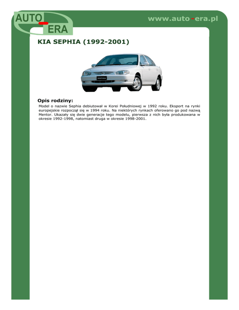 www.auto - era.pl KIA SEPHIA (1992-2001) Opis rodziny: Model o nazwie Sephia debiutował w Korei Południowej w 1992 roku. Eksport na rynki europejskie rozpoczął się w 1994 roku. Na niektórych rynkach oferowano go pod nazwą Mentor. Ukazały się dwie generacje tego modelu, pierwsza z nich była produkowana w okresie 1992-1998, natomiast druga w okresie 1998-2001.