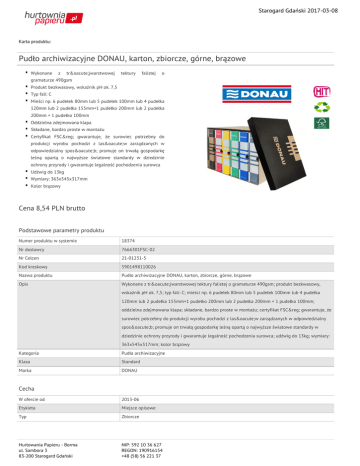 Starogard Gdański 2017-03-08 Karta produktu: Pudło archiwizacyjne DONAU, karton, zbiorcze, górne, brązowe Wykonane z trójwarstwowej tektury falistej o gramaturze 490gsm Produkt bezkwasowy, wskaźnik pH ok. 7,5 Typ fali: C Mieści np. 6 pudełek 80mm lub 5 pudełek 100mm lub 4 pudełka 120mm lub 2 pudełka 155mm+1 pudełko 200mm lub 2 pudełka 200mm + 1 pudełko 100mm Oddzielna zdejmowana klapa Składane, bardzo proste w montażu Certyfikat FSC® gwarantuje, że surowiec potrzebny do produkcji wyrobu pochodzi z lasów zarządzanych w odpowiedzialny sposób; promuje on trwałą gospodarkę leśną opartą o najwyższe światowe standardy w dziedzinie ochrony przyrody i gwarantuje legalność pochodzenia surowca Udźwig do 13kg Wymiary: 363x545x317mm Kolor brązowy Cena 8,54 PLN brutto Podstawowe parametry produktu Numer produktu w systemie 18374 Nr dostawcy 7666301FSC-02 Nr Celcen 21-01231-5 Kod kreskowy 5901498110026 Nazwa produktu Pudło archiwizacyjne DONAU, karton, zbiorcze, górne, brązowe Opis Wykonane z trójwarstwowej tektury falistej o gramaturze 490gsm; produkt bezkwasowy, wskaźnik pH ok. 7,5; typ fali: C; mieści np. 6 pudełek 80mm lub 5 pudełek 100mm lub 4 pudełka 120mm lub 2 pudełka 155mm+1 pudełko 200mm lub 2 pudełka 200mm + 1 pudełko 100mm; oddzielna zdejmowana klapa; składane, bardzo proste w montażu; certyfikat FSC® gwarantuje, że surowiec potrzebny do produkcji wyrobu pochodzi z lasów zarządzanych w odpowiedzialny sposób; promuje on trwałą gospodarkę leśną opartą o najwyższe światowe standardy w dziedzinie ochrony przyrody i gwarantuje legalność pochodzenia surowca; udźwig do 13kg; wymiary: 363x545x317mm; kolor brązowy Kategoria Pudła archiwizacyjne Klasa Standard Marka DONAU Cecha W ofercie od 2013-06 Etykieta Miejsce opisowe Typ Zbiorcze Hurtowania Papieru - Borma ul. Sambora 3 83-200 Starogard Gdański NIP: 592 10 36 627 REGON: 190916154 +48 (58) 56 221 37 Starogard Gdański 2017-03-08 Karta katalogowa produktu cd. Pudło archiwizacyjne DONAU, karton, zbiorcze, górne, brązowe Rodzaj Składany Produkt Pojemnik Materiał Tektura Wymiary Format B.d. Wymiary (mm) 363x545x317 Szerokość (mm) 363 Gramatura (g/m2) 490 Zamiennik Zamiennik 7666301PL-02 Ilość Ilość kartek B.d. Wspólny słownik zamówień CPV 30193700-5 Pudełko do przechowywania dokumentów Certyfikaty Hit Hit Nowy produkt w ofercie Standard Kolor Kolor Brązowy Pozostałe zdjęcia produktu Serdecznie zapraszamy do współpracy Hurtowania Papieru - Borma zespół. Hurtowania Papieru - Borma ul. Sambora 3 83-200 Starogard Gdański NIP: 592 10 36 627 REGON: 190916154 +48 (58) 56 221 37