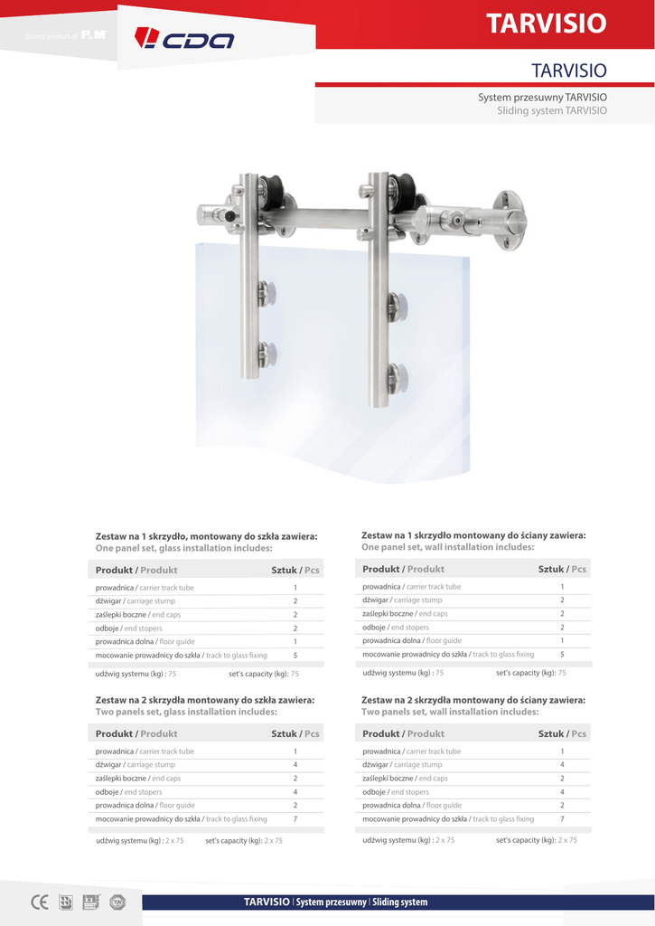 TARVISIO Quality product of TARVISIO System przesuwny TARVISIO Sliding system TARVISIO Zestaw na 1 skrzydło, montowany do szkła zawiera: One panel set, glass installation includes: Produkt / Produkt Sztuk / Pcs Zestaw na 1 skrzydło montowany do ściany zawiera: One panel set, wall installation includes: Produkt / Produkt Sztuk / Pcs prowadnica / carrier track tube 1 prowadnica / carrier track tube dźwigar / carriage stump 2 dźwigar / carriage stump 2 zaślepki boczne / end caps 2 zaślepki boczne / end caps 2 odboje / end stopers 2 odboje / end stopers 2 prowadnica dolna / floor guide 1 prowadnica dolna / floor guide 1 mocowanie prowadnicy do szkła / track to glass fixing 5 mocowanie prowadnicy do szkła / track to glass fixing 5 udźwig systemu (kg) : 75 set’s capacity (kg): 75 udźwig systemu (kg) : 75 1 set’s capacity (kg): 75 Zestaw na 2 skrzydła montowany do szkła zawiera: Two panels set, glass installation includes: Zestaw na 2 skrzydła montowany do ściany zawiera: Two panels set, wall installation includes: Produkt / Produkt Produkt / Produkt Sztuk / Pcs Sztuk / Pcs prowadnica / carrier track tube 1 prowadnica / carrier track tube 1 dźwigar / carriage stump 4 dźwigar / carriage stump 4 zaślepki boczne / end caps 2 zaślepki boczne / end caps 2 odboje / end stopers 4 odboje / end stopers 4 prowadnica dolna / floor guide 2 prowadnica dolna / floor guide 2 mocowanie prowadnicy do szkła / track to glass fixing 7 mocowanie prowadnicy do szkła / track to glass fixing 7 udźwig systemu (kg) : 2 x 75 set’s capacity (kg): 2 x 75 udźwig systemu (kg) : 2 x 75 TARVISIO І System przesuwny І Sliding system set’s capacity (kg): 2 x 75 TARVISIO Quality product of TARVISIO System przesuwny TARVISIO Sliding system TARVISIO CDA/MTS-OSW2 CDA/MTS-OSW3 CDA/MTS-TSW3 CDA/MTS-OSG2 CDA/MTS-OSG3 Kod zestawu Set’s code CDA/MTS-TSG3 Zestaw Set Prowadnica długość (mm) Ilość skrzydeł Track lenght (mm) Number of panels Montaż Installation Wykończenie Finish CDA/MTS-OSW2 A 1 2000 ściana / wall stal nierdzewna satyna satin stainless steel CDA/MTS-OSW3 B 1 3000 ściana / wall stal nierdzewna satyna satin stainless steel CDA/MTS-TSW3 C 2 3000 ściana / wall stal nierdzewna satyna satin stainless steel CDA/MTS-OSG2 D 1 2000 szyba / glass stal nierdzewna satyna satin stainless steel CDA/MTS-OSG3 E 1 3000 szyba / glass stal nierdzewna satyna satin stainless steel CDA/MTS-TSG3 F 2 3000 szyba / glass stal nierdzewna satyna satin stainless steel grubość szkła (mm): 8; 10; 12 glass thickness (mm): 8; 10; 12 UWAGA: prosimy podać grubość szkła oraz rodzaj dźwigara: ATTENCION: please specyfy the glass thickness & carriage stump: CDA/MTS-CS-CSASSS lub CDA/MTS-CS-FHASSS CDA/MTS-CS-CSASSS or CDA/MTS-CS-FHASSS TARVISIO І System przesuwny І Sliding system TARVISIO Quality product of CDA/DRM100 Widok - system przesuwny TARVISIO View - sliding system TARVISIO Długość prowadnicy / Lenght of track MTS-TTW Mocowanie prowadnicy MTS-TTW Track to wall fixing MTS-TR25 Prowadnica MTS-TR25 Carrier track tube MTS-STP Odbój MTS-STP End stopper 80 150 55 Wysokość panela szklanego = wysokość otworu drzwiowego+55 mm-10 mm Glass panel height= clear height+55 mm-10 mm 150 150 Drzwi Door 50 50 Szerokość szkła = otwór drzwiowy+100 mm Glass width = clear width+100 mm 10 90 60 MTS-CS Dźwigar z rotulą MTS-CS Carriage stump Montaż do ściany Wall installation ADJ-USS Prowadnica podłogowa ADJ-USS Floor guide TARVISIO І System przesuwny І Sliding system TARVISIO Quality product of TARVISIO Widok - system przesuwny TARVISIO View- sliding system TARVISIO Długość prowadnicy / Lenght of track MTS-TTG Mocowanie prowadnicy MTS-TTG Track to glass fixing MTS-CS Dźwigar z rotulą MTS-CS Carriage stump Naświetle Overpanel MTS-STP Odbój MTS-STP End stopper 2 80 150 55 90 60 2 MTS-TR25 Prowadnica MTS-TR25 Carrier track tube Panel stały Fixed panel 150 Wysokość panela szklanego = wysokość otworu drzwiowego+55mm -10 mm Glass panel height= clear height+55 mm-10 mm 150 Drzwi Door 50 50 10 Szerokość szkła = otwór drzwiowy+100 mm Glass width = clear width+100 mm Montaż z naświetlem Overpanel installation ADJ-USS Prowadnica podłogowa ADJ-USS Floor guide TARVISIO І System przesuwny І Sliding system Panel stały Fixed panel TARVISIO Quality product of CDA/DRM38 TARVISIO Przekrój - system przesuwny TARVISIO Section - sliding system TARVISIO 6.5 ∅30 MTS-TR25 Prowadnica MTS-TR25 Carrier track tube 90 55 70 55 70 90 MTS-TR25 Prowadnica MTS-TR25 Carrier track tube MTS-TTG Mocowanie prowadnicy do szkła MTS-TTG Track to glass fixing 6.5 MTS-TTW Mocowanie prowadnicy do ściany MTS-TTW Track to wall Wysokość panela szklanego = wysokość otworu drzwiowego+55 mm-10 mm Glass panel height = clear height+55 mm-10 mm 10-16 26 80 80 Wysokość panela szklanego = wysokość otworu drzwiowego+55 mm-10 mm Glass panel height = clear height+55 mm-10 mm Panel stały Fixed panel ADJ-USS Prowadnica dolna ADJ-USS Floor guide 10 10 ADJ-USS Prowadnica dolna ADJ-USS Floor guide Montaż do ściany Wall installation Montaż z naświetlem Overpanel installation ∅18 Przygotowanie szkła dla mocowania prowadnicy MTS-TTG Glass preparation for track to glass fixing MTS-TTG TARVISIO І System przesuwny І Sliding system