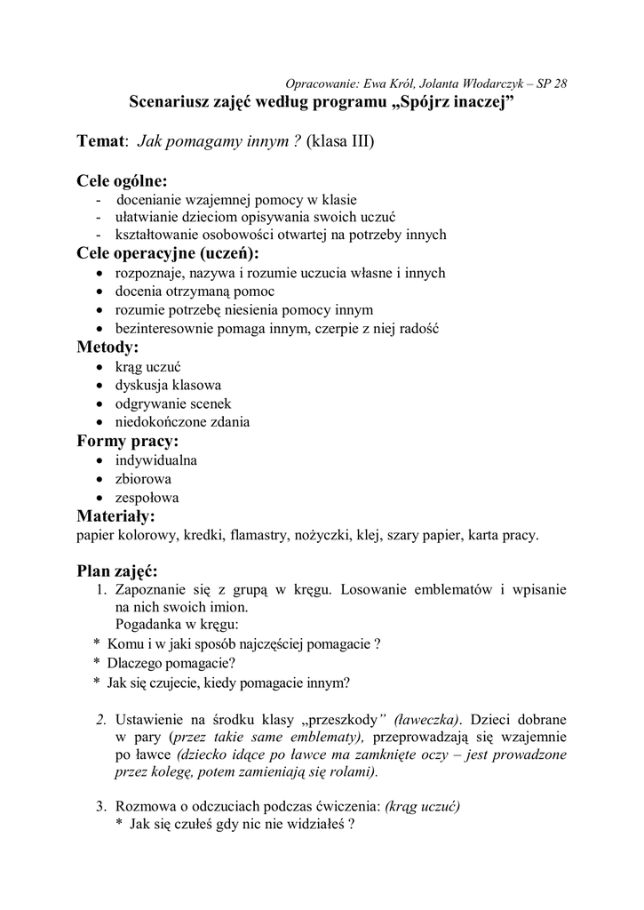Opracowanie: Ewa Król, Jolanta Włodarczyk – SP 28 Scenariusz zajęć według programu „Spójrz inaczej” Temat: Jak pomagamy innym ? (klasa III) Cele ogólne: - docenianie wzajemnej pomocy w klasie - ułatwianie dzieciom opisywania swoich uczuć - kształtowanie osobowości otwartej na potrzeby innych Cele operacyjne (uczeń): · · · · rozpoznaje, nazywa i rozumie uczucia własne i innych docenia otrzymaną pomoc rozumie potrzebę niesienia pomocy innym bezinteresownie pomaga innym, czerpie z niej radość Metody: · · · · krąg uczuć dyskusja klasowa odgrywanie scenek niedokończone zdania Formy pracy: · indywidualna · zbiorowa · zespołowa Materiały: papier kolorowy, kredki, flamastry, nożyczki, klej, szary papier, karta pracy. Plan zajęć: 1. Zapoznanie się z grupą w kręgu. Losowanie emblematów i wpisanie na nich swoich imion. Pogadanka w kręgu: * Komu i w jaki sposób najczęściej pomagacie ? * Dlaczego pomagacie? * Jak się czujecie, kiedy pomagacie innym? 2. Ustawienie na środku klasy „przeszkody” (ławeczka). Dzieci dobrane w pary (przez takie same emblematy), przeprowadzają się wzajemnie po ławce (dziecko idące po ławce ma zamknięte oczy – jest prowadzone przez kolegę, potem zamieniają się rolami). 3. Rozmowa o odczuciach podczas ćwiczenia: (krąg uczuć) * Jak się czułeś gdy nic nie widziałeś ? * Która rola bardziej ci odpowiadała - pomagającego, czy otrzymującego pomoc? 4. Odrysowanie dłoni na zielonym papierze, wycięcie oraz wpisanie na niej – Jak mogę pomóc koleżankom i kolegom w klasie? Omówienie w kręgu. Gest wyciągniętej dłoni jest symbolem pomocy. 5. Prezentacja dziecięcych życiowych sytuacji, w których dzieci pomagały innym – dyskusja. Wniosek : Sprawy innych są równie ważne jak moje własne. 6. Podsumowanie zajęć: indywidualna odpowiedź na pytania pisemne (załącznik) i odczytanie jej grupie. 7. Mocowanie „dłoni – listków” na Drzewku pomocy - symbolu pomocy w klasie.(Drzewko pomocy wykonane z brązowej bibuły, przyklejone na szarym papierze) 8. Zawieszenie drzewka w widocznym miejscu w klasie. 9. Ocena pracy zespołu, zakończenie zajęć. (Nagrodzenie zespołu – przyklejenie Słoneczka nad Drzewkiem pomocy) Załącznik: Gdy ktoś w klasie poda mi pomocną dłoń, to ............................ .................................................................................................... .................................................................................................... Gdy pomagam innym dzieciom w klasie ................................... .................................................................................................... .................................................................................................... Gdy ktoś w klasie poda mi pomocną dłoń, to ............................ .................................................................................................... .................................................................................................... Gdy pomagam innym dzieciom w klasie ................................... .................................................................................................... .................................................................................................... Gdy ktoś w klasie poda mi pomocną dłoń, to ............................ .................................................................................................... .................................................................................................... Gdy pomagam innym dzieciom w klasie ................................... ................................................................................................................. .................................................................................................................