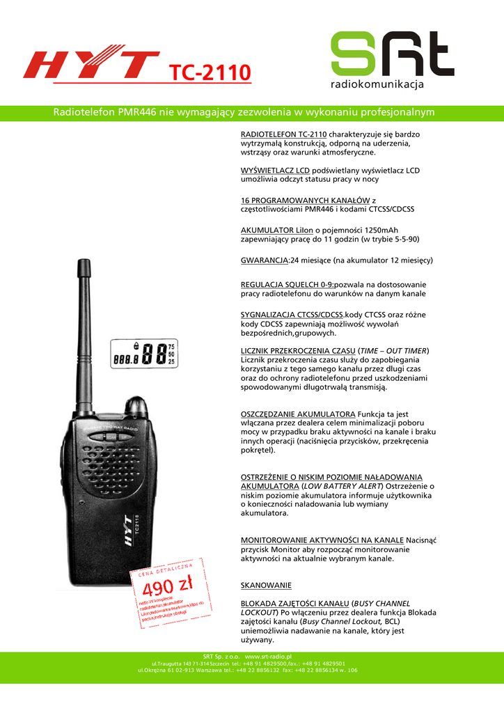 TC-2110 Radiotelefon PMR446 nie wymagający zezwolenia w wykonaniu profesjonalnym RADIOTELEFON TC-2110 charakteryzuje się bardzo wytrzymałą konstrukcją, odporną na uderzenia, wstrząsy oraz warunki atmosferyczne. WYŚWIETLACZ LCD podświetlany wyświetlacz LCD umożliwia odczyt statusu pracy w nocy 16 PROGRAMOWANYCH KANAŁÓW z częstotliwościami PMR446 i kodami CTCSS/CDCSS AKUMULATOR LiIon o pojemności 1250mAh zapewniający pracę do 11 godzin (w trybie 5-5-90) GWARANCJA:24 miesiące (na akumulator 12 miesięcy) REGULACJA SQUELCH 0-9:pozwala na dostosowanie pracy radiotelefonu do warunków na danym kanale SYGNALIZACJA CTCSS/CDCSS.kody CTCSS oraz różne kody CDCSS zapewniają możliwość wywołań bezpośrednich,grupowych. LICZNIK PRZEKROCZENIA CZASU (TIME – OUT TIMER) Licznik przekroczenia czasu służy do zapobiegania korzystaniu z tego samego kanału przez długi czas oraz do ochrony radiotelefonu przed uszkodzeniami spowodowanymi długotrwałą transmisją. OSZCZĘDZANIE AKUMULATORA Funkcja ta jest włączana przez dealera celem minimalizacji poboru mocy w przypadku braku aktywności na kanale i braku innych operacji (naciśnięcia przycisków, przekręcenia pokręteł). OSTRZEŻENIE O NISKIM POZIOMIE NAŁADOWANIA AKUMULATORA (LOW BATTERY ALERT) Ostrzeżenie o niskim poziomie akumulatora informuje użytkownika o konieczności naładowania lub wymiany akumulatora. MONITOROWANIE AKTYWNOŚCI NA KANALE Nacisnąć przycisk Monitor aby rozpocząć monitorowanie aktywności na aktualnie wybranym kanale. SKANOWANIE BLOKADA ZAJĘTOŚCI KANAŁU (BUSY CHANNEL LOCKOUT) Po włączeniu przez dealera funkcja Blokada zajętości kanału (Busy Channel Lockout, BCL) uniemożliwia nadawanie na kanale, który jest używany. SRT Sp. z o.o. www.srt-radio.pl ul.Traugutta 143 71-314 Szczecin tel.: +48 91 4829500,fax.: +48 91 4829501 ul.Okrężna 61 02-913 Warszawa tel.: +48 22 8856132 fax: +48 22 8856134 w. 106 DANE TECHNICZNE: Zakres częstotliwości Liczba kanałów Odstęp międzykanałowy Zakres temperatur Stabilność częstotliwości Odporność na warunki zewnętrzne Rozmiary Waga (z akumulatorem i anteną) Akumulator Czas pracy(w trybie 5/5/90) TC 2110 446.00625-446.09375MHz 16 12.5kHz -20 C do +60 C +-50ppm IP54 110.5 x 61 x 39.60 mm SRT Sp. z o.o. www.srt-radio.pl SRT Sp. z o.o. www.srt-radio.pl ul.Traugutta 143 71-314 Szczecin tel.: +48 91 4829500,fax.: +48 91 4829501 ul.Okrężna 61 02-913 Warszawa tel.: +48 22 8856132 fax: +48 22 8856134 w. 106 ul.Traugutta 143 71-314 Szczecin tel.: +48 91 4829500,fax.: +48 91 4829501 ul.Okrężna 61 02-913 Warszawa tel.: +48 22 8856132 fax: +48 22 8856134 w. 106 270 g 1250mAh 11 godzin Nadajnik Moc wyjściowa Modulacja Harmoniczne Szum FM Zniekształcenia 0,5W ERP F3E 36dBm 40dB <=5% Odbiornik Czułość Selektywność Intermodulacja S/N Moc wyjściowa Audio 0,25µV 60dB 60dB 60dB 500mW AKCESORIA NA WYPOSAŻENIU : AKCESORIA DODATKOWE: HYT© jest zastrzeżonym znakiem towarowym Shenzhen HYT Science & Technologie Co.Ltd. ©2006 HYT,Co.Ltd. Wszelkie prawa zastrzeżone.
