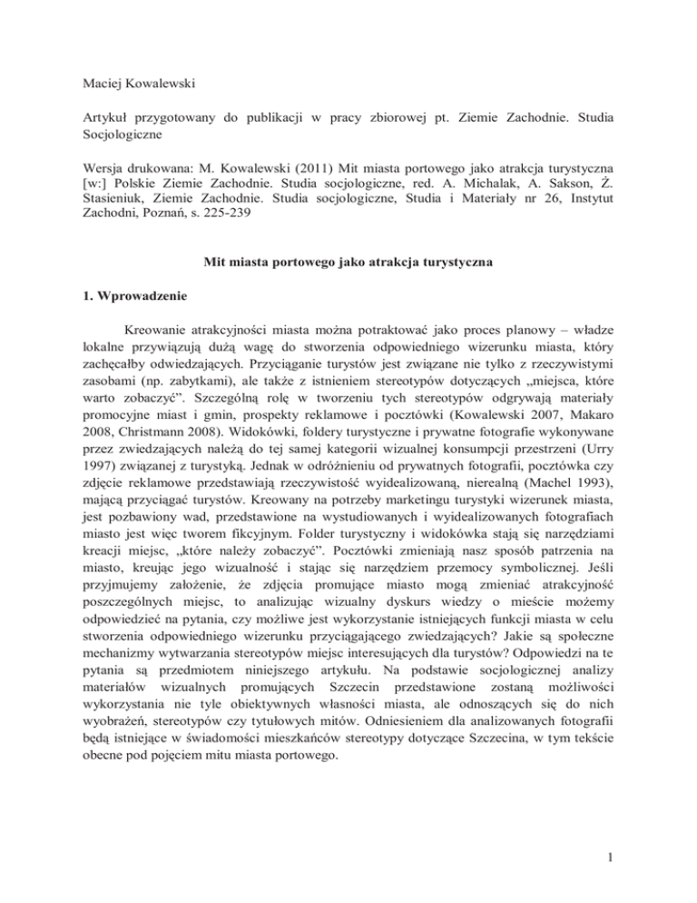 Maciej Kowalewski Artykuł przygotowany do publikacji w pracy zbiorowej pt. Ziemie Zachodnie. Studia Socjologiczne Wersja drukowana: M. Kowalewski (2011) Mit miasta portowego jako atrakcja turystyczna [w:] Polskie Ziemie Zachodnie. Studia socjologiczne, red. A. Michalak, A. Sakson, Ż. Stasieniuk, Ziemie Zachodnie. Studia socjologiczne, Studia i Materiały nr 26, Instytut Zachodni, Poznań, s. 225-239 Mit miasta portowego jako atrakcja turystyczna 1. Wprowadzenie Kreowanie atrakcyjności miasta można potraktować jako proces planowy – władze lokalne przywiązują dużą wagę do stworzenia odpowiedniego wizerunku miasta, który zachęcałby odwiedzających. Przyciąganie turystów jest związane nie tylko z rzeczywistymi zasobami (np. zabytkami), ale także z istnieniem stereotypów dotyczących „miejsca, które warto zobaczyć”. Szczególną rolę w tworzeniu tych stereotypów odgrywają materiały promocyjne miast i gmin, prospekty reklamowe i pocztówki (Kowalewski 2007, Makaro 2008, Christmann 2008). Widokówki, foldery turystyczne i prywatne fotografie wykonywane przez zwiedzających należą do tej samej kategorii wizualnej konsumpcji przestrzeni (Urry 1997) związanej z turystyką. Jednak w odróżnieniu od prywatnych fotografii, pocztówka czy zdjęcie reklamowe przedstawiają rzeczywistość wyidealizowaną, nierealną (Machel 1993), mającą przyciągać turystów. Kreowany na potrzeby marketingu turystyki wizerunek miasta, jest pozbawiony wad, przedstawione na wystudiowanych i wyidealizowanych fotografiach miasto jest więc tworem fikcyjnym. Folder turystyczny i widokówka stają się narzędziami kreacji miejsc, „które należy zobaczyć”. Pocztówki zmieniają nasz sposób patrzenia na miasto, kreując jego wizualność i stając się narzędziem przemocy symbolicznej. Jeśli przyjmujemy założenie, że zdjęcia promujące miasto mogą zmieniać atrakcyjność poszczególnych miejsc, to analizując wizualny dyskurs wiedzy o mieście możemy odpowiedzieć na pytania, czy możliwe jest wykorzystanie istniejących funkcji miasta w celu stworzenia odpowiedniego wizerunku przyciągającego zwiedzających? Jakie są społeczne mechanizmy wytwarzania stereotypów miejsc interesujących dla turystów? Odpowiedzi na te pytania są przedmiotem niniejszego artykułu. Na podstawie socjologicznej analizy materiałów wizualnych promujących Szczecin przedstawione zostaną możliwości wykorzystania nie tyle obiektywnych własności miasta, ale odnoszących się do nich wyobrażeń, stereotypów czy tytułowych mitów. Odniesieniem dla analizowanych fotografii będą istniejące w świadomości mieszkańców stereotypy dotyczące Szczecina, w tym tekście obecne pod pojęciem mitu miasta portowego. 1 2. Obrazy, symbole, mity – miasto portowe w świadomości społecznej W naukach społecznych (a szczególnie w tradycji strukturalistycznej) podkreślany jest związek kultury ze strukturą społeczną i interesami warstw posiadających władzę. Strukturaliści podkreślają, że symbole i ich znaczenia są przedmiotem w grze o panowanie (Foucault 2002, Bourdieu 2005). Socjologowie miasta związani z tradycją makrostrukturalną wskazują, że interesy elit miejskich wymuszają takie działania w sferze kultury, które będą legitymizować ich władzę (Gottdiener, Hutchison 2000). Ponieważ wyobrażenia mieszkańców i osób z zewnątrz o mieście budowane są przez symbole (Szczepański 2002, Pirveli 2005), to miejska symbolika staje się przedmiotem oddziaływań władzy. Przykładem takich działań są planowe działania systemu szkolnictwa, instytucji kulturalnych na rzecz budowania i wspierania cech określających tożsamość czy wizerunek miasta (Łaska 2006). W ujęciu nauk społecznych, to „jakie miasto jest” odnosi się przede wszystkim do obrazu miasta istniejącego w świadomości społecznej. Pojęcie„miasto portowe” nie ogranicza się tylko do funkcji ekonomicznych czy zatrudnienia ludności w gospodarce morskiej. Dla socjologa miasto portowe to takie, w którym obecność portu związana jest (jako przyczyna lub konsekwencja) z faktami społecznymi (Woźniak 2001). Zależność pomiędzy stanem faktycznym a postrzeganym nie jest tutaj najważniejsza - to, czym jest miasto portowe dla ekonomisty, czy geografa nie musi pokrywać się z wyobrażeniami, jakie posiadają mieszkańcy i turyści, które składają się na społeczny wizerunek miasta portowego. Taka analiza ma już swoje doświadczenia: przykładowo, G. Quilley (2000) podejmuje zagadnienie obecności ikonografii związanej z morzem w brytyjskiej kulturze wizualnej. Wg tegoż autora, sztuka marynistyczna jest ważną częścią brytyjskiej tożsamości kulturowej i historii, które bez wizualnych reprezentacji nie mogą przetrwać. Socjologiczna analiza obrazów odnoszących się do wizerunku miasta portowego wymaga zatem pochylenia się nad przedstawieniami o masowym charakterze, które mogą się znawcom sztuki wydawać bez wartości. W opisywanym paradygmacie analitycznym kiczowaty obrazek prezentujący statek na morzu lub rybaków przy pracy jest znakiem reprezentującym ważne procesy, wskazującym na miejsce i znaczenie morza w życiu badanego społeczeństwa. Symboliczna reprezentacja regionu tworzona jest zarówno spontanicznie, (oddolnie) i instytucjonalnie (odgórnie). Jeżeli posługujemy się taką konstrukcją jak „miasto portowe” (w oderwaniu od socjologicznego, czy geograficznego znaczenia tego terminu) to wskazać możemy pewne elementy „naturalne” i „sztuczne” w tej konstrukcji. Pojęcie mitu wydaje się być szczególnie przydatne do analizy tego dualizmu. W socjologii mit jest traktowany jako kategoria kultury, forma świadomości społecznej lokująca się poza prawdą i fałszem, próba wyjaśnienia świata (Tarkowska 1999). Jedną z bardziej istotnych funkcji mitu jest tworzenie tożsamości zbiorowej, budowanej w oparciu o kolektywne wyobrażenia. Struktura 