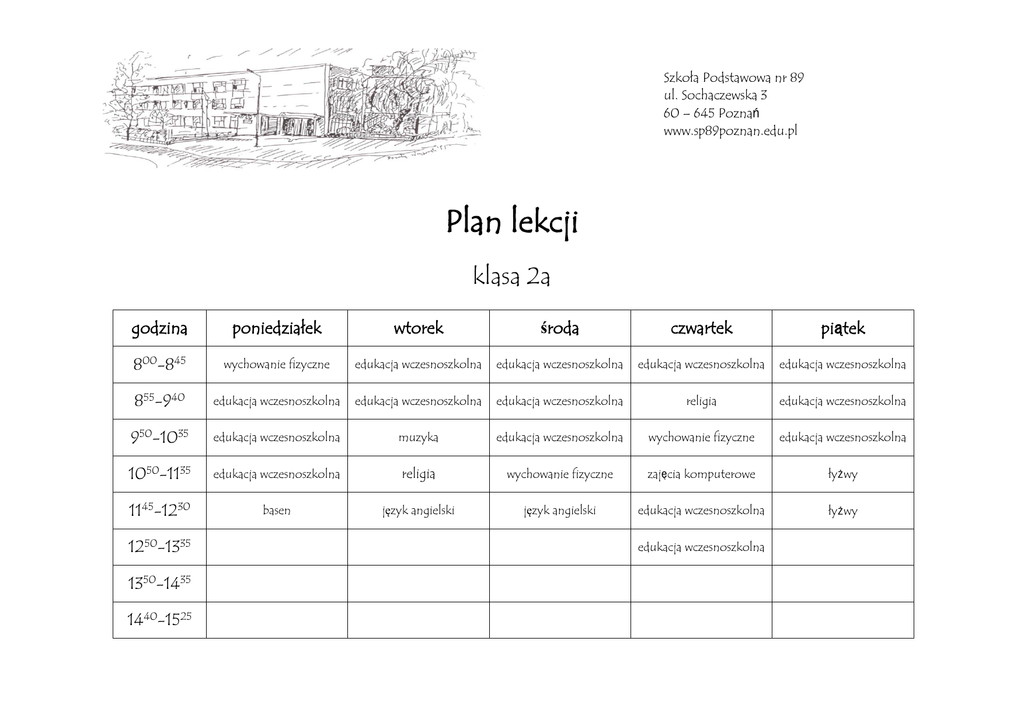 Szkoła Podstawowa nr 89 ul. Sochaczewska 3 60 – 645 Poznań www.sp89poznan.edu.pl Plan lekcji klasa 2a godzina poniedziałek wtorek środa czwartek piątek 800-845 wychowanie fizyczne edukacja wczesnoszkolna edukacja wczesnoszkolna edukacja wczesnoszkolna edukacja wczesnoszkolna 855-940 edukacja wczesnoszkolna edukacja wczesnoszkolna edukacja wczesnoszkolna religia edukacja wczesnoszkolna 950-1035 edukacja wczesnoszkolna muzyka edukacja wczesnoszkolna wychowanie fizyczne edukacja wczesnoszkolna 1050-1135 edukacja wczesnoszkolna religia wychowanie fizyczne zajęcia komputerowe łyżwy 1145-1230 basen język angielski język angielski edukacja wczesnoszkolna łyżwy 1250-1335 1350-1435 1440-1525 edukacja wczesnoszkolna