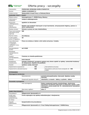 Oferta pracy - szczegóły Stanowisko: POMOCNIK OPIEKUNA OSÓB STARSZYCH Numer: 10000-1124928037-S Dodane przez: Wojewódzki Urząd Pracy w Zielonej Górze WARUNKI PRACY I PŁACY Miejsce pracy: Hutungstrasse 7, 03096 Burg, Niemcy Informacje o lokalizacji: miejsce oddelegowania Przyczyna oddelegowania: zgodnie ze zleceniem Zakres obowiązków: Opieka nad osobami starszymi w tym karmienie, utrzymywanie higieny, pomoc w życiu codziennym. Rodzaj umowy: Umowa o pracę na czas nieokreślony Praca tymczasowa oferowana przez agencję: NIE Wymiar etatu: nie dotyczy Liczba godzin pracy w tygodniu: 30 Inne informacje (informacje o systemie i rozkładzie czasu pracy): Praca na zmiany a także w dni wolne od pracy i święta. Wynagrodzenie brutto: od 9 EUR Wysokość wynagrodzenia netto: System wynagradzania: Czasowy ze stawką godzinową Premie: brak danych Dodatkowe świadczenia: Istnieje możliwość wynajęcia pokoju przy domu opieki za opłatą, samochód słuzbowy do dyspozycji, dopłata do posiłków. Zawód: opiekun osoby starszej* Zapewnienie wyżywienia: NIE Zatrudnienie od zaraz: Zapewnienie zakwaterowania: NIE Pracodawca pokrywa koszt przejazdu do NIE Polski: WYMAGANIA Wymagania konieczne: Wykształcenie: pomaturalne/policealne, kierunek: Opiekun osoby starszej Znajomość języków obcych: niemiecki, w mowie - dobry, w piśmie - dobry Pozostałe wymagania: Inne wymagania: Dobra znajomość języka niemieckiego, ukończone dwuletnie strudnium policealne na kierunku opieku osób starszych, prawo jazdy kat. B., doświadczenie zawodowe wymagane Staż pracy ogółem: lata: 4 DANE PRACODAWCY: Pracodawca: Pflegeverein Spreewald e.V. Krótki opis działalności gospodarczej: Firma zajmująca się opieką ambulatoryjną i stacjonarną Nr KRAZ: Sposób aplikowania: bezpośrednio do pracodawcy Adres: Pflegeverein Spreewald e.V. Frau Fiebig Hutungstrasse 7 03096 Burg Wygenerowano w dniu 2016-12-02 r. Osoba do kontaktu: Numer telefonu: E-mail: Język aplikacji: niemiecki Wymagane dokumenty: CV Sposób kontaktu / przekazania dokum.: pocztą tradycyjną Dodatkowe informacje dotyczące aplikowania: POZOSTAŁE DANE: Liczba miejsc pracy: 1 Przeznaczone wyłącznie dla osób zarejestrowanych w urzędzie pracy: NIE w tym dla niepełnosprawnych: 0 Przeznaczone dla osób niepełnosprawnych (finansowanie z PFRON): NIE Data dodania: 08.11.2016 Możliwe przekazanie do realizacji przez inny PUP: NIE Data aktualizacji: 30.11.2016 Data udostępnienia na portalu Europejskich Służb Zatrudnienia: Data ważności: W przypadku zagranicznych ofert pracy umowa z zagranicznym pracodawcą jest, co do zasady, zawierana zgodnie z prawem obowiązującym w kraju zatrudnienia. Wszystkie roszczenia odnośnie warunków wynikających z umowy można kierować do odpowiedniego sądu w kraju zatrudnienia. Ministerstwo Pracy i Polityki Społecznej, wojewódzkie i powiatowe urzędy pracy, Ochotnicze Hufce Pracy oraz podmioty akredytowane do prowadzenia pośrednictwa pracy w ramach sieci EURES w Polsce, nie mogą pośredniczyć ani reprezentować poszkodowanego w sądzie kraju zatrudnienia, w przypadku zaistnienia sporu z pracodawcą zagranicznym. Wygenerowano w dniu 2016-12-02 r.
