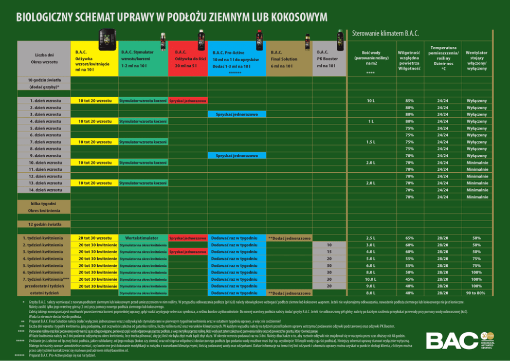 BIOLOGICZNY SCHEMAT UPRAWY W PODŁOŻU ZIEMNYM LUB KOKOSOWYM Sterowanie klimatem B.A.C. Wilgotność względna powietrza Wilgotność Temperatura pomieszczenia/ rośliny Dzień-noc ºC Wentylator stojący włączony/ wyłączony 85% 24/24 Wyłączony 80% 24/24 Wyłączony 80% 24/24 Wyłączony 80% 24/24 Wyłączony 5. dzień wzrostu 75% 24/24 Wyłączony 6. dzień wzrostu 75% 24/24 Wyłączony 75% 24/24 Wyłączony 75% 24/24 Wyłączony 70% 24/24 Wyłączony 70% 24/24 Minimalnie 11. dzień wzrostu 70% 24/24 Minimalnie 12. dzień wzrostu 70% 24/24 Minimalnie 70% 24/24 Minimalnie 70% 24/24 Minimalnie 70% 24/24 Minimalnie Liczba dni Okres wzrostu B.A.C. B.A.C. Stymulator B.A.C. B.A.C. Pro-Active B.A.C. B.A.C. Odżywka wzrost/kwitnięcie ml na 10 l wzrostu/korzeni Odżywka do liści 10 ml na 1 l do oprysków Final Solution PK Booster 1-2 ml na 10 l 20 ml na 5 l Dodać 1-3 ml na 10 l 6 ml na 10 l ml na 10 l Ilość wody (parowanie rośliny) na m2 **** ****** 18 godzin światła (dodać grzyby)* 1. dzień wzrostu 10 tot 20 wzrostu 10 L Stymulator wzrostu korzeni Spryskać jednorazowo 2. dzień wzrostu Spryskać jednorazowo 3. dzień wzrostu 4. dzień wzrostu 7. dzień wzrostu 10 tot 20 wzrostu 10 tot 20 wzrostu 1L Stymulator wzrostu korzeni 1.5 L Stymulator wzrostu korzeni 8. dzień wzrostu Spryskać jednorazowo 9. dzień wzrostu 10. dzień wzrostu 13. dzień wzrostu 10 tot 20 wzrostu 10 tot 20 wzrostu 2.0 L Stymulator wzrostu korzeni 2.0 L Stymulator wzrostu korzeni 14. dzień wzrostu kilka tygodni Okres kwitnienia 12 godzin światła Wortelstimulator Dodawać raz w tygodniu 1. tydzień kwitnienia 20 tot 30 wzrostu 2.5 L 65% 28/20 50% 2. tydzień kwitnienia 20 tot 30 kwitnienie Stymulator na okres kwitnienia Dodawać raz w tygodniu 10 3.0 L 60% 28/20 50% 3. tydzień kwitnienia 20 tot 30 kwitnienie Stymulator na okres kwitnienia Spryskać jednorazowo Dodawać raz w tygodniu 15 4.0 L 60% 28/20 50% 4. tydzień kwitnienia 20 tot 30 kwitnienie Stymulator na okres kwitnienia Dodawać raz w tygodniu 20 5.0 L 55% 28/20 75% 5. tydzień kwitnienia 20 tot 30 kwitnienie Stymulator na okres kwitnienia Dodawać raz w tygodniu 30 6.0 L 55% 28/20 75% 6. tydzień kwitnienia 20 tot 30 kwitnienie Stymulator na okres kwitnienia Dodawać raz w tygodniu 30 8.0 L 50% 28/20 100% 7. tydzień kwitnienia*** 20 tot 30 kwitnienie Stymulator na okres kwitnienia Dodawać raz w tygodniu 30 10.0 L 45% 28/20 100% 20 tot 30 kwitnienie Stymulator na okres kwitnienia Dodawać raz w tygodniu 20 9.0 L 40% 28/20 100% Stymulator na okres kwitnienia Dodawać raz w tygodniu 8.0 L 40% 28/20 90 to 80% przedostatni tydzień ostatni tydzień * ** *** **** ***** ****** Spryskać jednorazowo **Dodać jednorazowo **Dodać jednorazowo Grzyby B.A.C. należy wymieszać z nowym podłożem ziemnym lub kokosowym przed umieszczeniem w nim rośliny. W przypadku odkwaszania podłoża (pH 6,0) należy obowiązkowo wzbogacić podłoże ziemne lub kokosowe wapnem. Jeżeli nie wykonujemy odkwaszania, nawożenie podłoża ziemnego lub kokosowego nie jest konieczne. Należy zasilić tylko jego warstwę górną (2 cm) przy pomocy nowego podłoża ziemnego lub kokosowego. Zaletą takiego rozwiązania jest możliwość pozostawienia korzeni poprzedniej uprawy, gdyż nadal występuje wówczas symbioza, a roślina bardzo szybko odrośnie. Do nowej warstwy podłoża należy dodać grzyby B.A.C. Jeżeli nie odkwaszamy pH gleby, należy po każdym zasileniu przepłukać przewody przy pomocy wody odkwaszonej (6,0). Woda ta nie może dostać się do podłoża. Preparat B.A.C. Final Solution należy dodać wyłącznie jednorazowo wraz z odżywką lub stymulatorami w pierwszym tygodniu kwitnienia oraz w ostatnim tygodniu uprawy, a więc nie codziennie! Liczba dni wzrostu i tygodni kwitnienia, jaką podajemy, jest oczywiście zależna od gatunku rośliny, liczby roślin na m2 oraz warunków klimatycznych. W każdym wypadku należy na tydzień przed końcem uprawy wstrzymać podawanie odżywki podstawowej oraz odżywki PK Booster. Parowanie rośliny oraz ilość podawanej wody na m2 są ze sobą powiązane, ponieważ część wody odparowuje poprzez podłoże, a więc nie tylko poprzez roślinę. Ilość wody jest zatem zależna od parowania rośliny oraz od powierzchni gruntu, który również paruje. W fazie kwitnienia należy co 2 dni podawać odżywkę na okres kwitnienia, lecz trzeba pilnować, aby jej ilość nie była zbyt mała bądź zbyt duża. W okresie wzrostu podawać raz na 3 dni. Należy dbać także o to, aby roztwór odżywki nie znajdował się w naczyniu przez czas dłuższy niż 48 godzin. Zwilżanie jest zależne od łącznej ilości podłoża, jakie rozkładamy, od jego rodzaju (kokos czy ziemia) oraz od stopnia wilgotności dostarczonego podłoża (po podaniu wody możliwe musi być np. wyciśnięcie 10 kropli wody z garści podłoża). Niniejszy schemat uprawy stanowi wyłącznie wytyczną. Dlatego też należy zawsze samodzielnie oceniać, czy konieczne jest dokonanie modyfikacji w związku z warunkami klimatycznymi, ilością podawanej wody oraz odżywkami. Dalsze informacje na temat tej linii odżywek i schematu uprawy można uzyskać w punkcie obsługi klienta, z którym można przez cały tydzień kontaktować się mailowo pod adresem [email protected]. Preparat B.A.C. Pro-Active podaje się raz na tydzień.