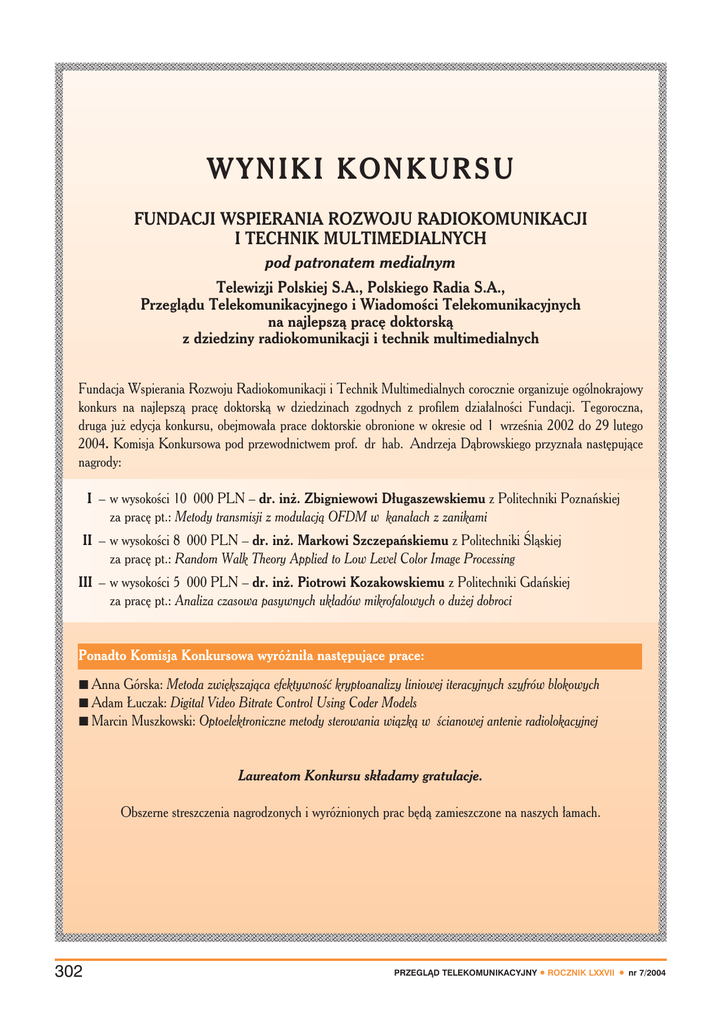 WYNIKI KONKURSU FUNDACJI WSPIERANIA ROZWOJU RADIOKOMUNIKACJI I TECHNIK MULTIMEDIALNYCH pod patronatem medialnym Telewizji Polskiej S.A., Polskiego Radia S.A., Przeglądu Telekomunikacyjnego i Wiadomości Telekomunikacyjnych na najlepszą pracę doktorską z dziedziny radiokomunikacji i technik multimedialnych Fundacja Wspierania Rozwoju Radiokomunikacji i Technik Multimedialnych corocznie organizuje ogólnokrajowy konkurs na najlepszą pracę doktorską w dziedzinach zgodnych z profilem działalności Fundacji. Tegoroczna, druga już edycja konkursu, obejmowała prace doktorskie obronione w okresie od 1 września 2002 do 29 lutego 2004. Komisja Konkursowa pod przewodnictwem prof. dr hab. Andrzeja Dąbrowskiego przyznała następujące nagrody: I – w wysokości 10 000 PLN – dr. inż. Zbigniewowi Długaszewskiemu z Politechniki Poznańskiej za pracę pt.: Metody transmisji z modulacją OFDM w kanałach z zanikami II – w wysokości 8 000 PLN – dr. inż. Markowi Szczepańskiemu z Politechniki Śląskiej za pracę pt.: Random Walk Theory Applied to Low Level Color Image Processing III – w wysokości 5 000 PLN – dr. inż. Piotrowi Kozakowskiemu z Politechniki Gdańskiej za pracę pt.: Analiza czasowa pasywnych układów mikrofalowych o dużej dobroci Ponadto Komisja Konkursowa wyróżniła następujące prace: O Anna Górska: Metoda zwiększająca efektywność kryptoanalizy liniowej iteracyjnych szyfrów blokowych O Adam Łuczak: Digital Video Bitrate Control Using Coder Models O Marcin Muszkowski: Optoelektroniczne metody sterowania wiązką w ścianowej antenie radiolokacyjnej Laureatom Konkursu składamy gratulacje. Obszerne streszczenia nagrodzonych i wyróżnionych prac będą zamieszczone na naszych łamach. 302 PRZEGLĄD TELEKOMUNIKACYJNY ! ROCZNIK LXXVII ! nr 7/2004