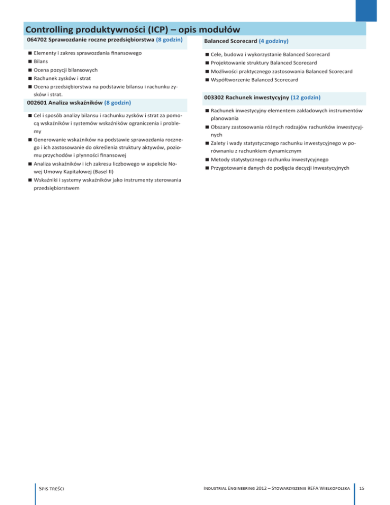 Controlling produktywności (ICP) – opis modułów 064702 Sprawozdanie roczne przedsiębiorstwa (8 godzin) Balanced Scorecard (4 godziny) Elementy i zakres sprawozdania finansowego Cele, budowa i wykorzystanie Balanced Scorecard Bilans Projektowanie struktury Balanced Scorecard Ocena pozycji bilansowych Możliwości praktycznego zastosowania Balanced Scorecard Rachunek zysków i strat Współtworzenie Balanced Scorecard Ocena przedsiębiorstwa na podstawie bilansu i rachunku zysków i strat. 002601 Analiza wskaźników (8 godzin) Cel i sposób analizy bilansu i rachunku zysków i strat za pomocą wskaźników i systemów wskaźników ograniczenia i problemy Generowanie wskaźników na podstawie sprawozdania rocznego i ich zastosowanie do określenia struktury aktywów, poziomu przychodów i płynności finansowej Analiza wskaźników i ich zakresu liczbowego w aspekcie Nowej Umowy Kapitałowej (Basel II) 003302 Rachunek inwestycyjny (12 godzin) Rachunek inwestycyjny elementem zakładowych instrumentów planowania Obszary zastosowania różnych rodzajów rachunków inwestycyjnych Zalety i wady statystycznego rachunku inwestycyjnego w porównaniu z rachunkiem dynamicznym Metody statystycznego rachunku inwestycyjnego Przygotowanie danych do podjęcia decyzji inwestycyjnych Wskaźniki i systemy wskaźników jako instrumenty sterowania przedsiębiorstwem Spis treści Industrial Engineering 2012 – Stowarzyszenie REFA Wielkopolska 15