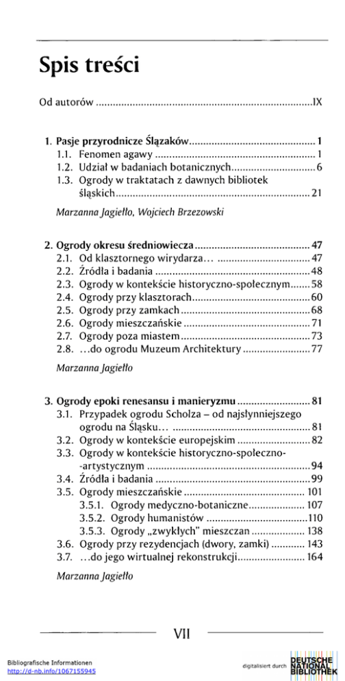 Spis treści Od autorów IX 1. Pasje przyrodnicze Ślązaków 1.1. Fenomen agawy 1.2. Udział w badaniach botanicznych 1.3. Ogrody w traktatach z dawnych bibliotek śląskich 1 1 6 21 Marzanna Jagiełło, Wojciech Brzezowski 2. Ogrody okresu średniowiecza 2.1. Od klasztornego wirydarza 2.2. Źródła i badania 2.3. Ogrody w kontekście historyczno-społecznym 2.4. Ogrody przy klasztorach 2.5. Ogrody przy zamkach 2.6. Ogrody mieszczańskie 2.7. Ogrody poza miastem 2.8. ...do ogrodu Muzeum Architektury 47 47 48 58 60 68 71 73 77 Marzanna Jagiełło 3. Ogrody epoki renesansu i manieryzmu 3.1. Przypadek ogrodu Scholza - od najsłynniejszego ogrodu na Śląsku 3.2. Ogrody w kontekście europejskim 3.3. Ogrody w kontekście historyczno-społeczno-artystycznym 3.4. Źródła i badania 3.5. Ogrody mieszczańskie 3.5.1. Ogrody medyczno-botaniczne 3.5.2. Ogrody humanistów 3.5.3. Ogrody „zwykłych" mieszczan 3.6. Ogrody przy rezydencjach (dwory, zamki) 3.7. .. .do jego wirtualnej rekonstrukcji Marzanna Jagiełło VII http://d-nb.info/1067155945 81 81 82 94 99 101 107 110 138 143 164 4. Założenia ogrodowe 2. pol. XVII w. (okres przejściowy - ku barokowi) 4.1. Przypadek Gorzanowa od wyrafinowanego ogrodu pałacowego 4.2. Ogrody w kontekście historyczno-społeczno-artystycznym 4.3. Źródła i badania 4.4. Ogrody mieszczańskie 4.5. Ogrody przy rezydencjach 4.6. ...do skromnego parku przy Muzeum Hrabstwa Kłodzkiego 171 171 172 173 174 186 244 Marzanna Jagiełło, Wojciech Brzezowski 5. Flora ogrodów śląskich 5.1. Katalog roślin z ogrodu J. Woyssela 5.2. Katalog roślin z ogrodu L. Scholza 5.3. Katalog ofertowy kwiatów z ogrodu D. Albrechta 5.4. Katalog cytrusów z ogrodu C.W. Scultetusa 5.5. Przedstawienia roślin z albumu J.S. von Haunolda 245 246 252 276 279 291 Marzanna Jagiełło (współpraca: Wojciech Brzezowski, Aleksandra Hoffmann-Marszałek, Karolina Lontkowska, Katarzyna Pietras) 6. Bibliografia 295 7. Indeks nazwisk 303 8. Indeks nazw geograficznych i topograficznych 310 9. Spis i źródła ilustracji 315 10. Streszczenie w języku angielskim/Summary 339 (Jacek Jabłoński) 11. Streszczenie w języku niemieckim/ Zusammenfassung (Aleksandra Hojfmann-Marszałek) 345