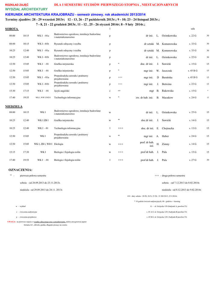 DLA I SEMESTRU STUDIÓW PIERWSZEGO STOPNIA , NIESTACJONARNYCH ROZKŁAD ZAJĘĆ WYDZIAŁ ARCHITEKTURY KIERUNEK ARCHITEKTURA KRAJOBRAZU - semestr zimowy. rok akademicki 2013/2014 Terminy zjazdów: 28 - 29 wrzesień 2013r; 12 - 13, 26 - 27 październik 2013r.; 9 - 10; 23 - 24 listopad 2013r.; 7 - 8, 21 - 22 grudzień 2013r, 11 - 12 , 25 - 26 styczeń 2014r; 8 - 9 luty 2014r.; l SOBOTA 08:00 10:15 WK I - 01a Budownictwo ogrodowe, instalacje budowlane i materiałoznawstwo 08:00 10:15 WK I - 01b Rysunek odręczny i rzeźba 10:25 12:40 WK I - 01a sala Ozimkowska s. 22 G 30 p dr sztuki M. Komorowska s. 33 G 30 Rysunek odręczny i rzeźba p dr sztuki M. Komorowska s. 33 G 30 p p 10:25 12:40 WK I - 01b Budownictwo ogrodowe, instalacje budowlane i materiałoznawstwo 12:50 15:05 WK I - 01 Grafika inżynierska p 12:50 15:05 WK I - 01 Grafika inżynierska 12:50 15:05 WK I - 01a 12:50 15:05 WK I - 01b 15:30 17:15 WK I - 01 17:40 19:55 WK I, WW I,WD I 08:00 10:15 WK I 10:25 12:40 10:25 dr inż. L. dr inż. L. Ozimkowska s. 22 G 30 ''' doc. dr inż. J. Sawicki s. 15 G 15 p ''' mgr inż. W. Jaszczuk s. 45 B G 15 p +++ mgr inż. D Barańska s. 45 B G 15 p +++ mgr inż. J. Botwina s. 23 G 15 Język angielski ć ### Rakowska s. 15 G * Technologia informacyjna w ''' Budownictwo ogrodowe, instalacje budowlane i materiałoznawstwo w WK I ZB I Grafika inżynierska w 12:40 WK I - 01 Technologia informacyjna 12:50 15:05 WK I Propedeudyka zawodu i podstawy projektowania 12:50 15:05 15:15 17:30 WK I 17:40 19:55 WK I - 01 Propedeudyka zawodu i podstawy projektowania Propedeudyka zawodu i podstawy projektowania mgr B. prof. zw. dr hab. inż. B. Macukow s. 24 G 15 dr inż. L. Ozimkowska s. 25 G 15 ''' doc.dr inż. J. Sawicki s. 14 G 15 l +++ doc. dr inż. E. Chojnacka s. 13 G 15 w ''' mgr inż. A. Haber s. 24 G 15 w +++ prof. dr hab. inż. H. Zimny s. 14 G 15 Biologia i fizjologia roślin w +++ prof dr hab. J. Pala s. 15 G 15 Biologia i fizjologia roślin l +++ prof dr hab. J. Pala s. 27 G 30 NIEDZIELA WK I, ZB I, WD I Ekologia OZNACZENIA: '''' - pierwsza połowa semestru +++ - druga połowa semestru sobota - od 28.09.2013 do 23.11.2013r. sobota - od 7.12.2013 do 8.02.2014r. niedziela - od 29.09.2013 do 24.11. 2013r. niedziela - od 8.12.2013 do 9.02.2014r. ### - daty sobota - 28 IX, 26 X, 23 XI, 21 XII 2013, 25 I 2014r. * 10 godzin ćwiczeń audytoryjnych, 40 - godzin e - learning w - wykład G. - ul. Grójecka 128 (budynek A, pawilon 53) ć - ćwiczenia audytoryjne s. 45 A G ul. Grójecka 128 ( budynek B pawilon 33) p - ćwiczenia projektowe s. 45 B G ul. Grójecka 128 ( budynek B pawilon 33) UWAGA: na pierwsze zajęcia z rysunku odręcznego oraz z projektowania należy przygotować papier formatu A3 , ołówek, gumkę, długopis piszący na czarno.