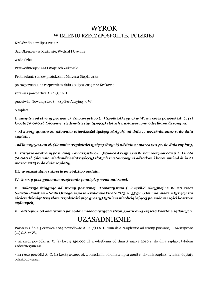 WYROK W IMIENIU RZECZYPOSPOLITEJ POLSKIEJ Kraków dnia 27 lipca 2015 r. Sąd Okręgowy w Krakowie, Wydział I Cywilny w składzie: Przewodniczący: SSO Wojciech Żukowski Protokolant: starszy protokolant Marzena Stępkowska po rozpoznaniu na rozprawie w dniu 20 lipca 2015 r. w Krakowie sprawy z powództwa A. C. (1) i S. C. przeciwko Towarzystwo (...) Spółce Akcyjnej w W. o zapłatę I. zasądza od strony pozwanej Towarzystwo (...) Spółki Akcyjnej w W. na rzecz powódki A. C. (1) kwotę 70.000 zł. (słownie: siedemdziesiąt tysięcy) złotych z ustawowymi odsetkami liczonymi: - od kwoty 40.000 zł. (słownie: czterdzieści tysięcy złotych) od dnia 17 września 2010 r. do dnia zapłaty, - od kwoty 30.000 zł. (słownie: trzydzieści tysięcy złotych) od dnia 21 marca 2013 r. do dnia zapłaty, II. zasądza od strony pozwanej Towarzystwo (...) Spółce Akcyjnej w W. na rzecz powoda S. C. kwotę 70.000 zł. (słownie: siedemdziesiąt tysięcy) złotych z ustawowymi odsetkami liczonymi od dnia 21 marca 2013 r. do dnia zapłaty, III. w pozostałym zakresie powództwo oddala, IV. koszty postępowania wzajemnie pomiędzy stronami znosi, V. nakazuje ściągnąć od strony pozwanej Towarzystwa (...) Spółki Akcyjnej w W. na rzecz Skarbu Państwa – Sądu Okręgowego w Krakowie kwotę 7173 zł. 35 gr. (słownie: siedem tysięcy sto siedemdziesiąt trzy złote trzydzieści pięć groszy) tytułem nieobciążającej powodów części kosztów sądowych, VI. odstępuje od obciążania powodów nieobciążającą strony pozwanej częścią kosztów sądowych. UZASADNIENIE Pozwem z dnia 5 czerwca 2014 powodowie A. C. (1) i S. C. wnieśli o zasądzenie od strony pozwanej Towarzystwo (...) S.A. w W., - na rzecz powódki A. C. (1) kwotę 150.000 zł. z odsetkami od dnia 3 marca 2010 r. do dnia zapłaty, tytułem zadośćuczynienia, - na rzecz powódki A. C. (1) kwotę 25.000 zł. z odsetkami od dnia 4 lipca 2008 r. do dnia zapłaty, tytułem dopłaty odszkodowania, - na rzecz powódki A. C. (1) kwotę 2832,44 zł. z odsetkami od dnia 18 maja 2009 r. do dnia zapłaty tytułem dopłaty refundacji kosztów wykonania nagrobka, - na rzecz powoda S. C. kwotę 150.000 zł. z odsetkami od dnia 3 marca 2010 r. do dnia zapłaty, tytułem zadośćuczynienia, - na rzecz powoda S. C. kwotę 30.000 zł. z odsetkami od dnia 12 czerwca 2008 r. do dnia zapłaty, tytułem dopłaty odszkodowania, oraz o zasądzenie od pozwanej na rzecz powodów zwrotu kosztów postępowania. Na uzasadnienie pozwu podano, że w dniu 21 października 2007 roku miał miejsce wypadek samochodowy, w wyniku którego śmierć poniosła spółka powodów K. C. (1). Do dnia tragicznego zdarzenia życie powodów było uporządkowane i skoncentrowane na zapewnieniu godnego życia rodzinie i wychowywaniu dzieci. Powódka prowadziła od 2004 roku działalność gospodarczą obejmującą transport drogowy towarów oraz była zatrudniona. Powódce w prowadzeniu działalności pomagał w dużym zakresie powód S. C.. K. C. (1), podczas gdy rodzice własną aktywność angażowali w prowadzenie działalności gospodarczej oraz świadczenie pracy, opiekowała się rodzeństwem, a w przyszłości miała pozostać w domu rodzinnym aby wspierać rodziców i opiekować się po śmierci. Wskutek śmierci córki powodowie doświadczyli nagłego i bardzo poważnego załamania zdrowia psychicznego. Powódka nie była w stanie kontynuować prowadzenia działalności gospodarczej, którą wyrejestrowała w 2008 r. Powódka zarejestrowała się w poradni zdrowia psychicznego 7 listopada 2007 roku i w leczeniu psychiatrycznym neurologicznym pozostaje do dzisiaj. W leczeniu psychiatrycznym pozostaje również powód, który został uznany decyzją z 9 lipca 2012 roku za częściowo niezdolnego do pracy. Śmierć córki wywołała znaczące zmiany w życiu powodów, zarówno pod względem finansowym jak i niematerialnym. Strona pozwana wypłaciła powódce kwotę 25 000 zł. a powodowi kwotę 20 000 zł. w jako odszkodowania z tytułu znacznego pogorszenia sytuacji życiowej po śmierci córki. Powodom należą się jednak odszkodowania w wyższej, dochodzonej pozwem, wysokości. Jako odszkodowanie powódka domaga zwrotu kosztów wykonania nagrobka dla zmarłej, które wyniosły 11 329 zł 77 gorszy, a z których pozwana wypłaciła powódce jedynie kwotę 5864 zł 89 gr. Redukcja refundacji kosztów o 50 % z tego powodu, że spoczywają w grobowcu 2 osoby jest niezasadna, gdyż refundacji powinna podlegać kwota stanowiąca równowartość 75 % wydatkowanej kwoty, to jest kwota 8497 zł 33 gr. Zatem powodowie domagają się zapłaty kwoty 2832 zł 44 gr. W złożonej w dniu 26 sierpnia 2014 roku o odpowiedzi na pozew strona pozwana wniosła o oddalenie powództwa i o zasądzenie od powodów na rzecz pozwanej kosztów procesu wg norm prawem przepisanych. W uzasadnieniu odpowiedzi na pozew w oświadczyła, iż w jej ocenie ich powodowie nie doznali szczególnej krzywdy odbiegającej od przyjętej żałoby po stracie osoby bliskiej. Zarzuciła, iż jest to bardzo mało prawdopodobne, aby zmarła miała przejmować na siebie wszystkie obowiązki domowe rodzina przypisane zwyczajowo dla rodziców. Zmarła uczyła się liceum dla dorosłych, miała własne życie osobiste i planowała założenie rodziny. Zarzuciła strona pozwana, że powód leczył się na zaburzenia nerwicowe depresyjne, a powódka zażywała przepisane jej leki, które aplikowane były w związku z przeżywaniem śmierci. Zaprzeczyła aby powodowie utracili możliwość uzyskania wsparcia pod koniec życia skoro powodowie posiadają nadal liczne potomstwo, na którym również ciąży obowiązek wsparcia alimentacyjnego rodziców. Zarzuciła, że nie wskazano nawet hipotetycznych dowodów wskazujących na powstanie po stronie powodów szkody przekraczającej wartość już wypłaconego odszkodowania. Zaprzeczyła, aby powodom należało się zwrot 3/4 kosztów refundacji kosztów nagrobka. Zarzuci