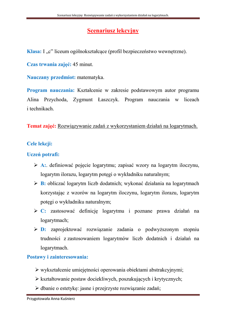 Scenariusz lekcyjny Rozwiązywanie zadań z wykorzystaniem działań na logarytmach. Scenariusz lekcyjny Klasa: I „c” liceum ogólnokształcące (profil bezpieczeństwo wewnętrzne). Czas trwania zajęć: 45 minut. Nauczany przedmiot: matematyka. Program nauczania: Kształcenie w zakresie podstawowym autor programu Alina Przychoda, Zygmunt Łaszczyk. Program nauczania w liceach i technikach. Temat zajęć: Rozwiązywanie zadań z wykorzystaniem działań na logarytmach. Cele lekcji: Uczeń potrafi: A:. definiować pojęcie logarytmu; zapisać wzory na logarytm iloczynu, logarytm ilorazu, logarytm potęgi o wykładniku naturalnym; B: obliczać logarytm liczb dodatnich; wykonać działania na logarytmach korzystając z wzorów na logarytm iloczynu, logarytm ilorazu, logarytm potęgi o wykładniku naturalnym; C: zastosować definicję logarytmu i poznane prawa działań na logarytmach; D: zaprojektować rozwiązanie zadania o podwyższonym stopniu trudności z zastosowaniem logarytmów liczb dodatnich i działań na logarytmach. Postawy i zainteresowania: wykształcenie umiejętności operowania obiektami abstrakcyjnymi; kształtowanie postaw dociekliwych, poszukujących i krytycznych; dbanie o estetykę: jasne i przejrzyste rozwiązanie zadań; Przygotowała Anna Kuśnierz Scenariusz lekcyjny Rozwiązywanie zadań z wykorzystaniem działań na logarytmach. doskonalenie umiejętność pracy na tablicy interaktywnej w programie Interwrite. Strategie nauczania: A- asocjacyjna, O – operacyjna. Metody nauczania: dyskusja dydaktyczna (M1); ćwiczenia przedmiotowe (M2); programowana z użyciem tablicy interaktywnej(M3). Zasady dydaktyczne: świadomego i aktywnego udziału uczniów w procesie nauczania – uczenia się; zasada systematyczności i logicznej kolejności. Formy pracy uczniów: zbiorowa (F1); indywidualna (F2); praca z wykorzystaniem tablicy interaktywnej (F3). Środki dydaktyczne: tablica interaktywna z programem Interwrite; rzutnik multimedialny; lista zadań opracowana na podstawie zadań umieszczonych na portalu matematycznym www.zadania.info.pl Wykaz piśmiennictwa: dla ucznia i nauczyciela: lista zadań opracowana na podstawie zadań www.zadania.info.pl Przygotowała Anna Kuśnierz umieszczonych na portalu matematycznym Scenariusz lekcyjny Rozwiązywanie zadań z wykorzystaniem działań na logarytmach. Organizacja zajęć lekcyjnych ( struktura lekcji ) Sposoby realizacji Etapy ( fazy ) Zagadnienia, zadania, problemy lekcji lekcji zagadnień, zadań, problemów Spełnienia założonych celów Uwagi o realizacji lekcji Faza wstępna Czynności organizacyjne. Sprawdzenie zadania domowego. Przypomnienie przez uczniów: definicji logarytmu, wzorów na logarytm M1, M3, F1, F2 A, B iloczynu, logarytm ilorazu, logarytm potęgi. Faza realizacyjna Rozwiązywanie zadań: Zadanie 1. M1, M2, M3, F1, A, B, C F2, F3 Zadanie 2. Zadanie 3. M1, M2, M3, F1, A, B, C Przygotowała Anna Kuśnierz uczniów; nauczyciel M1, M2, M3, F1, A, B, D inspiruje, M1, M2, M3, F1, A, B, D F2, F3 Zadanie 5 zadań przez F2, F3 F2, F3 Zadanie 4. Rozwiązywanie M1, M2, M3, F1, A, B, C naprowadza uczniów, zadając im pytania Strona 1 Scenariusz lekcyjny Rozwiązywanie zadań z wykorzystaniem działań na logarytmach. Zadanie 6. Zadanie 7. F2, F3 pomocnicze, M1, M2, M3, F1, A, B, C uczniowie zaś F2, F3 prowadzą na M1, M2, M3, F1, A, B, C F2, F3 Zadanie 8. M1, M2, M3, F1, A, B, C F2, F3 Zadanie 9. tablicy poszczególne etapy rozwiązania zadania. M1, M2, M3, F1, A, B, D F2, F3 Zadanie 10. M1, M2, M3, F1, A, B, C F2, F3 Faza Podsumowanie zajęć. Sprawdzenie przy pomocy pytań stopnia opanowania podsumowująca i zrozumienia omawianego tematu. Słowna lub wyrażona stopniem ocena pracy uczniów. Zadanie pracy domowej. Opracowała Anna Kuśnierz Przygotowała Anna Kuśnierz Strona 2 Scenariusz lekcyjny Rozwiązywanie zadań z wykorzystaniem działań na logarytmach. Załącznik 1. Zadania wybrane z portalu matematycznego www.zadania.info.pl Przygotowała Anna Kuśnierz