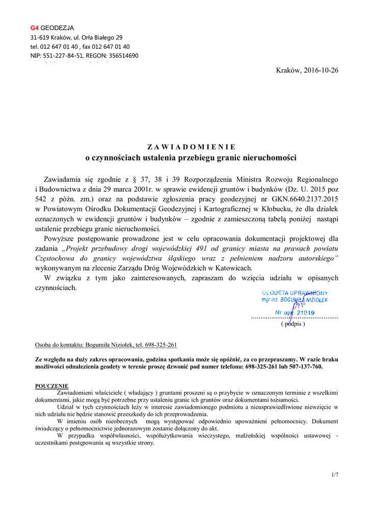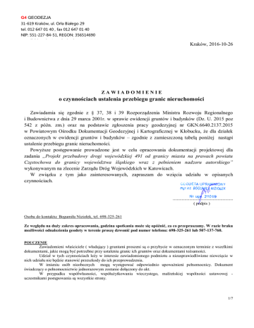 G4 GEODEZJA 31-619 Kraków, ul. Orła Białego 29 tel. 012 647 01 40 , fax 012 647 01 40 NIP: 551-227-84-51, REGON: 356514690 e-mail: [email protected] Kraków, 2016-10-26 ZAWIADOMIENIE o czynnościach ustalenia przebiegu granic nieruchomości Zawiadamia się zgodnie z § 37, 38 i 39 Rozporządzenia Ministra Rozwoju Regionalnego i Budownictwa z dnia 29 marca 2001r. w sprawie ewidencji gruntów i budynków (Dz. U. 2015 poz 542 z późn. zm.) oraz na podstawie zgłoszenia pracy geodezyjnej nr GKN.6640.2137.2015 w Powiatowym Ośrodku Dokumentacji Geodezyjnej i Kartograficznej w Kłobucku, że dla działek oznaczonych w ewidencji gruntów i budynków – zgodnie z zamieszczoną tabelą poniżej nastąpi ustalenie przebiegu granic nieruchomości. Powyższe postępowanie prowadzone jest w celu opracowania dokumentacji projektowej dla zadania „Projekt przebudowy drogi wojewódzkiej 491 od granicy miasta na prawach powiatu Częstochowa do granicy województwa śląskiego wraz z pełnieniem nadzoru autorskiego” wykonywanym na zlecenie Zarządu Dróg Wojewódzkich w Katowicach. W związku z tym jako zainteresowanych, zapraszam do wzięcia udziału w opisanych czynnościach. ............................................... ( podpis ) Osoba do kontaktu: Bogumiła Niziołek, tel. 698-325-261 Ze względu na duży zakres opracowania, godzina spotkania może się opóźnić, za co przepraszamy. W razie braku możliwości odnalezienia geodety w terenie proszę dzwonić pod numer telefonu: 698-325-261 lub 507-137-760. POUCZENIE Zawiadomieni właściciele ( władający ) gruntami proszeni są o przybycie w oznaczonym terminie z wszelkimi dokumentami, jakie mogą być potrzebne przy ustaleniu granic ich gruntów oraz dokumentami tożsamości. Udział w tych czynnościach leży w interesie zawiadomionego podmiotu a nieusprawiedliwione niewzięcie w nich udziału nie będzie stanowić przeszkody do ich przeprowadzenia. W imieniu osób nieobecnych mogą występować odpowiednio upoważnieni pełnomocnicy. Dokument świadczący o pełnomocnictwie jednorazowym zostanie dołączony do akt. W przypadku współwłasności, współużytkowania wieczystego, małżeńskiej wspólności ustawowej uczestnikami postępowania są wszystkie strony. 1/7 G4 GEODEZJA 31-619 Kraków, ul. Orła Białego 29 tel. 012 647 01 40 , fax 012 647 01 40 NIP: 551-227-84-51, REGON: 356514690 e-mail: [email protected] SPOTKANIE Ozn.dz. ewid. Oznaczenie Księgi Wieczystej (inne dokumenty) Obręb Jednostka ewidencyjna 10 CZ2C/00004719/0 0003 Dąbrowa 240607_2 Popów 23.11 2016 (środa) 13:00 Dąbrowa przy drodze wojewódzkie DW491 na granicy z działką 38/2 (adres Smolarze 5) 11 CZ2C/00004719/0 0003 Dąbrowa 240607_2 Popów 23.11 2016 (środa) 13:00 Dąbrowa przy drodze wojewódzkie DW491 na granicy z działką 38/2 (adres Smolarze 5) 12 KW 36823 0003 Dąbrowa 240607_2 Popów 23.11 2016 (środa) 13:00 Dąbrowa przy drodze wojewódzkie DW491 na granicy z działką 38/2 (adres Smolarze 5) 34 Kw 38488 0003 Dąbrowa 240607_2 Popów 23.11 2016 (środa) 12:30 Dąbrowa na działce przedmiotowej przy drodze wojewódzkiej 491 39 KW 36823 0003 Dąbrowa 240607_2 Popów 23.11 2016 (środa) 13:30 Dąbrowa na działce przedmiotowej przy drodze wojewódzkiej 491 40 KW 12971 AKT NOT.REP.A NR 8 0003 Dąbrowa 240607_2 Popów 23.11 2016 (środa) 13:30 Dąbrowa na działce przedmiotowej na granicy z działką leśną 175/1 41 KW 36823 0003 Dąbrowa 240607_2 Popów 23.11 2016 (środa) 13:30 Dąbrowa na działce przedmiotowej na granicy z działką leśną 175/1 44 KW 29045 0003 Dąbrowa 240607_2 Popów 23.11 2016 (środa) 13:30 Dąbrowa na działce przedmiotowej na granicy z działką leśną 175/1 45 KW 22660 AKT NOT.REP.A 0003 Dąbrowa 240607_2 Popów 23.11 2016 (środa) 13:30 Dąbrowa na działce przedmiotowej na granicy z działką leśną 175/1 46 KW 28317 AKT NOT.REP.A 0003 Dąbrowa 240607_2 Popów 23.11 2016 (środa) 13:30 Dąbrowa na działce przedmiotowej na granicy z działką leśną 175/1 72 Kw 34217 0003 Dąbrowa 240607_2 Popów 23.11 2016 (środa) 14:00 Dąbrowa na działce przedmiotowej na granicy z działką leśną 177 73 CZ2C/00048517/4 0003 Dąbrowa 240607_2 Popów 23.11 2016 (środa) od 11:0014:30 Dąbrowa na działce przedmiotowej przy drodze wojewódzkiej 491 74 CZ2C/00049532/2 0003 Dąbrowa 240607_2 Popów 23.11 2016 (środa) 12:30 Dąbrowa na działce przedmiotowej przy drodze wojewódzkiej 491 75 CZ2C/00047169/2 0003 Dąbrowa 240607_2 Popów 23.11 2016 (środa) 13:00 Dąbrowa na działce przedmiotowej przy drodze wojewódzkiej 491 173 CZ2C/00027324/1 0003 Dąbrowa 240607_2 Popów 23.11 2016 (środa) 14:00 Dąbrowa na działce przedmiotowej przy drodze wojewódzkiej 491 176 KW 27324 0003 Dąbrowa 240607_2 Popów 23.11 2016 (środa) 14:00 Dąbrowa na działce przedmiotowej przy drodze wojewódzkiej 491 177 KW 27324 0003 Dąbrowa 240607_2 Popów 23.11 2016 (środa) 14:00 Dąbrowa na działce przedmiotowej przy drodze wojewódzkiej 491 178 KW 27324 0003 Dąbrowa 240607_2 Popów 23.11 2016 (środa) 14:00 Dąbrowa na działce przedmiotowej przy drodze wojewódzkiej 491 180 CZ2C/00027324/1 0003 Dąbrowa 240607_2 Popów 23.11 2016 (środa) 14:00 Dąbrowa przy drodze wojewódzkiej DW491, przy skrzyżowaniu Dąbrowa, w pobliżu przystanku 181 CZ2C/00027324/1 0003 Dąbrowa 240607_2 Popów 23.11 2016 (środa) 14:00 Dąbrowa przy drodze wojewódzkiej DW491, przy skrzyżowaniu Dąbrowa, w pobliżu przystanku 182 KW 27324 0003 Dąbrowa 240607_2 Popów 23.11 2016 (środa) 14:00 Dąbrowa na działce przedmiotowej przy drodze wojewódzkiej 491 Spotkanie - Spotkanie - Spotkanie Data Godzina - Miejsce Spotkanie - Adres 2/7 G4 GEODEZJA 31-619 Kraków, ul. Orła Białego 29 tel. 012 647 01 40 , fax 012 647 01 40 NIP: 551-227-84-51, REGON: 356514690 e-mail: [email protected] Ozn.dz. ewid. Oznaczenie Księgi Wieczystej (inne dokumenty) Obręb Jednostka ewidencyjna Spotkanie - Spotkanie - Spotkanie Data Godzina - Miejsce 185 KW 27324 0003 Dąbrowa 240607_2 P