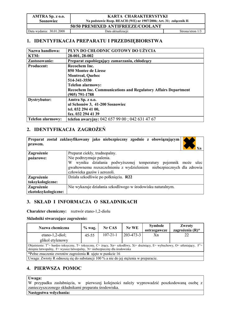 AMTRA Sp. z o.o. Sosnowiec KARTA CHARAKTERYSTYKI Na podstawie Rozp. REACH (WE) nr 1907/2006; Art. 31; załącznik II. 50/50 PREMIXED ANTIFREEZE/COOLANT Data wydania: 30.01.2008 Data aktualizacji: Strona/stron 1/3 1. IDENTYFIKACJA PREPARATU I PRZEDSIĘBIORSTWA Nazwa handlowa: KTM: Zastosowanie: Producent: Dystrybutor: Telefon alarmowy: PŁYN DO CHŁODNIC GOTOWY DO UśYCIA 28-001, 28-002 Preparat zapobiegający zamarzaniu, chłodzący Recochem Inc. 850 Montee de Liesse Montreal, Quebec 514-341-3550 Telefon alarmowy: Recochem Inc. Communications and Regulatory Affairs Department (905) 791-1788 Amtra Sp. z o.o. ul Schonów 3, 41-200 Sosnowiec tel. 032 294 41 00, fax. 032 294 41 39 telefon awaryjny: 042 657 99 00 ; 042 631 47 67 2. IDENTYFIKACJA ZAGROśEŃ Preparat został zaklasyfikowany jako niebezpieczny zgodnie z obowiązującym prawem. Xn ZagroŜenie poŜarowe: ZagroŜenie toksykologiczne: ZagroŜenie ekotoksykologiczne: Preparat ciekły, trudnopalny. Nie podtrzymuje palenia. W wyniku działania podwyŜszonej temperatury pojemnik moŜe ulec gwałtownemu rozszczelnieniu z wydzieleniem niebezpiecznych dla zdrowia człowieka gazów i aerozoli. Działa szkodliwie po połknięciu. R22 Nie wykazuje działania szkodliwego w środowisku naturalnym. 3. SKŁAD I INFORMACJA O SKŁADNIKACH Charakter chemiczny: roztwór etano-1,2-diolu Składniki stwarzające zagroŜenie: Nazwa chemiczna % wag. Nr CAS Nr WE etano-1,2-diol; glikol etylenowy 45-55 107-21-1 203-473-3 Symbole ostrzegawcze Xn Zwroty zagroŜenia (R)* 22 Objaśnienie: T+= bardzo toksyczny, T= toksyczny, C= Ŝrący, Xn= szkodliwy, Xi= draŜniący, E= wybuchowy, O= utleniający, F+= skrajnie łatwopalny, F= wysoce łatwopalny, N= niebezpieczny dla środowiska *Pełne znaczenie zwrotów zagroŜenia R ujęto w punkcie 16 Uwaga: Zwroty R odnoszą się do substancji 100 % a nie do jej stęŜenia w preparacie. 4. PIERWSZA POMOC Uwaga: W przypadku zasłabnięcia, w pierwszej kolejności naleŜy wyprowadzić poszkodowaną osobę z zanieczyszczonego składnikami preparatu środowiska. Następstwa wdychania: AMTRA Sp. z o.o. Sosnowiec KARTA CHARAKTERYSTYKI Na podstawie Rozp. REACH (WE) nr 1907/2006; Art. 31; załącznik II. 50/50 PREMIXED ANTIFREEZE/COOLANT Data wydania: 30.01.2008 Data aktualizacji: Strona/stron 2/3 • W przypadku wystąpienia takiej potrzeby - wykonać sztuczne oddychanie lub w razie potrzeby podać tlen - najlepiej jeśli tego dokona osoba przeszkolona. • Zapewnić pomoc lekarską. Następstwa połknięcia: • Przepłukać usta wodą, dać do wypicia 2-3 szklanki wody. Nie wywoływać wymiotów • W razie potrzeby przetransportować do szpitala. Kontakt z oczami: • Usunąć szkła kontaktowe. Przemyć zanieczyszczone oczy większą ilością letniej wody przez 15 minut, przy wywiniętych powiekach. • W razie potrzeby zapewnić pomoc okulisty. Kontakt ze skórą: • Zdjąć zanieczyszczone ubranie i buty. Oczyścić mechanicznie zanieczyszczoną skórę, przemyć duŜą ilością wody a następnie wodą z łagodnym mydłem. • W przypadku gdy podraŜnienie skóry nie przemija, skonsultować się z lekarzem dermatologiem. Wskazówki dla lekarza: Leczenie zatrucia glikolem etylenowym, odpowiednio do stanu chorego, powinno obejmować: płukanie Ŝołądka w czasie do 2 godzin od zatrucia, zwalczanie zaburzeń krąŜeniowo-oddechowych, podanie alkoholu etylowego (doŜylnie we wlewie kroplowym 5-15% roztwór alkoholu etylowego w 5% glukozie); w przypadku cięŜkich zatruć stosować hemodializę, diurezę. 5. POSTĘPOWANIE W PRZYPADKU POśARU ZagroŜenia poŜarowe: Preparat ciekły, trudnopalny. Środki gaśnicze: • pianę gaśniczą (odporną na alkohol) • ditlenek węgla (CO2) • proszek gaśniczy, • mgłę wodną. Środki gaśnicze, Nie stosować zwartych strumieni wody. jakich nie naleŜy stosować: Opary strącać mgłą wodną. Gaszenie poŜaru: Pojemniki naraŜone na działania ognia lub wysokiej temperatury chłodzić wodą i w miarę moŜliwości usunąć z zagroŜonego obszaru. Pełne wyposaŜenie ochronne. Sprzęt ochronny Aparaty izolujące drogi oddechowe. straŜaków: Dymy zawierające niebezpieczne produkty spalania, w tym tlenek i ditlenek Produkty spalania: węgla, tlenki krzemu. Do zbierania rozlanej cieczy uŜywać materiały absorbujące. Uwaga dodatkowa: Chronić kanalizację, wody powierzchniowe i grunt przed zanieczyszczeniem. 6. POSTĘPOWANIE W PRZYPADKU NIEZAMIERZONEGO UWOLNIENIA DO ŚRODOWISKA Środki ochrony indywidualnej: Metody oczyszczania: Ubrania robocze ze zwartej tkaniny, rękawice z tworzywa nitrylowego lub neoprenowego, buty ochronne z tworzywa nitrylowego lub neoprenowego okulary ochronne w szczelnej obudowie. Usunąć wszelkie potencjalne źródła zapłonu, zabezpieczyć uszkodzone opakowania, na drodze przemieszczającego się preparatu sypać tamy. Stosować obojętne materiały absorbujące (ziemia, suchy piasek, diatomit, wermikulit). Zebraną ze środowiska ciecz umieścić w opakowaniu zastępczym i skierować AMTRA Sp. z o.o. Sosnowiec KARTA CHARAKTERYSTYKI Na podstawie Rozp. REACH (WE) nr 1907/2006; Art. 31; załącznik II. 50/50 PREMIXED ANTIFREEZE/COOLANT Data wydania: 30.01.2008 Zabezpieczenie środowiska: Data aktualizacji: Strona/stron 3/3 do zniszczenia. Nie wolno uŜywać rozpuszczalników. Do czyszczenia stosować detergenty i większe ilości wody. Zabezpieczyć studzienki ściekowe. W przypadku powaŜnego zanieczyszczenia jakichkolwiek elementu środowiska, powiadomić odpowiednie władze administracyjne i kontrolne oraz organizacje ratownicze. Na drodze spalania po rozładowaniu opakowań, w odpowiednich instalacjach uprawnionego przedsiębiorstwa. 7. POSTĘPOWANIE Z PREPARATEM I JEGO MAGAZYNOWANIE Wydajna wentylacja na stanowiskach pracy w obiektach zamkniętych. Myjki do oczu w pobliŜu stanowisk pracy. Podczas wszelkich, wykonywanych czynności z preparatem: • nie jeść, nie pić, nie palić nie zaŜywać lekarstw, • unikać bezpośrednich kontaktów z pr