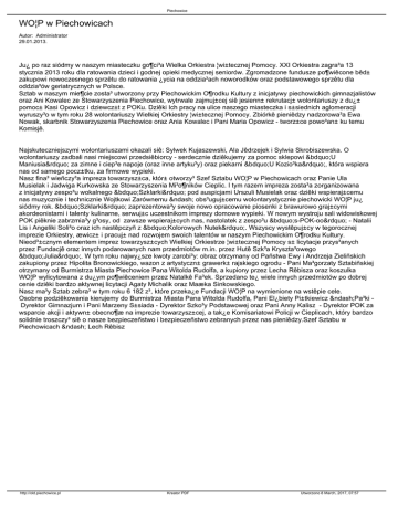 Piechowice WO¦P w Piechowicach Autor: Administrator 29.01.2013. Ju¿ po raz siódmy w naszym miasteczku go¶ci³a Wielka Orkiestra ¦wi±tecznej Pomocy. XXI Orkiestra zagra³a 13 stycznia 2013 roku dla ratowania dzieci i godnej opieki medycznej seniorów. Zgromadzone fundusze po¶wiêcone bêd± zakupowi nowoczesnego sprzêtu do ratowania ¿ycia na oddzia³ach noworodków oraz podstawowego sprzêtu dla oddzia³ów geriatrycznych w Polsce. Sztab w naszym mie¶cie zosta³ utworzony przy Piechowickim O¶rodku Kultury z inicjatywy piechowickich gimnazjalistów oraz Ani Kowalec ze Stowarzyszenia Piechowice, wytrwale zajmuj±cej siê jesienn± rekrutacj± wolontariuszy z du¿± pomoc± Kasi Opowicz i dziewcz±t z POKu. Dziêki Ich pracy na ulice naszego miasteczka i s±siednich aglomeracji wyruszy³o w tym roku 28 wolontariuszy Wielkiej Orkiestry ¦wi±tecznej Pomocy. Zbiórkê pieniêdzy nadzorowa³a Ewa Nowak, skarbnik Stowarzyszenia Piechowice oraz Ania Kowalec i Pani Maria Opowicz - tworz±ce powo³an± ku temu Komisjê. Najskuteczniejszymi wolontariuszami okazali siê: Sylwek Kujaszewski, Ala Jêdrzejek i Sylwia Skrobiszewska. O wolontariuszy zadbali nasi miejscowi przedsiêbiorcy - serdecznie dziêkujemy za pomoc sklepowi „U Maniusia” za zimne i ciep³e napoje (oraz inne artyku³y) oraz piekarni „U Kozio³ka”, która wspiera nas od samego pocz±tku, za firmowe wypieki. Nasz fina³ wieñczy³a impreza towarzysz±ca, któr± otworzy³ Szef Sztabu WO¦P w Piechowicach oraz Panie Ula Musielak i Jadwiga Kurkowska ze Stowarzyszenia Mi³o¶ników Cieplic. I tym razem impreza zosta³a zorganizowana z inicjatywy zespo³u wokalnego „Szklarki” pod auspicjami Urszuli Musielak oraz dziêki wspieraj±cemu nas muzycznie i technicznie Wojtkowi Zarównemu – obs³uguj±cemu wolontarystycznie piechowicki WO¦P ju¿ siódmy rok. „Szklarki” zaprezentowa³y swoje nowo opracowane piosenki z brawurowo graj±cymi akordeonistami i talenty kulinarne, serwuj±c uczestnikom imprezy domowe wypieki. W nowym wystroju sali widowiskowej POK piêknie zabrzmia³y g³osy, od zawsze wspieraj±cych nas, nastolatek z zespo³u „s-POK-oo” - Natalii Lis i Angeliki Soli³o oraz ich nastêpczyñ z „Kolorowych Nutek”. Wszyscy wystêpuj±cy w tegorocznej imprezie Orkiestry, æwicz± i pracuj± nad rozwojem swoich talentów w naszym Piechowickim O¶rodku Kultury. Nieod³±cznym elementem imprez towarzysz±cych Wielkiej Orkiestrze ¦wi±tecznej Pomocy s± licytacje przys³anych przez Fundacjê oraz innych podarowanych nam przedmiotów m.in. przez Hutê Szk³a Kryszta³owego „Julia”. W tym roku najwy¿sze kwoty zarobi³y: obraz otrzymany od Pañstwa Ewy i Andrzeja Zieliñskich zakupiony przez Hipolita Bronowickiego, wazon z artystyczn± grawerk± rajskiego ogrodu - Pani Ma³gorzaty Sztabiñskiej otrzymany od Burmistrza Miasta Piechowice Pana Witolda Rudolfa, a kupiony przez Lecha Rêbisza oraz koszulka WO¦P wylicytowana z du¿ym po¶wiêceniem przez Natalkê Fa³ek. Sprzedano te¿ wiele innych przedmiotów po dobrej cenie dziêki bardzo aktywnej licytacji Agaty Michalik oraz Maæka Sinkowskiego. Nasz ma³y Sztab zebra³ w tym roku 6 182 z³, które przeka¿e Fundacji WO¦P na wymienione na wstêpie cele. Osobne podziêkowania kierujemy do Burmistrza Miasta Pana Witolda Rudolfa, Pani El¿biety Pi±tkiewicz –Pa³ki Dyrektor Gimnazjum i Pani Marzeny S±siada - Dyrektor Szko³y Podstawowej oraz Pani Anny Kalisz - Dyrektor POK za wsparcie akcji i aktywn± obecno¶æ na imprezie towarzysz±cej, a tak¿e Komisariatowi Policji w Cieplicach, który bardzo solidnie troszczy³ siê o nasze bezpieczeñstwo i bezpieczeñstwo zebranych przez nas pieniêdzy.Szef Sztabu w Piechowicach – Lech Rêbisz http://old.piechowice.pl Kreator PDF Utworzono 8 March, 2017, 07:57