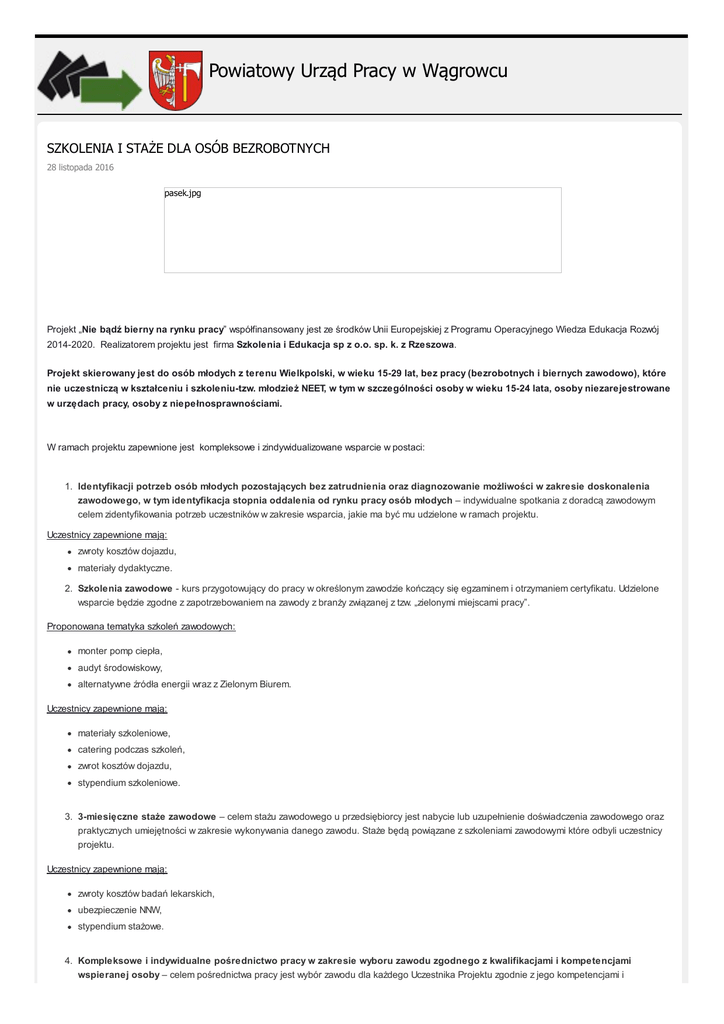 Powiatowy Urząd Pracy w Wągrowcu SZKOLENIA I STAŻE DLA OSÓB BEZROBOTNYCH 28 listopada 2016 pasek.jpg Projekt „Nie bądź bierny na rynku pracy” współfinansowany jest ze środków Unii Europejskiej z Programu Operacyjnego Wiedza Edukacja Rozwój 2014-2020. Realizatorem projektu jest firma Szkolenia i Edukacja sp z o.o. sp. k. z Rzeszowa. Projekt skierowany jest do osób młodych z terenu Wielkpolski, w wieku 15-29 lat, bez pracy (bezrobotnych i biernych zawodowo), które nie uczestniczą w kształceniu i szkoleniu-tzw. młodzież NEET, w tym w szczególności osoby w wieku 15-24 lata, osoby niezarejestrowane w urzędach pracy, osoby z niepełnosprawnościami. W ramach projektu zapewnione jest kompleksowe i zindywidualizowane wsparcie w postaci: 1. Identyfikacji potrzeb osób młodych pozostających bez zatrudnienia oraz diagnozowanie możliwości w zakresie doskonalenia zawodowego, w tym identyfikacja stopnia oddalenia od rynku pracy osób młodych – indywidualne spotkania z doradcą zawodowym celem zidentyfikowania potrzeb uczestników w zakresie wsparcia, jakie ma być mu udzielone w ramach projektu. Uczestnicy zapewnione mają: zwroty kosztów dojazdu, materiały dydaktyczne. 2. Szkolenia zawodowe - kurs przygotowujący do pracy w określonym zawodzie kończący się egzaminem i otrzymaniem certyfikatu. Udzielone wsparcie będzie zgodne z zapotrzebowaniem na zawody z branży związanej z tzw. „zielonymi miejscami pracy”. Proponowana tematyka szkoleń zawodowych: monter pomp ciepła, audyt środowiskowy, alternatywne źródła energii wraz z Zielonym Biurem. Uczestnicy zapewnione mają: materiały szkoleniowe, catering podczas szkoleń, zwrot kosztów dojazdu, stypendium szkoleniowe. 3. 3-miesięczne staże zawodowe – celem stażu zawodowego u przedsiębiorcy jest nabycie lub uzupełnienie doświadczenia zawodowego oraz praktycznych umiejętności w zakresie wykonywania danego zawodu. Staże będą powiązane z szkoleniami zawodowymi które odbyli uczestnicy projektu. Uczestnicy zapewnione mają: zwroty kosztów badań lekarskich, ubezpieczenie NNW, stypendium stażowe. 4. Kompleksowe i indywidualne pośrednictwo pracy w zakresie wyboru zawodu zgodnego z kwalifikacjami i kompetencjami wspieranej osoby – celem pośrednictwa pracy jest wybór zawodu dla każdego Uczestnika Projektu zgodnie z jego kompetencjami i kwalifikacjami, obejmujące m.in. poszukiwanie ofert pracy, przygotowanie CV i listu motywacyjnego pod konkretną ofertę pracy, nawiązanie kontaktu z pracodawcami. Uczestnicy zapewnione mają: zwroty kosztów dojazdu, materiały dydaktyczne. -------------------------------------------Szkolenia i Edukacja sp z o.o. sp. k. - Rzeszów Strona internetowa projektu: http://projektwielkopolska.szkoleniawkk.pl/49-strona-glowna.html Telefon kontaktowy: 663 985 889