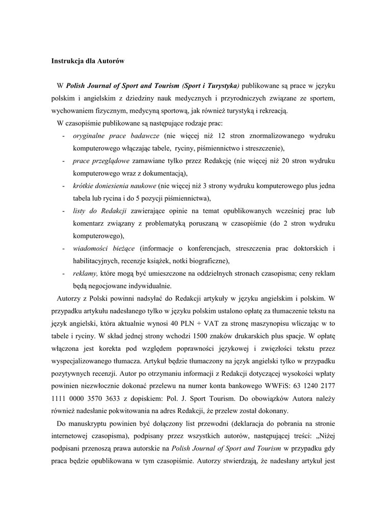 Instrukcja dla Autorów W Polish Journal of Sport and Tourism (Sport i Turystyka) publikowane są prace w języku polskim i angielskim z dziedziny nauk medycznych i przyrodniczych związane ze sportem, wychowaniem fizycznym, medycyną sportową, jak równieŜ turystyką i rekreacją. W czasopiśmie publikowane są następujące rodzaje prac: - oryginalne prace badawcze (nie więcej niŜ 12 stron znormalizowanego wydruku komputerowego włączając tabele, ryciny, piśmiennictwo i streszczenie), - prace przeglądowe zamawiane tylko przez Redakcję (nie więcej niŜ 20 stron wydruku komputerowego wraz z dokumentacją), - krótkie doniesienia naukowe (nie więcej niŜ 3 strony wydruku komputerowego plus jedna tabela lub rycina i do 5 pozycji piśmiennictwa), - listy do Redakcji zawierające opinie na temat opublikowanych wcześniej prac lub komentarz związany z problematyką poruszaną w czasopiśmie (do 2 stron wydruku komputerowego), - wiadomości bieŜące (informacje o konferencjach, streszczenia prac doktorskich i habilitacyjnych, recenzje ksiąŜek, notki biograficzne), - reklamy, które mogą być umieszczone na oddzielnych stronach czasopisma; ceny reklam będą negocjowane indywidualnie. Autorzy z Polski powinni nadsyłać do Redakcji artykuły w języku angielskim i polskim. W przypadku artykułu nadesłanego tylko w języku polskim ustalono opłatę za tłumaczenie tekstu na język angielski, która aktualnie wynosi 40 PLN + VAT za stronę maszynopisu wliczając w to tabele i ryciny. W skład jednej strony wchodzi 1500 znaków drukarskich plus spacje. W opłatę włączona jest korekta pod względem poprawności językowej i zwięzłości tekstu przez wyspecjalizowanego tłumacza. Artykuł będzie tłumaczony na język angielski tylko w przypadku pozytywnych recenzji. Autor po otrzymaniu informacji z Redakcji dotyczącej wysokości wpłaty powinien niezwłocznie dokonać przelewu na numer konta bankowego WWFiS: 63 1240 2177 1111 0000 3570 3633 z dopiskiem: Pol. J. Sport Tourism. Do obowiązków Autora naleŜy równieŜ nadesłanie pokwitowania na adres Redakcji, Ŝe przelew został dokonany. Do manuskryptu powinien być dołączony list przewodni (deklaracja do pobrania na stronie internetowej czasopisma), podpisany przez wszystkich autorów, następującej treści: „NiŜej podpisani przenoszą prawa autorskie na Polish Journal of Sport and Tourism w przypadku gdy praca będzie opublikowana w tym czasopiśmie. Autorzy stwierdzają, Ŝe nadesłany artykuł jest oryginalny, nie był przesłany do publikacji w innym czasopiśmie i nie był do tej pory publikowany w innej formie niŜ abstrakt, krótkie doniesienie lub praca doktorska. Autorzy stwierdzają, Ŝe odpowiadają za przeprowadzone badania i Ŝe brali udział w planowaniu i redagowaniu przesłanego do redakcji artykułu, który aprobują w tym kształcie. Autorzy stwierdzają równieŜ, Ŝe nadesłany artykuł (w przypadku gdy dotyczy badań inwazyjnych na ludziach) był zatwierdzony przez właściwą komisję etyczną i Ŝe badania zostały przeprowadzone zgodnie z Deklaracją Helsińską.” W nadesłanym do Redakcji formularzu, Autorzy są zobowiązani zadeklarować swój wkład w powstanie publikacji (przygotowanie projektu badań, pozyskiwanie środków finansowych, zbieranie danych, opracowanie wyników, obliczenia statystyczne, interpretacja wyników, wyszukiwanie literatury, udział w pisaniu pracy). Główną odpowiedzialność za podane dane ponosi Autor zgłaszający pracę. „Ghostwriting”, „guest authorship” są przejawem nierzetelności naukowej, a wszelkie wykryte przypadki będą demaskowane, włącznie z powiadomieniem odpowiednich podmiotów. Autorzy są równieŜ zobowiązani do wypełnienia i przesłania do Redakcji na adres [email protected] De Gruyter Open Access License (deklaracja „License to publish” do pobrania na stronie internetowej czasopisma). Praca powinna być nadesłana do Redakcji w wersji papierowej (1 egz.) w formacie A4, pisana jednostronnie z zachowaniem marginesów: lewy 3 cm, prawy 2 cm, górny 2 cm, dolny 2 cm i 1,5 interlinii, bez justowania i formatowania, pisana czcionką Times New Roman o rozmiarze 12. Akapity naleŜy wcinać na 3 znaki nie uŜywając tabulatora. NaleŜy wysłać wersję elektroniczną mailem na adres [email protected] lub dołączyć płytę CD-ROM. Dopuszczalne są pliki przygotowane w edytorze tekstowym (format zapisu *.doc lub *.docx). Do oceny kaŜdej publikacji powołuje się dwóch niezaleŜnych, anonimowych recenzentów spoza jednostki, z której nadesłano pracę („double-blind review process”). W zaleŜności od sugestii osób oceniających, Redakcja podejmuje dalszą decyzję o losie pracy, która jest ostateczna. W ostatnim numerze tomu, czasopismo podaje do publicznej wiadomości listę recenzentów współpracujących. Formularz recenzji dostępny jest na stronie internetowej czasopisma. Strona tytułowa. NaleŜy kolejno podać: tytuł pracy, imiona i nazwiska autorów z afiliacją, imię i nazwisko autora do korespondencji wraz z adresem, numerem telefonu, faksu i e-mailem. Streszczenie (do 250 słów) o następującym układzie: wprowadzenie (uzasadnienie i cel pracy), materiał i metody, wyniki, wnioski oraz 3-6 słów kluczowych naleŜy umieścić przed tekstem głównym pracy. Tekst główny pracy powinien zawierać: Wstęp, Materiał i metody, Wyniki, Dyskusja, Wnioski, Podziękowania (jeŜeli potrzebne), Piśmiennictwo. W pracach innego typu naleŜy zachować logiczną ciągłość tekstu, a tytuły poszczególnych części powinny odzwierciedlać omawiane w nich zagadnienia. Wstęp – powinien być krótki i zwięzły, w którym naleŜy wprowadzić czytelnika w tematykę oraz uzasadnić cel podjęcia badań i wyraźnie go sprecyzować. Materiał i metody – naleŜy podać informację dotyczącą przedmiotu badań (w przypadku osób podać liczebność, wiek, płeć i inne cechy charakterystyczne) oraz zastosowanych metod w 
