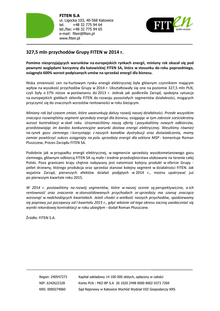 FITEN S.A ul. Ligocka 103, 40-568 Katowice tel. +48 32 775 94 64 tel./fax: +48 32 775 94 65 e-mail: [email protected] www.fiten.pl 327,5 mln przychodów Grupy FITEN w 2014 r. Pomimo niesprzyjających warunków na europejskich rynkach energii, miniony rok okazał się pod pewnymi względami korzystny dla katowickiej FITEN SA, która w stosunku do roku poprzedniego, osiągnęła 600% wzrost podpisanych umów na sprzedaż energii dla biznesu. Niska zmienność cen na hurtowym rynku energii elektrycznej była głównym czynnikiem mającym wpływ na wysokość przychodów Grupy w 2014 r. Ukształtowały się one na poziomie 327,5 mln PLN, czyli były o 37% niższe w porównaniu do 2013 r. Jednak jak podkreśla Zarząd, spokojna sytuacja na europejskich giełdach skłoniła FITEN do rozwoju pozostałych segmentów działalności, mogących przyczynić się do znacznych wzrostów rentowności w roku bieżącym. Miniony rok był czasem zmian, które uwarunkują dalszy rozwój naszej działalności. Przede wszystkim znacząco rozwinęliśmy segment sprzedaży energii dla biznesu, osiągając w tym zakresie sześciokrotny wzrost kontraktacji w skali roku. Urozmaiciliśmy naszą ofertę i pozyskaliśmy nowych odbiorców, przedstawiając im bardzo konkurencyjne warunki dostaw energii elektrycznej. Weszliśmy również na rynek gazu ziemnego i korzystając z naszych kanałów dystrybucji oraz doświadczenia, mamy zamiar powtórzyć sukces osiągnięty na polu sprzedaży energii dla sektora MSP ‐ komentuje Roman Pluszczew, Prezes Zarządu FITEN SA. Podobnie jak w przypadku energii elektrycznej, w segmencie sprzedaży wysokometanowego gazu ziemnego, głównym odbiorcą FITEN SA są małe i średnie przedsiębiorstwa ulokowane na terenie całej Polski. Poza granicami kraju chętnie nabywany jest natomiast kolejny produkt w ofercie Grupy ‐ pellet drzewny, którego produkcja oraz sprzedaż stanowi kolejny segment w działalności FITEN. Jak wyjaśnia Zarząd, pierwszych efektów działań podjętych w 2014 r., można upatrywać już po pierwszym kwartale roku 2015. W 2014 r. postawiliśmy na rozwój segmentów, które w naszej ocenie są perspektywiczne, a ich rentowność oraz znaczenie w skonsolidowanych przychodach ze sprzedaży ma szansę znacząco wzrosnąć w nadchodzących kwartałach. Jeżeli chodzi o wielkość naszych przychodów, spodziewamy się poprawy już począwszy od I kwartału 2015 r., gdyż właśnie od tego okresu zaczną uwidaczniać się wyniki rekordowej kontraktacji w roku ubiegłym ‐ dodał Roman Pluszczew. Źródło: FITEN S.A. Regon: 240547273 Kapitał zakładowy 14 100 000 złotych, opłacony w całości NIP: 6342622328 Konto PLN : PKO BP S.A 26 1020 2498 0000 8002 0373 7269 KRS: 0000274060 Sąd Rejonowy w Katowice Wschód Wydział VIII Gospodarczy KRS