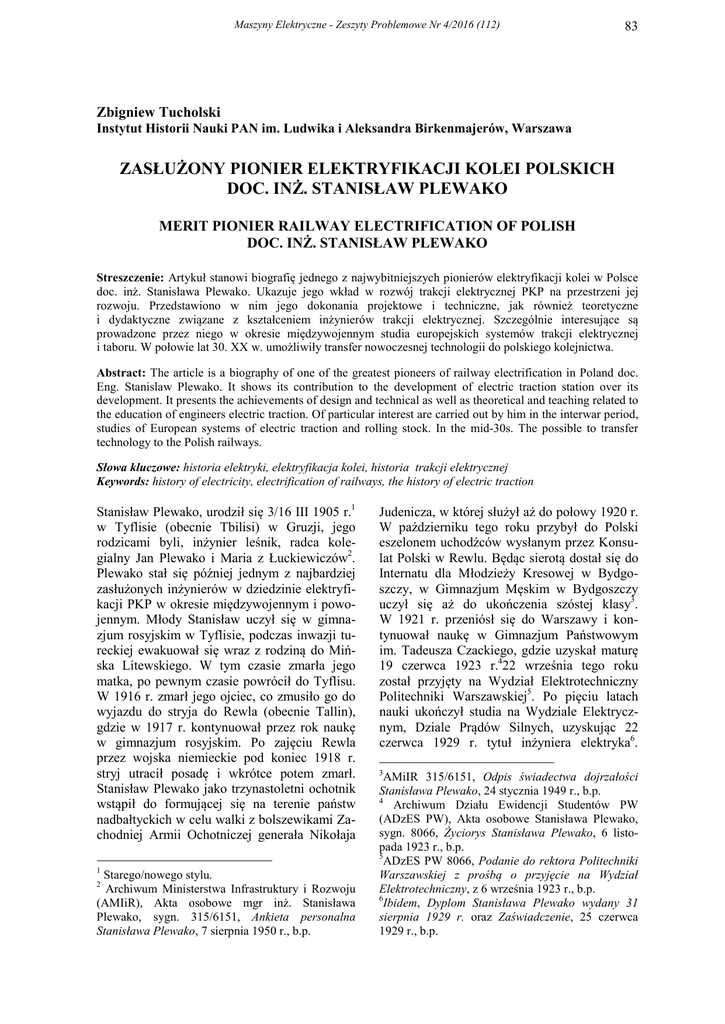 Maszyny Elektryczne - Zeszyty Problemowe Nr 4/2016 (112) 83 Zbigniew Tucholski Instytut Historii Nauki PAN im. Ludwika i Aleksandra Birkenmajerów, Warszawa ZASŁUŻONY PIONIER ELEKTRYFIKACJI KOLEI POLSKICH DOC. INŻ. STANISŁAW PLEWAKO MERIT PIONIER RAILWAY ELECTRIFICATION OF POLISH DOC. INŻ. STANISŁAW PLEWAKO Streszczenie: Artykuł stanowi biografię jednego z najwybitniejszych pionierów elektryfikacji kolei w Polsce doc. inż. Stanisława Plewako. Ukazuje jego wkład w rozwój trakcji elektrycznej PKP na przestrzeni jej rozwoju. Przedstawiono w nim jego dokonania projektowe i techniczne, jak również teoretyczne i dydaktyczne związane z kształceniem inżynierów trakcji elektrycznej. Szczególnie interesujące są prowadzone przez niego w okresie międzywojennym studia europejskich systemów trakcji elektrycznej i taboru. W połowie lat 30. XX w. umożliwiły transfer nowoczesnej technologii do polskiego kolejnictwa. Abstract: The article is a biography of one of the greatest pioneers of railway electrification in Poland doc. Eng. Stanislaw Plewako. It shows its contribution to the development of electric traction station over its development. It presents the achievements of design and technical as well as theoretical and teaching related to the education of engineers electric traction. Of particular interest are carried out by him in the interwar period, studies of European systems of electric traction and rolling stock. In the mid-30s. The possible to transfer technology to the Polish railways. Słowa kluczowe: historia elektryki, elektryfikacja kolei, historia trakcji elektrycznej Keywords: history of electricity, electrification of railways, the history of electric traction Stanisław Plewako, urodził się 3/16 III 1905 r.1 w Tyflisie (obecnie Tbilisi) w Gruzji, jego rodzicami byli, inżynier leśnik, radca kolegialny Jan Plewako i Maria z Łuckiewiczów2. Plewako stał się później jednym z najbardziej zasłużonych inżynierów w dziedzinie elektryfikacji PKP w okresie międzywojennym i powojennym. Młody Stanisław uczył się w gimnazjum rosyjskim w Tyflisie, podczas inwazji tureckiej ewakuował się wraz z rodziną do Mińska Litewskiego. W tym czasie zmarła jego matka, po pewnym czasie powrócił do Tyflisu. W 1916 r. zmarł jego ojciec, co zmusiło go do wyjazdu do stryja do Rewla (obecnie Tallin), gdzie w 1917 r. kontynuował przez rok naukę w gimnazjum rosyjskim. Po zajęciu Rewla przez wojska niemieckie pod koniec 1918 r. stryj utracił posadę i wkrótce potem zmarł. Stanisław Plewako jako trzynastoletni ochotnik wstąpił do formującej się na terenie państw nadbałtyckich w celu walki z bolszewikami Zachodniej Armii Ochotniczej generała Nikołaja 1 Starego/nowego stylu. Archiwum Ministerstwa Infrastruktury i Rozwoju (AMIiR), Akta osobowe mgr inż. Stanisława Plewako, sygn. 315/6151, Ankieta personalna Stanisława Plewako, 7 sierpnia 1950 r., b.p. 2 Judenicza, w której służył aż do połowy 1920 r. W październiku tego roku przybył do Polski eszelonem uchodźców wysłanym przez Konsulat Polski w Rewlu. Będąc sierotą dostał się do Internatu dla Młodzieży Kresowej w Bydgoszczy, w Gimnazjum Męskim w Bydgoszczy uczył się aż do ukończenia szóstej klasy3. W 1921 r. przeniósł się do Warszawy i kontynuował naukę w Gimnazjum Państwowym im. Tadeusza Czackiego, gdzie uzyskał maturę 19 czerwca 1923 r.422 września tego roku został przyjęty na Wydział Elektrotechniczny Politechniki Warszawskiej5. Po pięciu latach nauki ukończył studia na Wydziale Elektrycznym, Dziale Prądów Silnych, uzyskując 22 czerwca 1929 r. tytuł inżyniera elektryka6. 3 AMiIR 315/6151, Odpis świadectwa dojrzałości Stanisława Plewako, 24 stycznia 1949 r., b.p. 4 Archiwum Działu Ewidencji Studentów PW (ADzES PW), Akta osobowe Stanisława Plewako, sygn. 8066, Życiorys Stanisława Plewako, 6 listopada 1923 r., b.p. 5 ADzES PW 8066, Podanie do rektora Politechniki Warszawskiej z prośbą o przyjęcie na Wydział Elektrotechniczny, z 6 września 1923 r., b.p. 6 Ibidem, Dyplom Stanisława Plewako wydany 31 sierpnia 1929 r. oraz Zaświadczenie, 25 czerwca 1929 r., b.p. 84 Maszyny Elektryczne - Zeszyty Problemowe Nr 4/2016 (112) Tematem jego pracy dyplomowej z dziedziny kolejnictwa elektrycznego, wykonanej pod kierunkiem prof. Romana Podoskiego, był projekt elektryfikacji linii kolejowej Warszawa – Otwock7. W trakcie studiów był członkiem Koła Elektryków Studentów Politechniki Warszawskiej oraz Towarzystwa Bratniej Pomocy Studenckiej Politechniki Warszawskiej8. W latach 1929-30 odbył służbę wojskową w Szkole Podchorążych Rezerwy Łączności w Zegrzu. W latach 1931-38 kilkukrotnie był powoływany na ćwiczenia rezerwy w Pułku Radiotelegraficznym w Warszawie9. Od 1 listopada 1930 r. pracował na PKP na stanowisku starszego elektrotechnika w Łodzi, a następnie, po złożeniu egzaminu 20 października 1932 r., referendarza kolei państwowych na tym stanowisku w Wydziale Elektrotechnicznym DOKP Warszawa10. 1 października 1933 r. przeniesiono go do PKP Kierownictwa Elektryfikacji Węzła Kolejowego Warszawskiego, do 1939 r. pracował (po zmianie nazwy tej jednostki w 1935 r.) w PKP Biurze Elektryfikacji Węzła Kolejowego Warszawskiego. Była to jednostka w randze departamentu Ministerstwa Komunikacji prowadząca elektryfikację „średnicy” i linii podmiejskich węzła warszawskiego. Od 10 września 1935 r. pełnił funkcję kierownika Działu Studiów i Projektów PKP BE WKW11, następnie kierował Działem Taboru Elektrycznego12. Od 1 marca 1936 r. do mobilizacji w 1939 r. pełnił funkcję kierownika Działu Sieci PKP BE WKW13. 15 XII 1936 r. został odznaczony Srebrnym Krzyżem Zasługi, 7 Ibidem; w artykule Lecha Górskiego, Plany nie były zbyt śmiałe, [w:] „Sygnały” nr 21, 1988 r., s. 2, znajduje się informacja, iż tematem pracy dyplomowej wykonanej pod kierunkiem prof. Romana Podoskiego była elektryfikacja linii Dąbrowa 