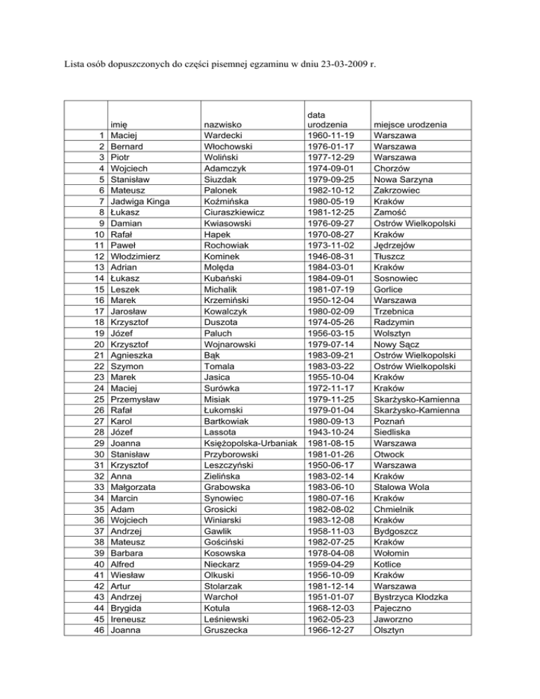 Lista osób dopuszczonych do części pisemnej egzaminu w dniu 23-03-2009 r. 1 2 3 4 5 6 7 8 9 10 11 12 13 14 15 16 17 18 19 20 21 22 23 24 25 26 27 28 29 30 31 32 33 34 35 36 37 38 39 40 41 42 43 44 45 46 imię Maciej Bernard Piotr Wojciech Stanisław Mateusz Jadwiga Kinga Łukasz Damian Rafał Paweł Włodzimierz Adrian Łukasz Leszek Marek Jarosław Krzysztof Józef Krzysztof Agnieszka Szymon Marek Maciej Przemysław Rafał Karol Józef Joanna Stanisław Krzysztof Anna Małgorzata Marcin Adam Wojciech Andrzej Mateusz Barbara Alfred Wiesław Artur Andrzej Brygida Ireneusz Joanna nazwisko Wardecki Włochowski Woliński Adamczyk Siuzdak Palonek Koźmińska Ciuraszkiewicz Kwiasowski Hapek Rochowiak Kominek Molęda Kubański Michalik Krzemiński Kowalczyk Duszota Paluch Wojnarowski Bąk Tomala Jasica Surówka Misiak Łukomski Bartkowiak Lassota Księżopolska-Urbaniak Przyborowski Leszczyński Zielińska Grabowska Synowiec Grosicki Winiarski Gawlik Gościński Kosowska Nieckarz Olkuski Stolarzak Warchoł Kotula Leśniewski Gruszecka data urodzenia 1960-11-19 1976-01-17 1977-12-29 1974-09-01 1979-09-25 1982-10-12 1980-05-19 1981-12-25 1976-09-27 1970-08-27 1973-11-02 1946-08-31 1984-03-01 1984-09-01 1981-07-19 1950-12-04 1980-02-09 1974-05-26 1956-03-15 1979-07-14 1983-09-21 1983-03-22 1955-10-04 1972-11-17 1979-11-25 1979-01-04 1980-09-13 1943-10-24 1981-08-15 1981-01-26 1950-06-17 1983-02-14 1983-06-10 1980-07-16 1982-08-02 1983-12-08 1958-11-03 1982-07-25 1978-04-08 1959-04-29 1956-10-09 1981-12-14 1951-01-07 1968-12-03 1962-05-23 1966-12-27 miejsce urodzenia Warszawa Warszawa Warszawa Chorzów Nowa Sarzyna Zakrzowiec Kraków Zamość Ostrów Wielkopolski Kraków Jędrzejów Tłuszcz Kraków Sosnowiec Gorlice Warszawa Trzebnica Radzymin Wolsztyn Nowy Sącz Ostrów Wielkopolski Ostrów Wielkopolski Kraków Kraków Skarżysko-Kamienna Skarżysko-Kamienna Poznań Siedliska Warszawa Otwock Warszawa Kraków Stalowa Wola Kraków Chmielnik Kraków Bydgoszcz Kraków Wołomin Kotlice Kraków Warszawa Bystrzyca Kłodzka Pajeczno Jaworzno Olsztyn 47 48 49 50 51 52 53 54 55 56 57 58 59 60 61 62 63 64 65 66 67 68 69 70 71 72 73 74 75 76 77 78 79 80 81 82 83 84 85 86 87 88 89 90 91 92 93 94 95 96 97 98 Jarosław Sławomir Marcin Zenon Jakub Adam Rafał Paweł Marek Katarzyna Piotr Dariusz Maciej Tomasz Janusz Jerzy Paweł Ryszard Krzysztof Beata Sławomir Jerzy Grzegorz Wiesław Sławomir Jarosław Jakub Jerzy Piotr Krzysztof Marcin Bogusław Marek Michał Janusz Sławomir Magdalena Sebastian Radosław Tomasz Wojciech Paweł Andrzej Leszek Andrzej Rafał Izabella Joanna Paweł Przemysław Katarzyna Katarzyna Miech Kramer Wojciechowski Miech Grabarkiewicz Delikat Pflaum Brożek Jóźwiak Włodek Sadowski Mendyk Podkowiński Kowal Kłaput Hyk Śmiszek Woźniak Marsolek Tryka Pałupski Krupa Trzaska Otrębowski Hatalski Malczycki Berwid Guśtak Grochowy Nowak Czech Czech Murat Gluza Jaskulski Wojtkowiak Bochenek Palenica Cichocki Jurczak Opałka Wysocki Rolecki Rodek Jejer Jamróz Kłaput Kręcioch Jabłecki Pochitonow Nowak - Dziedziszko Laskus 1979-07-08 1983-12-19 1980-08-24 1949-07-29 1983-09-14 1963-01-17 1983-09-18 1983-10-21 1966-02-14 1982-06-07 1978-07-19 1980-10-09 1975-01-26 1979-03-15 1982-02-26 1958-11-26 1979-03-18 1940-05-20 1972-05-07 1978-02-09 1963-09-04 1954-04-14 1983-01-05 1959-07-15 1975-09-04 1971-05-04 1980-08-25 1965-07-30 1983-01-07 1982-08-07 1982-05-19 1957-12-04 1960-02-19 1949-07-13 1970-07-09 1980-08-17 1980-02-18 1980-01-17 1978-03-21 1980-07-08 1977-09-07 1957-12-05 1960-01-05 1953-05-11 1960-08-18 1974-09-24 1980-01-31 1975-07-27 1972-06-25 1961-12-25 1979-08-01 1980-05-26 Zielona Góra Jarocin Poznań Rybaki (Rosja) Gniezno Tarnobrzeg Wrocław Busko-Zdrój Gniezno Kraków Nowy Tomyśl Oświęcim Warszawa Przemyśl Wadowice Wrocław Kraków Września Strzelce Opolskie Tczew Piotrków Trybunalski Wrocław Kraków Ziębice Bielsko-Biała Bytom Poznań Kraków Leszno Nowy Tomyśl Kraków Kraków Resk Ciepłowody Gdynia Wolsztyn Szczecin Przemyśl Konin Nowy Sącz Żołynia Łówkowice Koprzywnica Sosnowiec Gołdap Sucha Beskidzka Wadowice Wadowice Warszawa Kraków Proszowice Słupsk 99 100 101 102 103 104 105 106 107 108 109 110 111 112 113 114 115 116 117 118 119 120 121 122 123 124 125 126 127 128 129 130 131 132 133 134 135 136 137 138 139 140 141 142 143 144 145 146 147 148 149 150 Bogdan Krzysztof Tomasz Jarosław Jarosław Henryk Robert Jarosław Grzegorz Andrzej Paweł Paulina Henryk Marcin Piotr Marek Adam Cezary Stanisław Jarosław Szymon Tomasz Izabela Krzysztof Dariusz Krzysztof Tomasz Jerzy Zbigniew Krzysztof Michał Franciszek Paweł Andrzej Łukasz Marcin Mirosława Alicja Artur Janusz Bogdan Michał Anna Krystiaqn Piotr Bogdan Piotr Ryszarda Ireneusz Kamil Piotr Izabela Robert Guźliński Sawicki Konieczka Głaz Uliński Laskus Papierowski Huzarski Dyś Krawczyk Cyrek Bogacka Adamczyk Skibiński Dziura Sopot Szary Olszewski Kraj Dąbrowski Kuczyński Boguszewski Kozłowicz Olchawa Przybylski Domino Sodowski Hausner Brusik Kędzior Lutowski Gasiński Truchan Klich Makoś Przystupa Polak-Ćwik Kazimierczak-Ślipek Karaś Rutkowski Strugała Zgirski Bronakowska Krawczyk Daniów Korus Padło Wojtasiewicz Nagaj Solecki Naumowicz Ochnik 1983-09-11 1959-03-26 1983-01-05 1968-07-20 1983-01-05 1953-11-10 1976-02-27 1964-03-04 1975-02-18 1945-06-02 1983-06-29 1981-02-12 1977-02-15 1979-02-20 1961-03-22 1962-04-21 1981-03-13 1961-01-29 1943-09-29 1974-01-19 1982-12-26 1978-02-22 1979-05-07 1978-27-10 1963-07-05 1982-04-09 1977-03-10 1958-05-27 1978-02-28 1980-11-23 1981-02-18 1946-01-17 1979-06-15 1951-01-02 1981-01-07 1978-10-26 1964-09-30 1954-08-26 1980-05-10 1961-03-28 1978-11-20 1979-11-23 1974-10-19 1978-01-25 1966-06-17 1982-11-15 1958-02-06 1967-04-12 1983-05-16 1980-09-01 1980-06-14 1983-01-15 Gdynia Warszawa Września Tomaszów Lubelski Węgrów Słupsk Świecie Legnica Bychawa Olszewice Sanok Krotoszyn Nowy Wiśnicz Nysa Wałbrzych Katowice Chorzów Golczewo