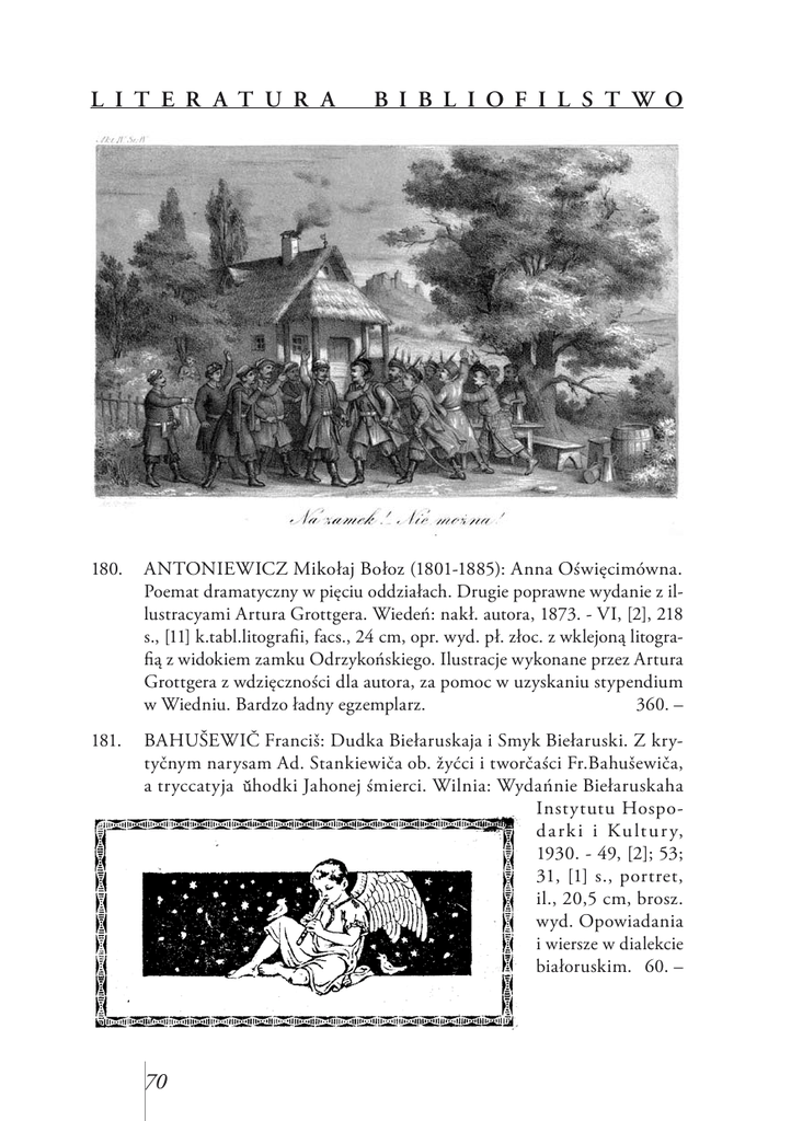 L I T E R A T U R A B I B L I O F I L S T W O 180. ANTONIEWICZ Mikołaj Bołoz (1801-1885): Anna Oświęcimówna. Poemat dramatyczny w pięciu oddziałach. Drugie poprawne wydanie z illustracyami Artura Grottgera. Wiedeń: nakł. autora, 1873. - VI, [2], 218 s., [11] k.tabl.litografii, facs., 24 cm, opr. wyd. pł. złoc. z wklejoną litografią z widokiem zamku Odrzykońskiego. Ilustracje wykonane przez Artura Grottgera z wdzięczności dla autora, za pomoc w uzyskaniu stypendium w Wiedniu. Bardzo ładny egzemplarz. 360. – 181. BAHUŠEWIČ Franciš: Dudka Biełaruskaja i Smyk Biełaruski. Z krytyčnym narysam Ad. Stankiewiča ob. žyćci i tworčaści Fr.Bahušewiča, a tryccatyja ǔhodki Jahonej śmierci. Wilnia: Wydańnie Biełaruskaha Instytutu Hospod a rk i i Ku lt u r y, 1930. - 49, [2]; 53; 31, [1] s., portret, il., 20,5 cm, brosz. wyd. Opowiadania i wiersze w dialekcie białoruskim. 60. – 70 182. [BĄCZKOWSKI Dionizy] (1868-1953): Księża dola, napisał Niekrasicki. [acc.: tenże] Miłosierdzie Kimury. [acc.: tenże] Tangosimja albo małpi taniec. Dodatek do czasopisma „Ziemia wschodnia”. Pińsk: [Druk B.Koziełł, 1936]. – 8; 8; 24 s., 17,5 cm, współopr. pł. Zbiór krótkich utworów satyrycznych wierszem. Zach. okładki broszur. 100. – 183. BOCCACCIO Giovanni (1313-1375): Dekameron. Pełne wydanie stu opowieści. Przeł. z włoskiego, komentarzami i posłowiem opatrzył E.Boye, słowo wstepne K.Makuszyńskiego, ilustracje Maji Berezowskiej. Warszawa: Bibljoteka Arcydzieł Literatury, 1930. - XXXII, [4], 745, [1] s., [20] k.tabl., 27 cm, opr. wyd. pł. zdob. Podkreślone 7 wersów wstępu, wpis własnościowy. Ładny egzemplarz. 300. – 71 184. BOGUSŁAWSKA Barbara: Kongregacja Towarzyszy Kunsztu Drukarskiego w Krakowie w XVII i XVIII wieku. Warszawa: Druk Szkoły Przemysłu Graficznego, 1929. - 103 s., 23 cm, brosz. wyd. 50. – 185. BOHDANOWICZOWA Zofia (1898-1965): Podróż Maciusia. Ilustr. i układ: A.Szymańska. Londyn: Wyd. Kom. Red. miesięcznika „Dziatwa”, [ok.1952]. - 62, [1] s., il., 18 × 25 cm, brosz. wyd. Stempel Głównej Komisji Skarbu Narodowego oraz znaczki: 2 × 2 złote Skarb Narodowy Polski Niepodległej. Bogato ilustrowane wierszowane opowiadanie dla dzieci. Stan nienaganny. 60. – 186. BRODZIŃSKI Kazimierz (1791-1835): O literaturze. Wydanie Kazimierza Józefa Turowskiego. Sanok: Karol Pollak, 1856. - [4], 468, [2] s., 19 cm, opr. pł. Paginacja ostatnich stron błędna, podana właściwa, tył okładki z odbarwionymi plamkami, blok czysty. 120. – 187. BRZEG-PISKOZUB Adam (1891-1951): Zmierzch romantyzmu. Zarys poezyi powstania styczniowego. Lwów: Kultura i Sztuka, [po 1913]. - [8], 147, [4] s., 19 cm, opr. pl. 45. – 72 188. CZECHOWICZ Józef (1903-1939): Kamień. Lublin: Bibljoteka Reflektora, 1927. - 23 s., 28 cm, brosz. wyd. Pierwszy tomik wierszy przywódcy tzw. drugiej awangardy. Zachowana przednia okładka zakurzona i nadkruszona na krawędziach. Blok czysty. Wielka rzadkość. 200. – 189. CZYŻEWSKI Tytus: Osioł i słońce w metamorfozie. Włamywacz z lepszego towarzystwa (1 akt 10 minut). Kraków: Sgł. Gebethner i Wolff, 1922. - [2], 40 s., 16 cm, brosz. wyd. 150. – 190. CZYŻEWSKI Tytus (1880-1945): Wąż, Orfeusz i Euridika. Wizja antyczna. Rysunki graficzne w tekście przez T.Czyżewskiego. Wykonał grafik Fr. Benisz. Kraków: Instytut Wydawniczy „Niezależnych”, 1922. - [32] s., il., 15 cm, brosz. wyd. Poemat sceniczny, wyd. 1. i jedyne. 150. – poz. 190 191. DER DOWSK I Jarosz (1852-1902): O Panu Czorlińscim co do Pucka pe sece jachoł. Zełgoł dlo swojech druchow kaszubściech …Wedała po raz drudzi bez zmiane redakcyo „Gryfa”. Z wizerunciem autora i opisem jego żecu. Kościerzyna: S.Buszczyński w Toruniu, 1911. - XVI, 167 s., portret, 19 cm, opr. pł. Zdezaktualizowane stemple. Pisma Jarosza Derdowskiego. T.1. Rzadko spotykany utwór w dialekcie kaszubskim. 75. – 192. DOŁĘGA [Mostowicz ?] Tadeusz: Tancerka. Poezje. Fragmenty. Włocławek: druk B-ci Piotrowskich, 1920. - 82, [2] s., 23 cm, brosz. wyd. Instnieje znaczne prawdopodobieństwo, że jest to debiut Dołęgi-Mostowicza, przemilczany w później- 73 szym okresie, ze względu na wiersz pt.: „Naczelnik” poświęcony Józefowi Piłsudskiemu. Okładka zaplamiona, blok czysty. 150. – 193. [FUCHS Stanisław] Arlekin (1888-?): Jesienne burze. Wiersze. Lwów: Sgł. H.Altenberg, G.Seyfarth, E.Wende, [b.r.]. - 148 s., 18 cm, brosz. wyd. Wczesne wiersze znanego przemysłowca, konsula księcia Monaco w Polsce. 50. – 194. [GADOMSKI (1859-1906)] Pamięci Jana Gadomskiego. Koledzy. Red. Zdzisław Dębicki. Wydawca Kazimiera Gadomska. Warszawa: Biblioteka Dzieł Wyborowych, 1907. - 221, [1], II s., il., ozdobniki, [1] k.tabl., 16 × 22 cm, opr. wyd. pł. Księga poświęcona pamięci literata i publicysty, redaktora „Gazety Polskiej” oraz serii książkowej „Biblioteki Dzieł Wyborowych”. Inicjatorem wydania był Henryk Sienkiewicz. W projekcie wzieli udział m.in.: I.Baliński, T.Jeske-Choiński, W.Gomulicki, J.Kasprowicz, M.Konopnicka, Al.Kraushar, J.Lorentowicz, H.Sienkiewicz, K.Przerwa-Tetmajer. 120. – 195. HEMAR Marian: Koń trojański. Warszawa: J.Przeworski, 1936. - 191, [1] s., il., 23 cm, opr. ppł. Okładka i rysunki Pika. Zachowana okładka broszury. 90. – 74 196. HEMAR Marian: Lata londyńskie. Londyn: Stowarzyszenie Pisarzy Polskich, 1946. - 43, [1] s., 22 cm, brosz. wyd. Pierwodruk emigracyjnego zbioru poezji z 22 utworami. Wśród wierszy m.in. „Piłsudski” i „Maj we Lwowie”. Egz. idealny. 60. – 197. HEMAR Marian: Siedem lat chudych. New York: Roy Publishers, 1955. - 399 s., 21 cm, opr. wyd. pł. Obszerny zbiór utworów poetyckich ze znakomitym podtekstem satyrycznym: „Kiedy Stalin, wolności Najwyższy autorytet, Każe robić swym rabom Konstytucyjny Komitet…” 90. – 198. HERBERT Zbigniew (1924-1998): Elegia na odejście. Paryż: Instytut Literacki, 1990. – 46, [2] s., 22 cm, brosz. wyd. Biblio