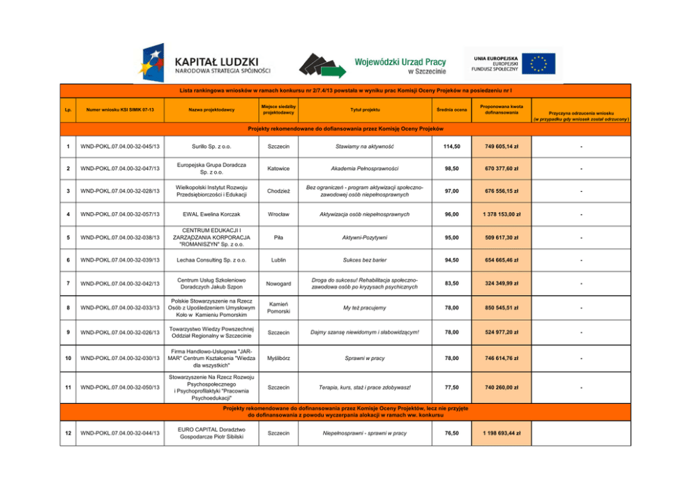 Lista rankingowa wniosków w ramach konkursu nr 2/7.4/13 powstała w wyniku prac Komisji Oceny Projeków na posiedzeniu nr I Lp. Numer wniosku KSI SIMIK 07-13 Miejsce siedziby projektodawcy Nazwa projektodawcy Tytuł projektu Średnia ocena Proponowana kwota dofinansowania Przyczyna odrzucenia wniosku (w przypadku gdy wniosek został odrzucony ) Projekty rekomendowane do dofiansowania przez Komisję Oceny Projeków 1 WND-POKL.07.04.00-32-045/13 Surillo Sp. z o.o. Szczecin Stawiamy na aktywność 114,50 749 605,14 zł - 2 WND-POKL.07.04.00-32-047/13 Europejska Grupa Doradcza Sp. z o.o. Katowice Akademia Pełnosprawności 98,50 670 377,60 zł - 3 WND-POKL.07.04.00-32-028/13 Wielkopolski Instytut Rozwoju Przedsiębiorczości i Edukacji Chodzież Bez ograniczeń - program aktywizacji społecznozawodowej osób niepełnosprawnych 97,00 676 556,15 zł - 4 WND-POKL.07.04.00-32-057/13 EWAL Ewelina Korczak Wrocław Aktywizacja osób niepełnosprawnych 96,00 1 378 153,00 zł - 5 WND-POKL.07.04.00-32-038/13 CENTRUM EDUKACJI I ZARZĄDZANIA KORPORACJA "ROMANISZYN" Sp. z o.o. Piła Aktywni-Pozytywni 95,00 509 617,30 zł - 6 WND-POKL.07.04.00-32-039/13 Lechaa Consulting Sp. z o.o. Lublin Sukces bez barier 94,50 654 665,46 zł - 7 WND-POKL.07.04.00-32-042/13 Centrum Usług Szkoleniowo Doradczych Jakub Szpon Nowogard Droga do sukcesu! Rehabilitacja społecznozawodowa osób po kryzysach psychicznych 83,50 324 349,99 zł - 8 WND-POKL.07.04.00-32-033/13 Polskie Stowarzyszenie na Rzecz Osób z Upośledzeniem Umysłowym Koło w Kamieniu Pomorskim Kamień Pomorski My też pracujemy 78,00 850 545,51 zł - 9 WND-POKL.07.04.00-32-026/13 Towarzystwo Wiedzy Powszechnej Oddział Regionalny w Szczecinie Szczecin Dajmy szansę niewidomym i słabowidzącym! 78,00 524 977,20 zł - 10 WND-POKL.07.04.00-32-030/13 Firma Handlowo-Usługowa "JARMAR" Centrum Kształcenia "Wiedza dla wszystkich" Myślibórz Sprawni w pracy 78,00 746 614,76 zł - 11 WND-POKL.07.04.00-32-050/13 Stowarzyszenie Na Rzecz Rozwoju Psychospołecznego i Psychoprofilaktyki "Pracownia Psychoedukacji" Szczecin Terapia, kurs, staż i prace zdobywasz! 77,50 740 260,00 zł - Projekty rekomendowane do dofinansowania przez Komisje Oceny Projektów, lecz nie przyjęte do dofinansowania z powodu wyczerpania alokacji w ramach ww. konkursu 12 WND-POKL.07.04.00-32-044/13 EURO CAPITAL Doradztwo Gospodarcze Piotr Sibilski Szczecin Niepełnosprawni - sprawni w pracy 76,50 1 198 693,44 zł 13 WND-POKL.07.04.00-32-032/13 Powiat Gryficki/Powiatowy Urząd Pracy w Gryficach Gryfice PRACUJ BEZ BARIER 74,00 291 036,54 zł - Projekty odrzucone 14 WND-POKL.07.04.00-32-058/13 Profi Biznes Group Sylwia Karina Majewska Szczecin Aktywizacja zawodowa osób niepełnosprawnych z województwa zachodniopomorskiego 69,00 0,00 zł Projekt nie spełnia minimum punktowego w częściach 3.1 i 3.4, 3.2, 3.3 15 WND-POKL.07.04.00-32-034/13 Stowarzyszenie B-4 Rzeszów Praca bez barier 67,00 0,00 zł Projekt nie spełnia minimum punktowego w częściach 3.1 i 3.4, 3.3 16 WND-POKL.07.04.00-32-029/13 Biuro Consultingowo-Handlowe Gwarancja Jan Guss Poznań Koszalińskie Centrum Umiejętności i Motywacji II 60,00 0,00 zł Projekt nie spełnia minimum punktowego w częściach 3.1 i 3.4, 3.3, IV 17 WND-POKL.07.04.00-32-053/13 Usługi Edukacyjne eduCafe Dominika Pfeif Kołobrzeg Akademia Rehabilitacji Zawodowej 59,00 0,00 zł Projekt nie spełnia minimum punktowego ogółem oraz w częściach 3.1 i 3.4, 3.2, IV 18 WND-POKL.07.04.00-32-055/13 Stowarzyszenie na Rzecz Rozwoju Powiatu Sławieńskiego Sławno Wybierz aktywność zawodową - postaw na sukces 54,50 0,00 zł Projekt nie spełnia minimum punktowego ogółem oraz w częściach 3.1 i 3.4, 3.2, 3.3, IV 19 WND-POKL.07.04.00-32-027/13 MR JOB Agencja Pracy Tymczasowej Rafał Borowski Legnica Aktywizujmy razem 0,00 0,00 zł Projekt nie spełnia kryterium dostępu nr 2 oraz 4 20 WND-POKL.07.04.00-32-031/13 Powiat Pyrzycki/Powiatowy Urząd Pracy w Pyrzycach Pyrzyce CZAS NA PRACĘ 0,00 0,00 zł Projekt nie spełnia kryterium dostępu nr4 21 WND-POKL.07.04.00-32-035/13 Centrum Szkoleń i Innowacji Grzegorz Miszczak Motycz Profesjonalni niepełnosprawni 0,00 0,00 zł Projekt nie spełnia kryterium dostępu nr 2 22 WND-POKL.07.04.00-32-036/13 Eureka Sp. z o.o. Dopiewo Życie (i staż) zaczyna się po pięćdziesiątce! Kompleksowy program aktywizacji zawodowej dla niepełnosprawnych mieszkańców woj. zachodniopomorskiego po 50 roku życia 0,00 0,00 zł Projekt nie spełnia kryterium dostępu nr4 23 WND-POKL.07.04.00-32-037/13 Wyższa Szkoła Integracji Europejskiej w Szczecinie Szczecin Rynek pracy otwarty na wszystkich 0,00 0,00 zł Projekt nie spełnia kryterium dostępu nr 2 24 WND-POKL.07.04.00-32-040/13 NJ Karol Leszek Kruszel Szczecin Z prawem jazdy do pracy 0,00 0,00 zł Projekt nie spełnia kryterium dostępu nr4 25 WND-POKL.07.04.00-32-041/13 Stowarzyszenie Aktywnego Wspierania Gospodarki Wrocław Sprawni w życiu i pracy 0,00 0,00 zł Projekt nie spełnia kryterium dostępu nr 2 26 WND-POKL.07.04.00-32-043/13 Centrum Usług Szkoleniowo Doradczych Jakub Szpon Nowogard Praca Twoim Sukcesem 0,00 0,00 zł Projekt nie spełnia kryterium dostępu nr 6 27 WND-POKL.07.04.00-32-046/13 Polsko-Amerykańskie Szkoły Prywatne Sp. z o.o. Szczecin Osoby niepełnosprawne - pełnosprawne na rynku 0,00 0,00 zł Projekt nie spełnia kryterium dostępu nr 2 28 WND-POKL.07.04.00-32-048/13 Związek Pracodawców Pomorza Zachodniego Lewiatan Szczecin Kuźnia optymizmu 0,00 0,00 zł Projekt nie spełnia kryterium dostępu nr 6 29 WND-POKL.07.04.00-32-049/13 GAMA-TRANS SP. Z O.O. Poznań Aktywizacja zawodowa i społeczna osób niepełnosprawnych 0,00 0,00 zł Projekt nie spełnia kryterium dostępu nr 1 oraz 2 30 WND-POKL.07.04.00-32-051/13 Szczecińska Szkoła Wyższa Collegium Balticum Szczecin Młodzi operatywni na rynku pracy! 0,00 0,00 zł Projekt nie spełnia kryterium dostępu nr 2 31 WND-POKL.07.04.00-32-052/13 Zakład Doskonalenia Zawodowego w Słupsku Słupsk Ni