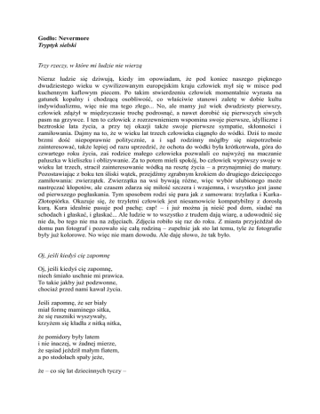 Godło: Nevermore Tryptyk sielski Trzy rzeczy, w które mi ludzie nie wierzą Nieraz ludzie się dziwują, kiedy im opowiadam, że pod koniec naszego pięknego dwudziestego wieku w cywilizowanym europejskim kraju człowiek mył się w misce pod kuchennym kaflowym piecem. Po takim stwierdzeniu człowiek momentalnie wyrasta na gatunek kopalny i chodzącą osobliwość, co właściwie stanowi zaletę w dobie kultu indywidualizmu, więc nie ma tego złego... No, ale mamy już wiek dwudziesty pierwszy, człowiek zdążył w międzyczasie trochę podrosnąć, a nawet dorobić się pierwszych siwych pasm na grzywce. I ten to człowiek z rozrzewnieniem wspomina swoje pierwsze, idylliczne i beztroskie lata życia, a przy tej okazji także swoje pierwsze sympatie, skłonności i zamiłowania. Dajmy na to, że w wieku lat trzech człowieka ciągnęło do wódki. Dziś to może brzmi dość niepoprawnie politycznie, a i sąd rodzinny mógłby się niepotrzebnie zainteresować, także lepiej od razu uprzedzić, że ochota do wódki była krótkotrwała, góra do czwartego roku życia, zaś rodzice małego człowieka pozwalali co najwyżej na maczanie paluszka w kieliszku i oblizywanie. Za to potem mieli spokój, bo człowiek wypiwszy swoje w wieku lat trzech, stracił zainteresowanie wódką na resztę życia – a przynajmniej do matury. Pozostawiając z boku ten śliski wątek, przejdźmy zgrabnym krokiem do drugiego dziecięcego zamiłowania: zwierzątek. Zwierzątka na wsi bywają różne, więc wybór ulubionego może nastręczać kłopotów, ale czasem zdarza się miłość szczera i wzajemna, i wszystko jest jasne od pierwszego pogłaskania. Tym sposobem rodzi się para jak z samowara: trzylatka i KurkaZłotopiórka. Okazuje się, że trzyletni człowiek jest niesamowicie kompatybilny z dorosłą kurą. Kura idealnie pasuje pod pachę; cap! – i już można ją nieść pod dom, siadać na schodach i głaskać, i głaskać... Ale ludzie w to wszystko z trudem dają wiarę, a udowodnić się nie da, bo tego nie ma na zdjęciach. Zdjęcia robiło się raz do roku. Z miasta przyjeżdżał do domu pan fotograf i pozowało się całą rodziną – zupełnie jak sto lat temu, tyle że fotografie były już kolorowe. No więc nie mam dowodu. Ale daję słowo, że tak było. Oj, jeśli kiedyś cię zapomnę Oj, jeśli kiedyś cię zapomnę, niech śmiało uschnie mi prawica. To takie jakby już podzwonne, chociaż przed nami kawał życia. Jeśli zapomnę, że ser biały miał formę maminego sitka, że się ruszniki wyszywały, krzyżem się kładła z nitką nitka, że pomidory były latem i nie inaczej, w żadnej mierze, że sąsiad jeździł małym fiatem, a po stodołach spały jeże, że – co się lat dziecinnych tyczy – ze zsiadłym mlekiem żując placki, nie pojmowaliśmy goryczy dowcipu: do you speak chachłacki? Że były listy na papierze, krążki na piecu, mróz na szybach i grubo ponad jedno zwierzę na każdy dom. I jeszcze chyba bluzy po bracie, jazdy konne, sklep, a za sklepem piaskownica... Jeśli to wezmę i zapomnę, to niech usycha mi prawica. W życie I jakby wpadło tu z wizytą, odchodzi lato. Całe lata. I w życie wchodzi się jak w żyto, wyjeżdża gdzieś na koniec świata. Nic nie zostało po tamtym życie.