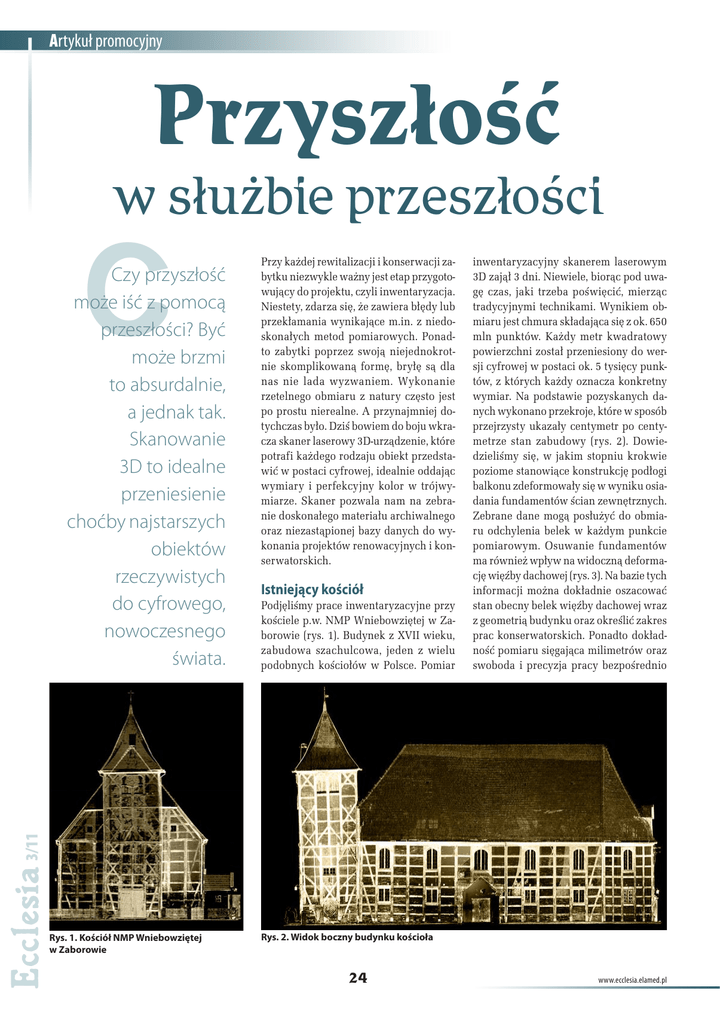 Artykuł promocyjny Przyszłość w służbie przeszłości C Przy każdej rewitalizacji i konserwacji zabytku niezwykle ważny jest etap przygotowujący do projektu, czyli inwentaryzacja. Niestety, zdarza się, że zawiera błędy lub przekłamania wynikające m.in. z niedoskonałych metod pomiarowych. Ponadto zabytki poprzez swoją niejednokrotnie skomplikowaną formę, bryłę są dla nas nie lada wyzwaniem. Wykonanie rzetelnego obmiaru z natury często jest po prostu nierealne. A przynajmniej dotychczas było. Dziś bowiem do boju wkracza skaner laserowy 3D-urządzenie, które potrafi każdego rodzaju obiekt przedstawić w postaci cyfrowej, idealnie oddając wymiary i perfekcyjny kolor w trójwymiarze. Skaner pozwala nam na zebranie doskonałego materiału archiwalnego oraz niezastąpionej bazy danych do wykonania projektów renowacyjnych i konserwatorskich. Istniejący kościół Podjęliśmy prace inwentaryzacyjne przy kościele p.w. NMP Wniebowziętej w Zaborowie (rys. 1). Budynek z XVII wieku, zabudowa szachulcowa, jeden z wielu podobnych kościołów w Polsce. Pomiar inwentaryzacyjny skanerem laserowym 3D zajął 3 dni. Niewiele, biorąc pod uwagę czas, jaki trzeba poświęcić, mierząc tradycyjnymi technikami. Wynikiem obmiaru jest chmura składająca się z ok. 650 mln punktów. Każdy metr kwadratowy powierzchni został przeniesiony do wersji cyfrowej w postaci ok. 5 tysięcy punktów, z których każdy oznacza konkretny wymiar. Na podstawie pozyskanych danych wykonano przekroje, które w sposób przejrzysty ukazały centymetr po centymetrze stan zabudowy (rys. 2). Dowiedzieliśmy się, w jakim stopniu krokwie poziome stanowiące konstrukcję podłogi balkonu zdeformowały się w wyniku osiadania fundamentów ścian zewnętrznych. Zebrane dane mogą posłużyć do obmiaru odchylenia belek w każdym punkcie pomiarowym. Osuwanie fundamentów ma również wpływ na widoczną deformację więźby dachowej (rys. 3). Na bazie tych informacji można dokładnie oszacować stan obecny belek więźby dachowej wraz z geometrią budynku oraz określić zakres prac konserwatorskich. Ponadto dokładność pomiaru sięgająca milimetrów oraz swoboda i precyzja pracy bezpośrednio 3/11 Czy przyszłość może iść z pomocą przeszłości? Być może brzmi to absurdalnie, a jednak tak. Skanowanie 3D to idealne przeniesienie choćby najstarszych obiektów rzeczywistych do cyfrowego, nowoczesnego świata. Rys. 1. Kościół NMP Wniebowziętej w Zaborowie Rys. 2. Widok boczny budynku kościoła 24 www.ecclesia.elamed.pl Artykuł promocyjny na modelu 3D dają niezmiernie dokładny obraz stanu rzeczywistego. Identyczna sytuacja występuje w przypadku obmiaru wieży kościelnej (rys. 4). Precyzja pomiaru inwentaryzacyjnego wewnątrz oraz zewnątrz pozwala na niezwykle precyzyjne określenie stopnia odchylenia wieży od pionu. Ponadto, biorąc pod uwagę przekrój wieży, można określić, w którym punkcie następuje deformacja. Pozyskany materiał w sposób precyzyjny wskazuje miejsce, gdzie należy podjąć prace konserwatorskie oraz jaką przyjąć metodę zabezpieczenia obiektu. Na dowód niezwykłej precyzji skanowania 3D należy przytoczyć fakt, że błąd rejestracji wspólnego układu współrzędnych dla całego obiektu nie przekroczył 5 mm. Zarejestrowana chmura punktów wraz z informacjami o kolorach (RGB) może posłużyć jako idealny materiał archiwizacyjny. Przy standardowym oprogramowaniu obraz można dowolnie powiększać, przesuwać i obracać dla każdego ujęcia. Uniwersalność skanowania 3D Rys. 3. Przekrój poprzeczny filmów promocyjnych. Dzięki technologii skanowania trójwymiarowego uwalniamy się od najbardziej pracochłonnej czynności – tradycyjnego pomiaru geometrii obiektu. Cały nasz czas i uwagę można skupić na analizowaniu obiektu oraz na zapisywaniu obserwacji, unikając błędów pomiarowych. Stosując technologię skanowania trójwymiarowego, mamy możliwość pozyskania informacji o całym obiekcie, na każdym jego centymetrze, wręcz milimetrze, a nie, jak to się odbywa w metodach klasycznych, tylko w wybranych punktach pomiarowych. Ideą i absolutnie bezkonkurencyjną zaletą skanowania 3D jest wszechstronność wykorzystania jednorazowo pobranego materiału do różnych zastosowań w dziedzinach naukowych, konserwatorskich, inżynieryjnych i innych. q Scanning 3D 64-100 Leszno, ul. Zielona 14 tel. 65 520 33 13, fax 65 520 21 14 e-mail: [email protected] www.scanning3d.pl 3/11 Tego typu narzędzie pomiarowe umożliwia również odczytanie współrzędnych X, Y, Z dowolnie określonego punktu oraz zmierzenie go w przestrzennej odległości między wybranymi punktami. Poza zaprezentowanym materiałem, uzyskanym na podstawie skanowania 3D, można dokonywać dodatkowych obmiarów na potrzeby konserwatorskie, a także generować materiały w postaci ortofotografii, mapy wgłębień czy rzutów hipsometrycznych. Posiadane dane z inwentaryzacji trójwymiarowej wykorzystuje się również do tworzenia animacji czy Rys. 4. Widok w postaci chmury punktów [email protected] 25