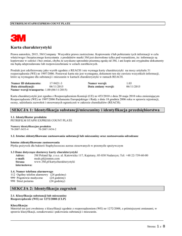 PETRIFILM STAPH EXPRESS COUNT PLATE Karta charakterystyki Prawa autorskie, 2015, 3M Company Wszystkie prawa zastrzeżone. Kopiowanie i/lub pobieranie tych informacji w celu właściwego i bezpiecznego korzystania z produktów marki 3M jest dozwolone tylko pod warunkiem, że: informacje są kopiowane w całości i bez zmian, chyba że uzyskano uprzednio pisemną zgodę od 3M, i ani kopie ani oryginalne dokumenty nie będą odsprzedawane lub rozpowszechniane w celach zarobkowych. Produkt jest zdefiniowany jako wyrób zgodnie z REACH i nie wymaga karty charakterytyki na mocy artykułu 31 rozporządzenia (WE) nr 1907/2006. Ponieważ karta nie jest wymagana, dokument ten nie zawiera wszystkich informacji, które są wymagane dla substancji i mieszanin w kartach charakterystyki w ramach REACH. 17-9421-3 Numer ID dokumentu: 06/11/2015 Data aktualizacji: Numer wersji transportu: 1.00 (06/11/2015) Numer wersji: Data zmiany wersji: 1.03 06/11/2015 Karta charakterystyki jest zgodna z Rozporządzeniem Komisji (UE) nr 453/2010 z dnia 20 maja 2010 roku zmieniającym Rozporządzenie (WE) nr 1907/2006 Parlamentu Europejskiego i Rady z dnia 18 grudnia 2006 roku w sprawie rejestracji, oceny, udzielania zazwoleń i stosowanych ograniczeń w zakresie chemikaliów (REACH). SEKCJA 1: Identyfikacja substancji/mieszaniny i identyfikacja przedsiębiorstwa 1.1. Identyfikator produktu PETRIFILM STAPH EXPRESS COUNT PLATE Numery identyfikacyjne produktu 70-2007-3453-4 70-2007-3454-2 1.2. Istotne zidentyfikowane zastosowania substancji lub mieszaniny oraz zastosowania odradzane Istotne zidentyfikowane zastosowania Płytka pożywek dla bakterii Staphylococcus aureus stosowanych w przemyśle spożywczym 1.3 Dane dotyczące dostawcy karty charakterystyki 3M Poland Sp. z o.o. al. Katowicka 117, Kajetany, 05-830 Nadarzyn; Tel: +48 22-739-60-00 Adres: [email protected] e-mail: www.3M.pl/kartycharakterystyki Strona internetowa: 1.4. Numer telefonu alarmowego 112 Ogólny telefon alarmowy (24 godziny) 999 Pogotowie medyczne (24 godziny) 998 Straż pożarna (24 godziny) SEKCJA 2: Identyfikacja zagrożeń 2.1. Klasyfikacja substancji lub mieszaniny Rozporządzenie (WE) nr 1272/2008 (CLP) Klasyfikacja: Materiał ten jest zwolniony z klasyfikacji zgodnie z rozporządzeniem (WE) nr 1272/2008, z późniejszymi zmianami, w sprawie klasyfikacji, oznakowania i pakowania substancji i mieszanin. __________________________________________________________________________________________ Strona: 1 z 8 PETRIFILM STAPH EXPRESS COUNT PLATE 2.2. Elementy oznakowania Rozporządzenie (WE) nr 1272/2008 (CLP) Nie dotyczy 2.3. Inne zagrożenia Nieznane SEKCJA 3: Skład/informacja o składnikach Nazwa substancji Nr CAS Nr WE Stężenie % Klasyfikacja Pożywka powleczona na papierze z pianką Mieszanina Brak 100 Nieklasyfikowana jako wspierającą i arkuszem folii niebezpieczna W sekcji 16 znajduje się pełny tekst zwrotów H użytych w powyższej tabeli. W sekcji 15 znajdują się obowiązujące rozporządzenia, które zostały zastosowane do powyższych komponentów. Informacje dotyczące najwyższych dopuszczalnych stężeń i substancji PBT i vPvB znajdują się w sekcji 8 i 12 karty charakterystyki. SEKCJA 4: Środki pierwszej pomocy 4.1. Opis środków pierwszej pomocy Drogi oddechowe Nie przewiduje się konieczności udzielania pierwszej pomocy. Kontakt ze skórą Nie przewiduje się konieczności udzielania pierwszej pomocy. Kontakt z oczami Nie przewiduje się konieczności udzielania pierwszej pomocy. W przypadku połknięcia: Nie przewiduje się konieczności udzielania pierwszej pomocy. 4.2. Najważniejsze ostre i opóźnione objawy oraz skutki narażenia Patrz Sekcja 11.1 Informacje dotyczące skutków toksykologicznych 4.3. Wskazania dotyczące wszelkiej natychmiastowej pomocy lekarskiej i szczególnego postępowania z poszkodowanym Nie dotyczy SEKCJA 5: Postępowanie w przypadku pożaru 5.1. Środki gaśnicze W przypadku pożaru: Użyć stosowny środek gaśniczy dla zwyczajnych materiałów palnych, taki jak woda lub piana do gaszenia. 5.2. Szczególne zagrożenia związane z substancją lub mieszaniną Żadne dla tego produktu. 5.3. Informacje dla straży pożarnej Nie są przewidziane żadne specjalne działania ochronne dla strażaków. __________________________________________________________________________________________ Strona: 2 z 8 PETRIFILM STAPH EXPRESS COUNT PLATE SEKCJA 6: Postępowanie w przypadku niezamierzonego uwolnienia do środowiska 6.1. Indywidualne środki ostrożności, wyposażenie ochronne i procedury w sytuacjach awaryjnych Nie dotyczy 6.2. Środki ostrożności w zakresie ochrony środowiska Nie dotyczy 6.3. Metody i materiały zapobiegające rozprzestrzenianiu się skażenia i służące do usuwania skażenia Nie dotyczy 6.4. Odniesienia do innych sekcji Więcej informacji znajduje się w sekcji 8 i sekcji 13 SEKCJA 7: Postępowanie z substancjami i mieszaninami oraz ich magazynowanie 7.1. Środki ostrożności dotyczące bezpiecznego postępowania Przy prawidłowym postępowaniu i przechowywaniu produktu nie są uwalniane związki stwarzajace zagrożenie dla zdrowia. 7.2. Warunki bezpiecznego magazynowania, łącznie z informacjami dotyczącymi wszelkich wzajemnych niezgodności Nie dotyczy 7.3. Szczególne zastosowanie(-a) końcowe Zapoznać się z informacjami, w sekcjach 7.1 i 7.2, dotyczącymi bezpiecznego postępowania i warunków magazynowania produktu. Zapoznać się z informacjami w sekcji 8 dotyczącymi kontroli narażenia i środków ochrony indywidualnej. SEKCJA 8: Kontrola narażenia/środki ochrony indywidualnej 8.1. Parametry dotyczące kontroli Najwyższe dopuszczalne stężenia Dla substancji będących składnikami mieszaniny nie ustalono wartości najwyższych dopuszczalnych stężeń. Dopuszczalne wartości biologiczne Dopuszczalne wartości biologiczne nie istnieją dla każdego składnika wymienionego w sekcji 3 niniejszej karty charakterystyki. 8.2. Kontrola narażenia 8.2.1. Stoso