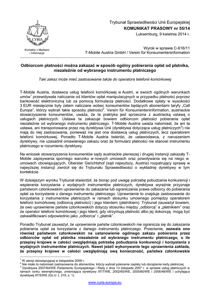 Trybunał Sprawiedliwości Unii Europejskiej KOMUNIKAT PRASOWY nr 55/14 Luksemburg, 9 kwietnia 2014 r. Kontakty z Mediami i Informacja Wyrok w sprawie C-616/11 T-Mobile Austria GmbH / Verein für Konsumenteninformation Odbiorcom płatności można zakazać w sposób ogólny pobierania opłat od płatnika, niezależnie od wybranego instrumentu płatniczego Taki zakaz może mieć zastosowanie także do operatora telefonii komórkowej T-Mobile Austria, dostawca usług telefonii komórkowej w Austrii, w swoich ogólnych warunkach umów1 przewidywała naliczanie od klientów opłat manipulacyjnych w przypadku płatności poprzez bankowość elektroniczną lub za pomocą formularza płatności. Dodatkowe opłaty w wysokości 3 EUR miesięcznie były zatem naliczane wobec konsumentów będących abonentami taryfy „Call Europe”, którzy wybrali takie sposoby płatności2. Verein für Konsumenteninformation, austriackie stowarzyszenie konsumentów, uważa, że ta praktyka jest sprzeczna z austriacką ustawą o usługach płatniczych. Ustawa ta zakazuje bowiem odbiorcom płatności pobierania opłat niezależnie od wybranego instrumentu płatniczego. T-Mobile Austria uważa natomiast, że ani ta ustawa, ani transponowana przez nią dyrektywa Unii (dyrektywa dotycząca usług płatniczych3) nie mają do niej zastosowania, ponieważ nie jest ona dostawcą usług płatniczych, lecz operatorem telefonii komórkowej. Ponadto T-Mobile Austria twierdzi, że ustawodawca, z naruszeniem dyrektywy, nie uzasadnił omawianego zakazu oraz że formularz płatności nie stanowi instrumentu płatniczego w rozumieniu dyrektywy. Na wniosek stowarzyszenia konsumentów sądy austriackie pierwszej i drugiej instancji zakazały TMobile zapisywania spornego warunku w nowych umowach oraz powoływania się na niego w umowach obowiązujących. Oberster Gerichtshof (sąd najwyższy, Austria) rozpatrujący sprawę w najwyższej instancji zwrócił się do Trybunału Sprawiedliwości o wykładnię dyrektywy w tym kontekście. W dzisiejszym wyroku Trybunał stwierdził, że biorąc pod uwagę potrzebę pobudzania konkurencji i wspierania korzystania z wydajnych instrumentów płatniczych, dyrektywa wyraźnie przyznaje państwom członkowskim uprawnienie do zakazania lub ograniczenia prawa odbiorcy do pobierania opłat za korzystanie z danego instrumentu płatniczego. Uprawnienie to znajduje zastosowanie do korzystania z instrumentów płatniczych w ramach stosunku umownego pomiędzy operatorem telefonii komórkowej (odbiorcą płatności) i jego klientem (płatnikiem). Trybunał zauważył bowiem, że owo uprawnienie państw członkowskich dotyczy stosunku między „odbiorcą” a „płatnikiem” oraz że operator telefonii komórkowej i jego klient, gdy otrzymują płatność albo jej dokonują, mogą być zakwalifikowani odpowiednio jako „odbiorca” i „płatnik”. Ponadto Trybunał zauważył, że uprawnienie państw członkowskich nie ogranicza się do zakazania pobierania opłat za korzystanie z danego instrumentu płatniczego. Przeciwnie, zezwala ono również państwom członkowskim na ustanowienie ogólnego zakazu pobierania przez odbiorców opłat od płatnika niezależnie od wybranego instrumentu płatniczego, o ile przepisy krajowe w całości uwzględniają potrzebę pobudzania konkurencji i korzystania z wydajnych instrumentów płatniczych. Nawet jeżeli wykonywanie tego uprawnienia zakłada, że przepisy krajowe w całości uwzględniają ową konieczność, państwa członkowskie 1 W wersji obowiązującej w listopadzie 2009 r. Nie miało to natomiast zastosowania do abonentów, którzy wybrali polecenie zapłaty lub obciążenie karty płatniczej. 3 Dyrektywa 2007/64/WE Parlamentu Europejskiego i Rady z dnia 13 listopada 2007 r. w sprawie usług płatniczych w ramach rynku wewnętrznego, zmieniająca dyrektywy 97/7/WE, 2002/65/WE, 2005/60/WE i 2006/48/WE i uchylająca dyrektywę 97/5/WE (Dz.U. L 319, s. 1). 2 www.curia.europa.eu dysponują jednak zakresem swobodnego uznania przy jego realizacji. Do Oberster Gerichtshof należy zbadanie, czy przepisy austriackie przestrzegają tego warunku. Trybunał wyjaśnił ponadto, że zarówno polecenia przelewu w formie papierowej, jak i polecenia przelewu w formie elektronicznej stanowią instrumenty płatnicze w rozumieniu dyrektywy. Jeśli chodzi o interpretację pojęcia instrumentów płatniczych, wykazuje ona rozbieżności istniejące między różnymi wersjami językowymi tej dyrektywy. Biorąc pod uwagę istnienie takich niezindywidualizowanych instrumentów płatniczych, Trybunał stwierdził, że pojęcie instrumentu płatniczego w rozumieniu wspomnianej dyrektywy może obejmować zbiór niezindywidualizowanych procedur, uzgodniony przez użytkownika i dostawcę usług płatniczych, z których korzysta użytkownik w celu zainicjowania zlecenia płatniczego. T-Mobile wniosła o ograniczenie skutków wyroku w czasie4. Trybunał jedynie wyjątkowo może zastosować takie ograniczenie. W tym celu konieczne jest w szczególności, aby jednostki oraz organy krajowe zostały skłonione do zachowań niezgodnych z prawem Unii ze względu na istnienie obiektywnej i istotnej niepewności co do zakresu przepisów prawa Unii. Trybunał orzekł, że warunek ten nie jest spełniony w niniejszej sprawie, ponieważ austriacka ustawa o usługach płatniczych prawidłowo transponowała właściwe przepisy dyrektywy. Ponadto stwierdził on, że TMobile nie wykazała przed Trybunałem istnienia ryzyka poważnych konsekwencji gospodarczych. W rezultacie Trybunał odmówił ograniczenia skutków wyroku w czasie. UWAGA: Odesłanie prejudycjalne pozwala sądom państw członkowskich, w ramach rozpatrywanego przez nie sporu, zwrócić się do Trybunału z pytaniem o wykładnię prawa Unii lub o ocenę ważności aktu Unii. Trybunał nie rozpoznaje sporu krajowego. Do sądu krajowego należy rozstrzygnięcie sprawy zgodnie z orzeczeniem Trybunału. Orzeczenie to wiąże w ten