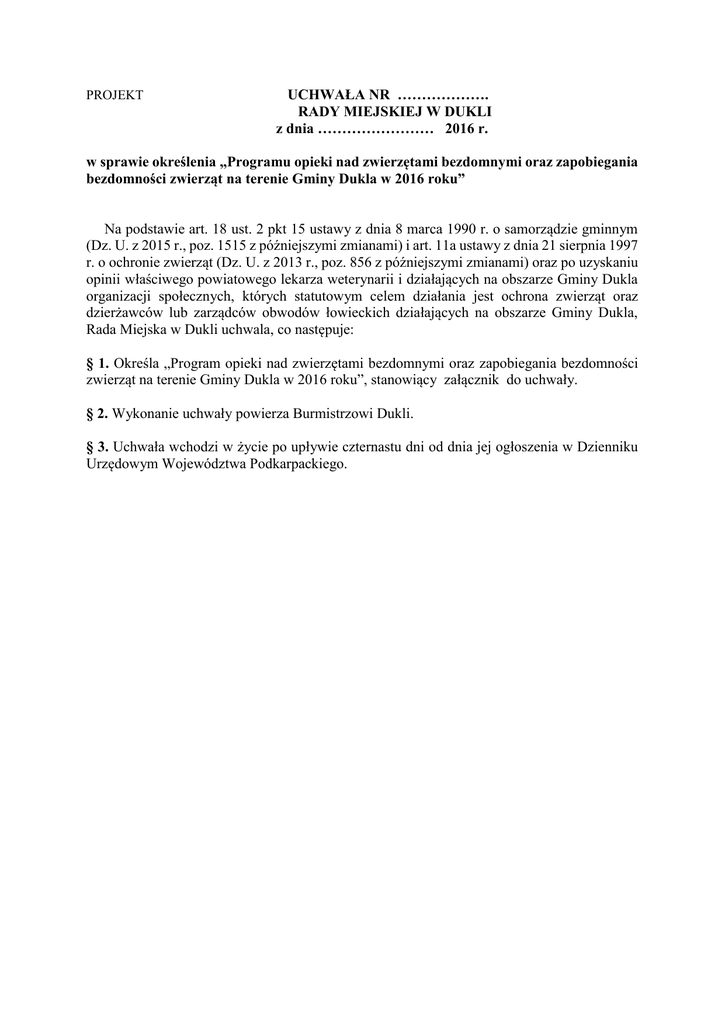 PROJEKT UCHWAŁA NR ………………. RADY MIEJSKIEJ W DUKLI z dnia …………………… 2016 r. w sprawie określenia „Programu opieki nad zwierzętami bezdomnymi oraz zapobiegania bezdomności zwierząt na terenie Gminy Dukla w 2016 roku” Na podstawie art. 18 ust. 2 pkt 15 ustawy z dnia 8 marca 1990 r. o samorządzie gminnym (Dz. U. z 2015 r., poz. 1515 z późniejszymi zmianami) i art. 11a ustawy z dnia 21 sierpnia 1997 r. o ochronie zwierząt (Dz. U. z 2013 r., poz. 856 z późniejszymi zmianami) oraz po uzyskaniu opinii właściwego powiatowego lekarza weterynarii i działających na obszarze Gminy Dukla organizacji społecznych, których statutowym celem działania jest ochrona zwierząt oraz dzierżawców lub zarządców obwodów łowieckich działających na obszarze Gminy Dukla, Rada Miejska w Dukli uchwala, co następuje: § 1. Określa „Program opieki nad zwierzętami bezdomnymi oraz zapobiegania bezdomności zwierząt na terenie Gminy Dukla w 2016 roku”, stanowiący załącznik do uchwały. § 2. Wykonanie uchwały powierza Burmistrzowi Dukli. § 3. Uchwała wchodzi w życie po upływie czternastu dni od dnia jej ogłoszenia w Dzienniku Urzędowym Województwa Podkarpackiego. Załącznik do uchwały nr …… Rady Miejskiej w Dukli z dnia …………….. 2016 r. Program opieki nad zwierzętami bezdomnymi oraz zapobiegania bezdomności zwierząt na terenie Gminy Dukla w 2016 roku. WPROWADZENIE „ Zwierzę, jako istota żyjąca, zdolna do odczuwania cierpienia nie jest rzeczą. Człowiek jest mu winien poszanowanie, ochronę i opiekę” (art. 1 ustawy z dnia 21 sierpnia 1997 roku o ochronie zwierząt). Podstawą prawną podjęcia przez Radę Miejską w Dukli uchwały w sprawie „Programu opieki nad zwierzętami bezdomnymi oraz zapobiegania bezdomności zwierząt na terenie Gminy Dukla”, zwanego dalej Programem jest art. 11a ustawy z dnia 21 sierpnia 1997 r. o ochronie zwierząt. Program ma zastosowanie do wszystkich zwierząt domowych, w szczególności psów i kotów, w tym kotów wolno żyjących oraz zwierząt gospodarskich. Większość działań określonych w Programie dotyczy psów i kotów, ponieważ skala bezdomności tych zwierząt jest największa w całym kraju, jak również w Gminie Dukla. Bezdomność zwierząt jest zjawiskiem społecznym, którego głównymi przyczynami są: 1) niekontrolowane rozmnażanie, 2) porzucanie zwierząt przez właścicieli, 3) ucieczki zwierząt, 4) łatwość pozyskiwania zwierząt, 5) panujące mody na dane rasy zwierząt, 6) brak edukacji i wiedzy społeczeństwa w zakresie metod zapobiegania bezdomności, ze szczególnym uwzględnieniem sterylizacji i kastracji. Znakowanie zwierząt to jedna z głównych metod zapobiegania bezdomności zwierząt, dlatego też Gmina Dukla wprowadziła obowiązek znakowania psów, których właściciele zamieszkują na terenie Gminy, co pozwoli na szybkie odnalezienie właściciela zagubionych zwierząt. To najlepszy sposób zapobiegania bezdomności zwierząt. Sterylizacja i kastracja (pozbawienie możliwości rozmnażania) zwierząt bezdomnych oraz domowych to norma we wszystkich cywilizowanych krajach oraz najskuteczniejsza metoda unikania niekontrolowanej rozrodczości zwierząt. Program zakłada zachęcanie właścicieli zwierząt do ich sterylizacji i kastracji, poprzez prowadzenie działań edukacyjnoinformacyjnych. Koty wolno żyjące, bytujące głównie w piwnicach budynków mieszkalnych, są elementem ekosystemu miejskiego, a ich obecność zapobiega rozprzestrzenianiu się gryzoni (myszy i szczurów). Koty te nie są zwierzętami bezdomnymi, dlatego nie należy ich wyłapywać ani wywozić, lecz stwarzać warunki bytowania w miejscach ich dotychczasowego schronienia. W celu kontroli populacji kotów wolno żyjących, w tym jej zdrowotności, Gmina Dukla finansuje zabiegi sterylizacji i kastracji oraz leczenie tych zwierząt. Ponadto, wspiera osoby społecznie opiekujące się tymi zwierzętami (karmicieli) poprzez zapewnienie karmy, w celu dokarmiania kotów. Realizacja wszystkich zadań, określonych w rozdziale 2 Programu, zmierza do ograniczenia liczby bezdomnych zwierząt trafiających pod opiekę schroniska. Rozdział 1 POSTANOWIENIA OGÓLNE § 1. Ilekroć w uchwale jest mowa o: 1) Urzędzie - należy przez to rozumieć Urząd Miejski w Dukli, jednostkę organizacyjną, przy pomocy której Burmistrz Dukli wykonuje zadania; 2) Wydziale Gospodarczym - należy przez to rozumieć komórkę organizacyjną Urzędu Miejskiego w Dukli; 3) przytulisku - należy przez to rozumieć miejsce czasowego pobytu zwierząt nie będące schroniskiem, w którym zapewnione są właściwe warunki bytowania zwierząt w rozumieniu ustawy o ochronie zwierząt; 4) schronisku dla zwierząt - należy przez to rozumieć miejsce przeznaczone do opieki nad zwierzętami domowymi spełniające warunki określone w ustawie z dnia 11 marca 2004 r. o ochronie zdrowia zwierząt oraz zwalczaniu chorób zakaźnych zwierząt (Dz.U. z 2008 r., Nr 213, poz. 1342, z późniejszymi zmianami); Gmina zawarła umowę ze schroniskiem dla bezdomnych zwierząt „Wesoły Kundelek” znajdującym się w Lesku przy ul. Sanowej (b.n.). 5) zwierzętach bezdomnych - należy przez to rozumieć zwierzęta domowe lub gospodarskie, które uciekły, zabłąkały się lub zostały porzucone przez człowieka, a nie ma możliwości ustalenia ich właściciela lub innej osoby, pod której opieką trwale dotąd pozostawały; 6) zwierzętach domowych - należy przez to rozumieć zwierzęta tradycyjnie przebywające wraz z człowiekiem w jego domu lub odpowiednim pomieszczeniu, utrzymywane przez człowieka w charakterze jego towarzysza; 7) kotach wolno żyjących - należy przez to rozumieć koty urodzone lub żyjące na wolności (żyjące w otoczeniu człowieka w stanie dzikim); 8) programie - należy przez to rozumieć Program opieki nad zwierzętami bezdomnymi oraz zapobiegania bezdomności zwierząt na terenie Gminy Dukla 