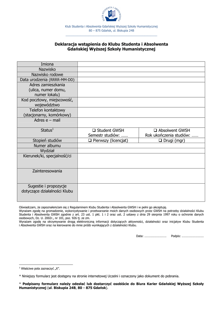 Klub Studenta i Absolwenta Gdańskiej Wyższej Szkoły Humanistycznej 80 – 875 Gdańsk, ul. Biskupia 24B ________________________________________________________ Deklaracja wstąpienia do Klubu Studenta i Absolwenta Gdańskiej Wyższej Szkoły Humanistycznej Imiona Nazwisko Nazwisko rodowe Data urodzenia (RRRR-MM-DD) Adres zamieszkania (ulica, numer domu, numer lokalu) Kod pocztowy, miejscowość, województwo Telefon kontaktowy (stacjonarny, komórkowy) Adres e – mail Status1 Stopień studiów Numer albumu Wydział Kierunek/ki, specjalność/ci Student GWSH Semestr studiów: …… Pierwszy (licencjat) Absolwent GWSH Rok ukończenia studiów: …… Drugi (mgr) Zainteresowania Sugestie i propozycje dotyczące działalności Klubu Oświadczam, że zapoznałem/am się z Regulaminem Klubu Studenta i Absolwenta GWSH i w pełni go akceptuję. Wyrażam zgodę na gromadzenie, wykorzystywanie i przetwarzanie moich danych osobowych przez GWSH na potrzeby działalności Klubu Studenta i Absolwenta GWSH zgodnie z art. 23 ust. 1 pkt. 1 i 2 oraz ust. 2 ustawy z dnia 29 sierpnia 1997 roku o ochronie danych osobowych, Dz. U. 2002r., nr 101, poz. 926 tj. ze zm. Wyrażam zgodę na otrzymywanie drogą elektroniczną informacji dotyczących aktywności, działalności oraz inicjatyw Klubu Studenta i Absolwenta GWSH oraz na kierowanie do mnie próśb wynikających z działalności Klubu. Data: ……………………… Podpis: ……………………… 1 Właściwe pola zaznaczyć „X”. * Niniejszy formularz jest dostępny na stronie internetowej Uczelni i oznaczony jako dokument do pobrania. * Podpisany formularz należy odesłać lub dostarczyć osobiście do Biura Karier Gdańskiej Wyższej Szkoły Humanistycznej (ul. Biskupia 24B, 80 – 875 Gdańsk).