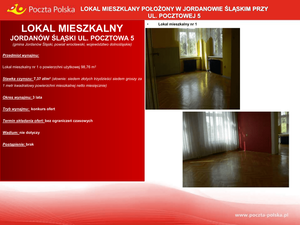 LOKAL MIESZKLANY POŁOŻONY W JORDANOWIE ŚLĄSKIM PRZY UL. POCZTOWEJ 5 LOKAL MIESZKALNY JORDANÓW ŚLĄSKI UL. POCZTOWA 5 (gmina Jordanów Śląski, powiat wrocławski, województwo dolnośląskie) Przedmiot wynajmu: Lokal mieszkalny nr 1 o powierzchni użytkowej 98,76 m 2 Stawka czynszu: 7,37 zł/m² (słownie: siedem złotych trzydzieści siedem groszy za 1 metr kwadratowy powierzchni mieszkalnej netto miesięcznie) Okres wynajmu: 3 lata Tryb wynajmu: konkurs ofert Termin składania ofert: bez ograniczeń czasowych Wadium: nie dotyczy Postąpienie: brak • Lokal mieszkalny nr 1 Kliknij i zlokalizuj na mapie Opis przedmiotu wynajmu: Lokal mieszkalny nr 1 o powierzchni użytkowej 98,76 m²usytuowany na I piętrze budynku Poczty Polskiej S.A położonego w miejscowości Jordanów Śląski przy ul. Pocztowej 5. Składa się z kuchni, 4 pokoi, przedpokoju, łazienki z wc oraz spiżarni. Wyposażony jest w instalację wodno – kanalizacyjną, elektryczną oraz centralnego ogrzewania. Niezależnie od czynszu Najemca będzie ponosił opłaty za wodę, nieczystości płynne, gospodarowanie odpadami komunalnymi oraz centralnego ogrzewania. Opis nieruchomości: Miejscowość Jordanów Śląski Ulica, nr budynku Pocztowa 5 Powierzchnia budynku, w którym zlokalizowany jest przedmiot wynajmu 341,37 m² Nr działki ewidencyjnej, obręb 93, obręb 0006 Jordanów Śląski Księga wieczysta, Sąd Rejonowy, Nr Wydziału WR1T/00010585/5 Stan prawny gruntu Własność Skarbu Państwa w użytkowaniu wieczystym Poczty Polskiej S.A. do dnia 5 grudnia 2089 r. Lokalizacja i dostępność komunikacyjna: Nieruchomość położona jest w miejscowości Jordanów Śląski przy ul. Pocztowej 5. Wieś położone w województwie dolnośląskim, powiecie wrocławskim, gminie Jordanów Śląski. Jordanów Śląski położony jest w południowej części Równiny Wrocławskiej. Obok wsi jest duży kamieniołom, w którym wydobywa się serpentynit. Znany jest także, jako miejsce występowania kolekcjonerskich okazów nefrytu. Jordanów Śląski leży tuż przy drodze krajowej Nr S8. Miejscowość jest siedzibą gminy. Opis nieruchomości: Nieruchomość ewidencyjnie oznaczona nr 93 o powierzchni 1303 m2 obręb 0006 Jordanów Śląski, dla której Sąd Rejonowy w Strzelinie, IX Zamiejscowy Wydział Ksiąg Wieczystych prowadzi księgę wieczystą nr WR1T/00010585/5. Przedmiotowa nieruchomość gruntowa jest własnością Skarbu Państwa w użytkowaniu wieczystym Poczty Polskiej S.A. do 5 grudnia 2089 r. OBWIESZCZENIE O PRZETARGU PISEMNYM NA NAJEM LOKALU MIESZKALNEGO Wynajmujący: Poczta Polska S.A. z siedzibą w Warszawie, 00-940 Warszawa, ul. Rodziny Hiszpańskich 8. Prowadzący przetarg: Poczta Polska S.A., Pion Infrastruktury Obszar Operacyjny ds. Nieruchomości we Wrocławiu, ul. Awicenny 21, 50 -900 Wrocław. Miejsce przetargu: Poczta Polska S.A., Pion Infrastruktury Obszar Operacyjny ds. Nieruchomości we Wrocławiu ul. Awicenny 21, 50 -900 Wrocław– pokój Nr 102, Okres trwania umowy – 3 lata. Przedmiot najmu: Lokal mieszkalny nr 1 o powierzchni użytkowej 98,76 m² usytuowany na I piętrze budynku Poczty Polskiej S.A położonego w miejscowości Jordanów Śląski przy ul. Pocztowej 5. Składa się z kuchni, 4 pokoi, przedpokoju, łazienki z wc oraz spiżarni. Wyposażony jest w instalację wodno– kanalizacyjną, elektryczną oraz centralnego ogrzewania. Wywoławcza stawka czynszu – 7,37 zł/m² (słownie: siedem złotych trzydzieści siedem groszy za 1 metr kwadratowy powierzchni mieszkalnej netto miesięcznie) Stawka wywoławcza czynszu najmu nie obejmuje opłat eksploatacyjnych za energię elektryczną, kosztów ogrzewania, zużycia wody oraz opłat za wywóz nieczystości stałych i odprowadzenia nieczystości płynnych. Wadium – nie dotyczy Miejsce, termin i tryb składania ofert: bez ograniczeń czasowych Warunkiem przystąpienia do konkursu ofert: 1. złożenie pisemnej oferty zawierającej dane Oferenta oraz proponowaną stawkę czynszu za najem 1 m2 powierzchni lokalu mieszkalnego. Oferty należy składać w zamkniętych kopertach w siedzibie prowadzącego przetarg (pokój 102) z dopiskiem: „Oferta na najem lokalu mieszkalnego Nr 1 w Jordanowie Śląskim, ul. Pocztowa 5”, 2. złożenie przez Oferenta oświadczenia o zapoznaniu się z treścią obwieszczenia o wynajmie lokalu mieszkalnego, ze stanem technicznym lokalu przeznaczonego do wynajmu, a także z treścią projektu umowy najmu oraz przyjęciu ich bez zastrzeżeń. Do oświadczenia należy dołączyć kserokopię dowodu osobistego, 3. w przypadku złożenia oferty przez jednego z małżonków, konieczne jest przedłożenie pisemnego wyrażenia zgody współmałżonka na złożenie oferty z zamiarem najmu lokalu mieszkalnego będącego przedmiotem ogłoszenia, ze środków pochodzących z majątku wspólnego, 4. w przypadku osób prawnych i jednostek organizacyjnych nieposiadających osobowości prawnej, osoba reprezentująca biorąca udział w przetargu zobowiązana jest do okazania dowodu osobistego oraz odpowiednich jednostek w postępowaniu przetargowym. Warunkiem koniecznym do zawarcia umowy najmu lokalu mieszkalnego będzie wpłata kaucji w wysokości trzykrotności miesięcznego czynszu oraz złożenie oświadczenia o poddaniu się egzekucji, zgodnie z treścią art. 777 § 1 pkt 4 - 6 ustawy z dnia 17 listopada 1964 r. - Kodeks postępowania cywilnego. Okres wiązania oferty wynosi 60 dni od dnia złożenia oferty . Szczegółowych informacji w sprawie najmu (udostępnianie projektu umowy najmu) udziela w dni powszednie w godz. 8.00-14.00 – Edward Regmunt, tel. 76 850 04 45; ze wskazaną osobą można uzgodnić również termin oglądu lokalu mieszkalnego. POCZTA POLSKA S.A. ZASTRZEGA SOBIE PRAWO UNIEWAŻNIENIA PRZETARGU W KAŻDYM CZASIE BEZ PODANIA PRZYCZYN I PONOSZENIA SKUTKÓW PRAWNYCH I FINANSOWYCH Z TEGO TYTUŁU. Formularz zgłoszenia złożenia oferty Dotyczy wynajmu części nieruchomości: Lokal mieszkalny o powierz