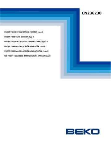 CN236230 FROST FREE REFRIGERATOR-FREEZER type II FROST-FREE KÜHL-GEFRIER-Typ II FROST FREE CHŁODZIARKO-ZAMRAŻARKA typu II FROST ZDARMA CHLADNIČKA-MRAZÁK typu II FROST ZDARMA CHLADNIČKA-MRAZNIČKA typu II NO FROST HLADILNO-ZAMRZOVALNI APARAT tipa II CN228220 CN236230 WARNING! In order to ensure a normal operation of your refrigerating appliance, which uses a completely environmentally friendly refrigerant the R600a (flammable only under certain conditions) you must observe the following rules: Do not hinder the free circulation of the air around the appliance. Do not use mechanical devices in order to accelerate the defrosting, others than the ones recommended by the manufacturer. Do not destroy the refrigerating circuit. Do not use electric appliances inside the food keeping compartment, other than those that might have been recommended by the manufacturer. WARNUNG! Ihr Gerät verwendet ein umweltverträgliches Kältemittel, R600a (nur unter bestimmten Umständen brennbar). Um einen einwandfreien Betrieb Ihres Gerätes sicherzustellen, beachten Sie bitte folgende Vorschriften: Die Luftzirkulation um das Gerät darf nicht behindert sein. Verwenden Sie außer der vom Hersteller empfohlenen, keine mechanischen Hilfsmittel, um den Abtauprozess zu beschleunigen. Der Kältemittelkreislauf darf nicht beschädigt werden. Verwenden Sie im Lebensmittelaufbewahrungsbereich Ihres Gerätes keine elektrischen Geräte, es sei denn, sie sind vom Hersteller empfohlen. UWAGA! Producent nie będzie ponosić odpowiedzialności za szkody wynikłe z niestosowania się do zaleceń zawartych w instrukcji obsługi. Instrukcję obsługi należy przechowywać w bezpiecznym miejscu tak, aby można było z niej korzystać w razie konieczności. Może być ona przydatna również dla innego użytkownika. UPOZORNĚNÍ! Aby byl zajištěn normální provoz vaší chladničky, která používá pro životní prostředí zcela neškodné chladicí médium R600a (vznětlivé pouze za určitých podmínek), musíte dodržet následující pravidla: Nebraňte ve volné cirkulaci vzduchu kolem přístroje. Nepoužívejte mechanická zařízení pro zrychlení odmražení kromě těch, která jsou doporučená výrobcem. Nelikvidujte chladicí okruh. Nepoužívejte elektrické spotřebiče uvnitř prostoru pro potraviny kromě těch, která by mohl doporučit výrobce. VAROVANIE! Aby sa zabezpečila normálna prevádzka vašej chladničky, ktorá používa úplne ekologicky nezávadné chladivo R600a (horľavé len pri určitých podmienkach), musíte dodržiavať nasledujúce pravidlá: Nebráňte voľnej cirkulácii vzduchu okolo spotrebiča. Nepoužívajte mechanické prístroje na urýchľovanie rozmrazovacieho procesu, iné ako odporúča výrobca. Neporušujte chladiaci okruh. Nepoužívajte elektrické spotrebiče vo vnútri pípacieho priestoru potravín, iné ako tie, ktoré odporúčal výrobca. OPOZORILO! Za normalno delovanje vaše zamrzovalne naprave, ki uporablja naravi prijazno hladilno sredstvo R600a (vnetljivo samo pod določenimi pogoji), je treba upoštevati naslednja pravila: Ne zadržujte prostega pretoka zraka okoli naprave. Za hitrejše odtajanje, ne uporabljajte mehanskih naprav, ki jih ni priporočil proizvajalec. Ne uničujte hladilnega krogotoka. V prostoru za hrano ne uporabljajte električnih naprav, ki jih ni priporočil proizvajalec. This appliance is not intended for use by person with reduced physical, sensory or mental capabilities or lack of experience and knowledge unless they have been given supervision or instruction concerning use of the appliance by a person responsible for their safety. Children should be supervised to ensure that they do not play with the appliance. Dieses Gerät ist nicht dafür bestimmt durch Personen (einschließlich Kinder) mit eingeschränkten physischen, sensorischen oder geistigen Fähigkeiten oder mangels Erfahrung und/oder mangels Wissen benutzt zu werden, es sei denn, sie werden durch eine für ihre Sicherheit zuständige Person beaufsichtigt oder erhielten von ihr Anweisungen, wie das Gerät zu benutzen ist. Używanie urządzenia przez osoby z fizycznymi sensorycznymi lub mentalnymi ograniczeniami powinno odbywać się tylko pod kontrolą osób odpowiedzialnych za ich bezpieczeństwo. Należy dopilnować, aby dzieci nie używały urządzenia do zabawy. Tento spotřebič by neměly používat osoby se sníženou fyzickou, senzorickou nebo mentální způsobilostí a nebo s nedostatečnými zkušenostmi a poznatky. Tyto osoby můžou spotřebič používat jen pod dohledem osoby zodpovědné za jejich bezpečnost, a nebo pokud je zodpovědná osoba poučila o správném používaní spotřebiče. Děti by měly být pod dozorem, aby si nehrály se spotřebičem. Tento spotrebič by nemali používať osoby so zníženou fyzickou, senzorickou alebo mentálnou spôsobilosťou alebo s nedostatočnými skúsenosťami a poznatkami. Tieto osoby môžu spotrebič používať len pod dohľadom osoby zodpovednej za ich bezpečnosť, alebo ak ich zodpovedná osoba poučila o správnom používaní spotrebiča. Deti by mali byť pod dozorom, aby sa nehrali so spotrebičom. Uporaba te naprave ni namenjena osebam s slabšimi fizičnimi, senzornimi ali duševnimi zmožnostmi ter osebam, ki nimajo potrebnih izkušenj in znanja, razen če so prejele navodila za uporabo ali so pod nadzorom osebe, ki je odgovorna za njihovo varnost. Otroci se ne smejo igrati z napravo. EN Index Safety comes first ! /1 Transport instructions /2 Disposal;Device Setup /2 Electrical connections /2 Get to know your device /3 Prior to startup /3 Setting the operating temperature /3 Cooling /5 Freezing /5 Defrosting of the device /6 Replacing the interior light bulb /7 Cleaning and care /7 Practical tips and notes /8 Examples of Use /9 Placing the food /9 Setting recomandation /9 Normal operating noises /10 Practical advice concerning the reduction of the electricity consumption /10 What, if...