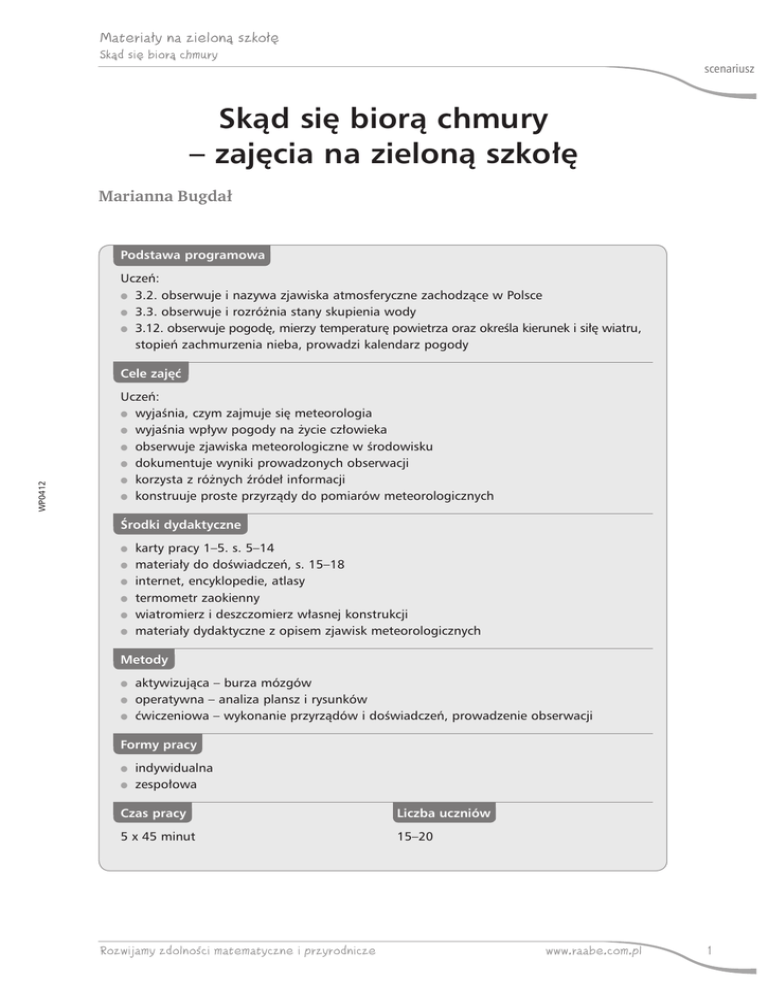 Materiały na zielonà szkoł´ Skàd si´ biorà chmury scenariusz Skąd się biorą chmury – zajęcia na zieloną szkołę Marianna Bugdał Podstawa programowa Uczeń: ●● 3.2. obserwuje i nazywa zjawiska atmosferyczne zachodzące w Polsce ●● 3.3. obserwuje i rozróżnia stany skupienia wody ●● 3.12. obserwuje pogodę, mierzy temperaturę powietrza oraz określa kierunek i siłę wiatru, stopień zachmurzenia nieba, prowadzi kalendarz pogody WP0412 Cele zajęć Uczeń: ●● wyjaśnia, czym zajmuje się meteorologia ●● wyjaśnia wpływ pogody na życie człowieka ●● obserwuje zjawiska meteorologiczne w środowisku ●● dokumentuje wyniki prowadzonych obserwacji ●● korzysta z różnych źródeł informacji ●● konstruuje proste przyrządy do pomiarów meteorologicznych Środki dydaktyczne ●● ●● ●● ●● ●● ●● karty pracy 1–5. s. 5–14 materiały do doświadczeń, s. 15–18 internet, encyklopedie, atlasy termometr zaokienny wiatromierz i deszczomierz własnej konstrukcji materiały dydaktyczne z opisem zjawisk meteorologicznych Metody ●● ●● ●● aktywizująca – burza mózgów operatywna – analiza plansz i rysunków ćwiczeniowa – wykonanie przyrządów i doświadczeń, prowadzenie obserwacji Formy pracy ●● ●● indywidualna zespołowa Czas pracy Liczba uczniów 5 x 45 minut 15–20 Rozwijamy zdolnoÊci matematyczne i przyrodnicze www.raabe.com.pl 1