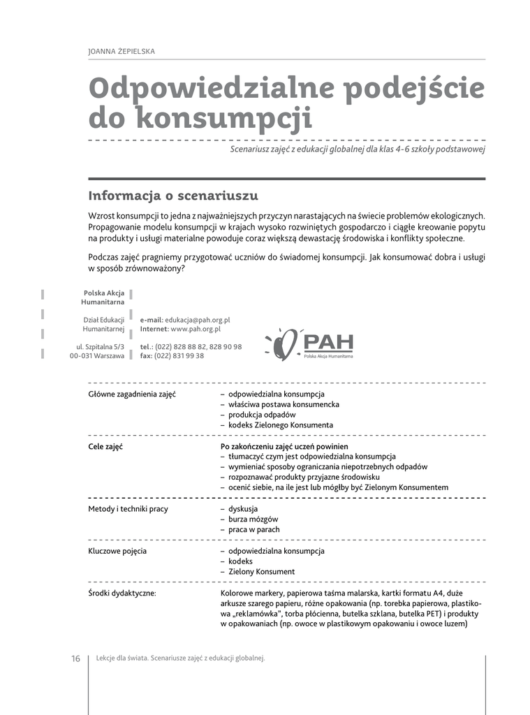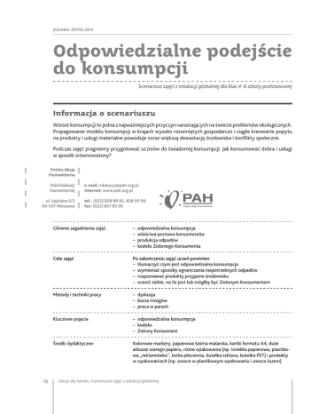 Joanna Żepielska Odpowiedzialne podejście do konsumpcji Scenariusz zajęć z edukacji globalnej dla klas 4-6 szkoły podstawowej Informacja o scenariuszu Wzrost konsumpcji to jedna z najważniejszych przyczyn narastających na świecie problemów ekologicznych. Propagowanie modelu konsumpcji w krajach wysoko rozwiniętych gospodarczo i ciągłe kreowanie popytu na produkty i usługi materialne powoduje coraz większą dewastację środowiska i konflikty społeczne. Podczas zajęć pragniemy przygotować uczniów do świadomej konsumpcji. Jak konsumować dobra i usługi w sposób zrównoważony? Polska Akcja Humanitarna Dział Edukacji Humanitarnej ul. Szpitalna 5/3 00-031 Warszawa e-mail: [email protected] Internet: www.pah.org.pl tel.: (022) 828 88 82, 828 90 98 fax: (022) 831 99 38 Główne zagadnienia zajęć – odpowiedzialna konsumpcja – właściwa postawa konsumencka – produkcja odpadów – kodeks Zielonego Konsumenta Cele zajęć Po zakończeniu zajęć uczeń powinien – tłumaczyć czym jest odpowiedzialna konsumpcja – wymieniać sposoby ograniczania niepotrzebnych odpadów – rozpoznawać produkty przyjazne środowisku – ocenić siebie, na ile jest lub mógłby być Zielonym Konsumentem Metody i techniki pracy – dyskusja – burza mózgów – praca w parach Kluczowe pojęcia – odpowiedzialna konsumpcja – kodeks – Zielony Konsument Środki dydaktyczne:Kolorowe markery, papierowa taśma malarska, kartki formatu A4, duże arkusze szarego papieru, różne opakowania (np. torebka papierowa, plastikowa „reklamówka”, torba płócienna, butelka szklana, butelka PET) i produkty w opakowaniach (np. owoce w plastikowym opakowaniu i owoce luzem) 16 Lekcje dla świata. Scenariusze zajęć z edukacji globalnej. Czas: 90 minut Literatura:E. Osuch, W. Osuch, A. Kassenberg, Geografia z ochroną i kształtowaniem środowiska, podręcznik dla zasadniczych szkół zawodowych, WSiP, Warszawa 2003 M. Huma, M. Krzystkiewicz, Kupuj odpowiedzialnie! Twoje pieniądze kształtują świat. Poradnik dla uczniów szkół ponadpodstawowych, Polska Zielona Sieć, Kraków 2007 M. Huma, Jak kupować by nie dać się upolować. Poradnik odpowiedzialnego konsumenta, Związek Stowarzyszeń Polska Zielona Sieć, Kraków 2006 Małgorzata Rutkowska – Paszta „Prawa człowieka w edukacji obywatelskiej” Warszawa, 1998, WSiP, wydanie pierwsze Ulrich Baer „Gry dyskusyjne – materiały pomocnicze do pracy z grupą”, Lublin 1997, Wydawnictwo „KLANZA”, wyd. I Przebieg zajęć CZAS CO TRZEBA ZROBIĆ ? 10 min 1. Podaj uczniom temat zajęć. 15 min 2. Czym jest odpowiedzialna konsumpcja? a. Stosując metodę burza mózgów poproś uczniów, aby zapisali na małych kartkach skojarzenia związane z pojęciem odpowiedzialna konsumpcja. b. Wyjaśnij uczniom, że codzienne wybory ludzi mają wpływ na stan środowiska przyrodniczego i na stan zdrowia ludzi, którzy w przyszłości będą zamieszkiwać Ziemię. c. Wyjaśnij uczniom, że poczucie odpowiedzialności za nasze codzienne wybory nazywa się odpowiedzialną konsumpcją. d. Wspólnie z uczniami sformułuj prawidłowe znaczenie tego pojęcia i zawieś je w widocznym miejscu klasy. 20 min 3. Produkcja odpadów a. Poproś uczniów, aby w parach postarali się zdefiniować pojęcia śmieć, odpad. Odczytajcie utworzone definicje na forum klasy. b. Połóż na stole kilka różnych opakowań lub produktów w różnych opakowaniach. c. Poproś uczniów, aby zastanowili się, które opakowania są przyjazne dla środowiska, a które nie. d. Zapytaj uczniów z czego wykonane są poszczególne opakowania? Które z produktów można kupić w innym opakowaniu lub bez opakowania? e. U zupełnij wypowiedzi uczniów. Powiedz, że idąc na zakupy warto mieć ze sobą własną torbę wielokrotnego użytku. W ten sposób ograniczamy ilość niepotrzebnych odpadów (plastikowych „reklamówek”). Globalne współzależności MATERIAŁY UWAGI Materiał pomocniczy nr 1 – Definicja zrównoważonego rozwoju Materiały pomocnicze znajdują się na końcu scenariusza. Kartki papieru formatu A4 do robienia notatek, kolorowe markery, arkusz szarego papieru, papierowa taśma malarska do wieszania plakatów (materiał dodatkowy dla nauczyciela) Materiał pomocniczy nr 2 – Opis metody burza mózgów Różne opakowania (np. torebka papierowa, plastikowa „reklamówka”, torba płócienna, butelka szklana, butelka PET) i produkty w opakowaniach (np. owoce luzem i owoce w plastikowym opakowaniu) 17 Uwaga! Nauczycielu! W tym miejscu możesz zrobić przerwę prowadzeniu zajęć. Drugą część zajęć możesz poprowadzić na następnej lekcji. 30 min 4. W jaki sposób mogę być Zielonym Konsumentem? a. Poproś uczniów, aby każdy indywidualnie zapisał na kartce papieru swoją propozycję i zawiesił w widocznym miejscu (wyjaśnij uczniom co kryje się pod nazwą Zielony Konsument). b. Poproś uczniów o odczytanie swoich propozycji. c. Na podstawie propozycji uczniów stwórzcie wspólny klasowy kodeks Zielonego Konsumenta 15 min Kolorowe markery, arkusze szarego papieru, kartki formatu A4 do notatek, papierowa taśma malarska do zawieszenia plakatu 5. Podsumowanie Zapytaj uczniów, co oni sami mogą zrobić, aby ograniczyć produkcję odpadów. Materiały pomocnicze Materiał pomocniczy nr 1 – Definicje zrównoważonego rozwoju Definicja pojęcia zrównoważony rozwój, opracowana przez Światową Komisję ds. Środowiska i Rozwoju w 1986 r. Zrównoważony rozwój to taki, który zaspokaja potrzeby obecnego pokolenia bez pozbawiania przyszłych pokoleń możliwości zaspokajania ich potrzeb. Definicja pojęcia zrównoważony rozwój, opracowana na Konferencji ONZ Środowisko i Rozwój w Rio de Janeiro w 1992 r.: Rozwój zrównoważony jest to strategia przekształceń ekologicznych, społecznych, techniczno-technologicznych i organizacyjnych, których celem jest osiągnięcie racjonalnego i trwałego poziomu dobrobytu społecznego, umożliwiającego p