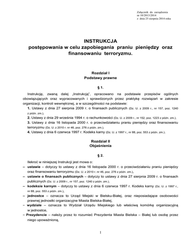 Załącznik do zarządzenia nr 10/2013/2014 z dnia 25 sierpnia 2014 roku INSTRUKCJA postępowania w celu zapobiegania praniu pieniędzy oraz finansowaniu terroryzmu. Rozdział I Podstawy prawne § 1. Instrukcję, zwaną dalej „Instrukcją”, opracowano na podstawie przepisów ogólnych obowiązujących oraz wypracowanych i sprawdzonych przez praktykę rozwiązań w zakresie organizacji, kontroli wewnętrznej, a w szczególności na podstawie: 1. Ustawy z dnia 27 sierpnia 2009 r. o finansach publicznych (Dz. U. z 2009 r., nr 157, poz. 1240 z późn. zm.), 2. Ustawy z dnia 29 września 1994 r. o rachunkowości (Dz. U. z 2009 r., nr 152, poz. 1223 z późn. zm.), 3. Ustawy z dnia 16 listopada 2000 r. o przeciwdziałaniu praniu pieniędzy oraz finansowaniu terroryzmu (Dz. U. z 2010 r. nr 46, poz. 276 z późn. zm.), 4. Ustawy z dnia 6 czerwca 1997 r. Kodeks karny (Dz. U. z 1997 r., nr 88, poz. 553 z późn. zm.). Rozdział II Objaśnienia § 2. – – – – − Ilekroć w niniejszej Instrukcji jest mowa o: ustawie – dotyczy to ustawy z dnia 16 listopada 2000 r. o przeciwdziałaniu praniu pieniędzy oraz finansowaniu terroryzmu (Dz. U. z 2010 r. nr 46, poz. 276 z późn. zm.), ustawie o finansach publicznych – dotyczy to ustawy z dnia 27 sierpnia 2009 r. o finansach publicznych (Dz. U. z 2009 r., nr 157, poz. 1240 z późn. zm.), kodeksie karnym – dotyczy to ustawy z dnia 6 czerwca 1997 r. Kodeks karny (Dz. U. z 1997 r., nr 88, poz. 553 z późn. zm.), jednostce – oznacza to Urząd Miejski w Bielsku-Białej, oraz nieposiadające osobowości prawnej jednostki organizacyjne Miasta Bielska-Białej, wydziale – oznacza to Wydział Urzędu Miejskiego lub właściwą komórkę organizacyjną w jednostce, − Prezydencie – należy przez to rozumieć Prezydenta Miasta Bielska – Białej lub osobę przez niego upoważnioną, 1 – kierowniku jednostki – należy przez to rozumieć kierujących miejskimi jednostkami organizacyjnymi i osoby przez nich upoważnione, – naczelniku – oznacza to naczelnika wydziału, lub kierownika komórki organizacyjnej w jednostce, – głównym księgowym – oznacza to skarbnika miasta, głównego księgowego Urzędu Miejskiego w Bielsku-Białej, głównego księgowego w miejskiej jednostce organizacyjnej, - pracownikach kontroli wewnętrznej – oznacza to pracowników Wydziału Audytu Wewnętrznego i Kontroli Urzędu Miejskiego w Bielsku – Białej oraz pracowników komórek kontroli wewnętrznej zatrudnionych w miejskich jednostkach organizacyjnych, – GIIF – oznacza to Generalnego Inspektora Informacji Finansowej. § 3. Pracownicy jednostki właściwi merytorycznie z tytułu powierzonych im obowiązków, winni zapoznać się z treścią Instrukcji i bezwzględnie przestrzegać zawartych w niej postanowień. Fakt zapoznania się z przepisami zawartymi w Instrukcji winien być potwierdzony specjalnym oświadczeniem, którego wzór stanowi Załącznik Nr 1 do niniejszej Instrukcji. § 4. Pracownicy jednostki w trakcie wykonywania obowiązków służbowych obowiązani są do zwracania uwagi na: 1) nietypowe transakcje związane z nabyciem majątku komunalnego, 2) umowy i transakcje związane z wykonywaniem przez inne podmioty zadań publicznych w jednostkach samorządu terytorialnego, realizowane na warunkach odbiegających od istniejących standardów, 3) nietypowe zachowania i czynności podejmowane przez uczestników postępowania o udzielenie zamówienia publicznego, polegające między innymi na oferowaniu przez nich warunków wykonania zamówienia, rażąco odbiegających od oferowanych przez innych oferentów, 4) przypadki dokonywania przez podatników nadpłat podatków i ewentualnego ich wycofywania, 5) udział kontrolowanych jednostek w nietypowych przedsięwzięciach, szczególnie finansowanych z udziałem kapitału zagranicznego, 6) dokonywanie wpłaty znacznych kwot gotówką, np. tytułem zapłaty za nabyte mienie komunalne, 7) dokonywanie wpłaty należności gotówką w ratach (kilkakrotnie), w tym samym dniu. § 5. 1) 2) 3) 4) 1. Pracownicy jednostki obowiązani są: dokonywać analizy i oceny realizowanych transakcji w rozumieniu art. 2 pkt 2 ustawy, w którym występują symptomy wskazujące na możliwość prania pieniędzy oraz finansowania terroryzmu, sporządzać potwierdzone kopie dokumentów dotyczących transakcji, co do których zachodzi podejrzenie, że mają one związek z popełnieniem przestępstwa, o którym mowa w art. 165a i 299 kodeksu karnego, zebrać dostępne informacje o osobach przeprowadzających te transakcje, dokonać opisu transakcji, o których mowa wyżej wraz z uzasadnieniem, że zachodzą okoliczności wskazane w art. 15a ust 1 ustawy i istnieje uzasadniona potrzeba powiadomienia o tym GIIF, przedkładając projekt jego powiadomienia Naczelnikowi. 2 2. Pracownik kontroli wewnętrznej, w zakresie swojej właściwości, analizujący dokumenty poszczególnych Wydziałów lub Jednostek w przypadku stwierdzenia, że zachodzą podstawy do zawiadomienia GIIF o zagrożeniu popełnienia przestępstwa, o którym mowa w art. 165a lub 299 kodeksu karnego obowiązany jest do sporządzenia odpowiedniej notatki służbowej i przekazania jej Prezydentowi lub Kierownikowi Jednostki, który podejmuje decyzję co do jej wykorzystania. 3. Wzór powiadomienia GIIF stanowi Załącznik Nr 2 do niniejszej Instrukcji. § 6. 1. Naczelnik, uznając zasadność podjęcia działań wnioskowanych przez pracownika, przedstawia Prezydentowi, a w jednostkach innych niż Urząd Miejski - kierownikowi jednostki, projekt powiadomienia GIIF, zawierający opis ujawnionych okoliczności wraz z przyczynami, dla których uznano, że mogą wskazywać na dokonywanie działań mających na celu wprowadzenie do obrotu finansowego wartości majątkowych pochodzących z nielegalnych lub nieujawnionych źródeł. W przypadku stwierdzenia braku zasadności powiadomienia GIIF – Naczelnik sporządza uzasadnienie swojego stanowiska i przedstawia