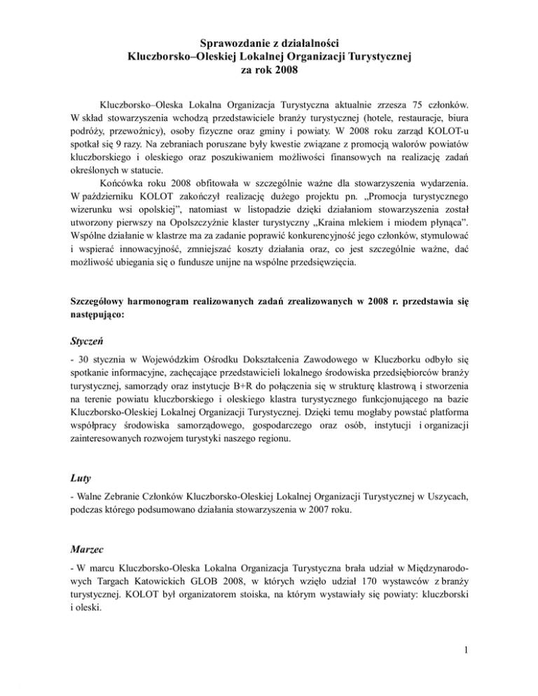 Sprawozdanie z działalności Kluczborsko–Oleskiej Lokalnej Organizacji Turystycznej za rok 2008 Kluczborsko–Oleska Lokalna Organizacja Turystyczna aktualnie zrzesza 75 członków. W skład stowarzyszenia wchodzą przedstawiciele branży turystycznej (hotele, restauracje, biura podróży, przewoźnicy), osoby fizyczne oraz gminy i powiaty. W 2008 roku zarząd KOLOT-u spotkał się 9 razy. Na zebraniach poruszane były kwestie związane z promocją walorów powiatów kluczborskiego i oleskiego oraz poszukiwaniem możliwości finansowych na realizację zadań określonych w statucie. Końcówka roku 2008 obfitowała w szczególnie ważne dla stowarzyszenia wydarzenia. W październiku KOLOT zakończył realizację dużego projektu pn. „Promocja turystycznego wizerunku wsi opolskiej”, natomiast w listopadzie dzięki działaniom stowarzyszenia został utworzony pierwszy na Opolszczyźnie klaster turystyczny „Kraina mlekiem i miodem płynąca”. Wspólne działanie w klastrze ma za zadanie poprawić konkurencyjność jego członków, stymulować i wspierać innowacyjność, zmniejszać koszty działania oraz, co jest szczególnie ważne, dać możliwość ubiegania się o fundusze unijne na wspólne przedsięwzięcia. Szczegółowy harmonogram realizowanych zadań zrealizowanych w 2008 r. przedstawia się następująco: Styczeń - 30 stycznia w Wojewódzkim Ośrodku Dokształcenia Zawodowego w Kluczborku odbyło się spotkanie informacyjne, zachęcające przedstawicieli lokalnego środowiska przedsiębiorców branży turystycznej, samorządy oraz instytucje B+R do połączenia się w strukturę klastrową i stworzenia na terenie powiatu kluczborskiego i oleskiego klastra turystycznego funkcjonującego na bazie Kluczborsko-Oleskiej Lokalnej Organizacji Turystycznej. Dzięki temu mogłaby powstać platforma współpracy środowiska samorządowego, gospodarczego oraz osób, instytucji i organizacji zainteresowanych rozwojem turystyki naszego regionu. Luty - Walne Zebranie Członków Kluczborsko-Oleskiej Lokalnej Organizacji Turystycznej w Uszycach, podczas którego podsumowano działania stowarzyszenia w 2007 roku. Marzec - W marcu Kluczborsko-Oleska Lokalna Organizacja Turystyczna brała udział w Międzynarodowych Targach Katowickich GLOB 2008, w których wzięło udział 170 wystawców z branży turystycznej. KOLOT był organizatorem stoiska, na którym wystawiały się powiaty: kluczborski i oleski. 1 Kwiecień - W kwietniu KOLOT brał udział w otwarciu sezonu rowerowego dla emerytów, w Parku Miejskim w Kluczborku. Wycieczki rowerowe kluczborskich seniorów są już tradycją. Od kilku lat od wiosny do jesieni „na dwóch kółkach” zwiedzają powiaty: kluczborski, oleski, namysłowski, opolski. Podziwiają ich zabytki, poznają ścieżki krajobrazowe i przyrodnicze. Stowarzyszenie KOLOT od początku patronuje tej inicjatywie. Maj - Udział w Międzynarodowych Targach Turystycznych „W Stronę Słońca”, które odbyły się na opolskim Rynku. KOLOT organizował stoisko wraz z powiatami: kluczborskim i oleskim. - Stowarzyszenie wraz z władzami powiatu kluczborskiego objęło patronatem „Międzypowiatowe spotkanie rowerzystów”. Lipiec - Przystąpiono do realizacji zadania publicznego „Promocja turystycznego wizerunku wsi opolskiej” powierzonego w ramach konkursu ofert do realizacji przez Zarząd Województwa Opolskiego. Głównym celem powyższego przedsięwzięcia była zmiana postrzegania wizerunku turystycznego wsi opolskiej, poprzez promocję usług noclegowych, żywieniowych, aktywnego zagospodarowania czasu wolnego i utrwalenia pozytywnego obrazu w pamięci odbiorców z pobytu na wsi opolskiej. Najważniejszym elementem projektu była akcja „Tutaj dobrze wypocząłem tego lata – polecam Tobie...”, polegająca na rekomendowaniu przez turystów innym odbiorcom miejsc na opolskiej wsi, w których wypoczywali. - Stowarzyszenie wraz ze Starostą Kluczborskim i Burmistrzem Kluczborka przystąpili do organizowania wycieczek objazdowych dla kluczborskich seniorów. W czasie wakacji zorganizowano łącznie 4 wycieczki, w trakcie których uczestnicy zwiedzili zabytki kultury i przyrody gmin powiatu kluczborskiego i oleskiego. Sierpień - Kontynuowano prace nad realizacją projektu „Promocja turystycznego wizerunku wsi opolskiej”. Uruchomiono stronę projektu www.opolskawies.pl i rozpoczęto działania promocyjne mające na celu rozpropagowanie akcji „Tutaj dobrze wypocząłem tego lata – polecam Tobie...”. Zostało zorganizowanych ponadto pięć wyjazdów studyjnych, podczas których zebrano opinie od klientów i oferentów na temat oferowanych usług turystycznych. Na bieżąco monitorowano przebieg akcji poprzez telefoniczny kontakt z właścicielami obiektów, na które oddawano głosy. Wrzesień - Dzięki wsparciu finansowym Starostwa Powiatowego w Kluczborku i Starostwa Powiatowego w Oleśnie wznowiono cieszący się ogromnym zainteresowaniem folder „Szlakiem Kościółków Drewnianych w Powiecie Kluczborskim i Szlakiem Kościółków Drewnianych w Powiecie 2 Oleskim”. Tym razem publikacja została wydana w nakładzie 4 tys. egzemplarzy. - Stowarzyszenie uczestniczyło w wojewódzkich Dożynkach w Byczynie, gdzie wraz z Bankiem Spółdzielczym z Wołczyna oraz jednym z gospodarstw agroturystycznych aktywnie promowało walory powiatów: kluczborskiego i oleskiego. W trakcie dożynek KOLOT przeprowadził kwestę pieniężną, z której środki zostały przeznaczone na pomoc ofiarom trąby powietrznej w powiecie strzeleckim. Październik - Udział w XIX Międzynarodowych Targach Regionów i Produktów Turystycznych TOUR SALON 2008 w POZNANIU – największych targach turystycznych w Polsce. W targach uczestniczyło ponad 750 wystawców z czterdziestu krajów świata, nawet tak egzotycznych jak Peru, Indie, Kolumbia, Mongolia, RPA czy Wenezuela. Zwiedzający mogli zapoznać się z najnowszą ofertą i atrakcjami turystycznymi naszego regionu, które