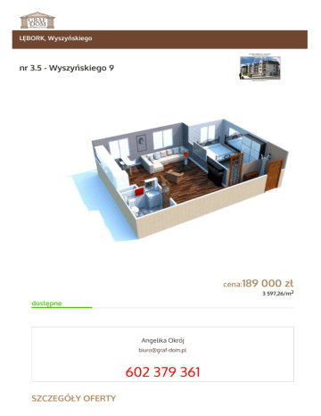 LĘBORK, Wyszyńskiego nr 3.5 - Wyszyńskiego 9 cena:189 dostępne Angelika Okrój [email protected] 602 379 361 SZCZEGÓŁY OFERTY 000 zł 3 597,26/m2 SYMBOL GRF-MS-11 NUMER 3.5 LICZBA POKOI 2 PIĘTRO 3 POWIERZCHNIA 52,54 m² POWIERZCHNIA UŻYTKOWA 52,49 m² RODZAJ BUDYNKU blok ILOŚĆ PIĘTER W BUDYNKU 3 GARAŻ nie STAN LOKALU deweloperski OKNA PCV 3 szyby BALKON jest ROK BUDOWY 2017 PLAC ZABAW nie OGRZEWANIE Centralne miejskie POKOJE POWIERZCHNIA 38,35 m2 PODŁOGA posadzka maszynowa KUCHNIA PODŁOGA posadzka maszynowa TYP KUCHNI aneks kuchenny ŁAZIENKA OPIS Na sprzedaż nowe mieszkanie w stanie deweloperskim w nowopowstającym budynku wielorodzinnym przy ul. Wyszyńskiego 9 w Lęborku. Lokal o powierzchni użytkowej 54,49 m2 mieści się na poddaszu/III piętrze. Mieszkanie składa się z komfortowego salonu o powierzchni 26,59 m2, sypialni, łazienki oraz przedpokoju. Do lokalu przynależy piwnica oraz miejsce postojowe na terenie działki do wyłącznego korzystania.